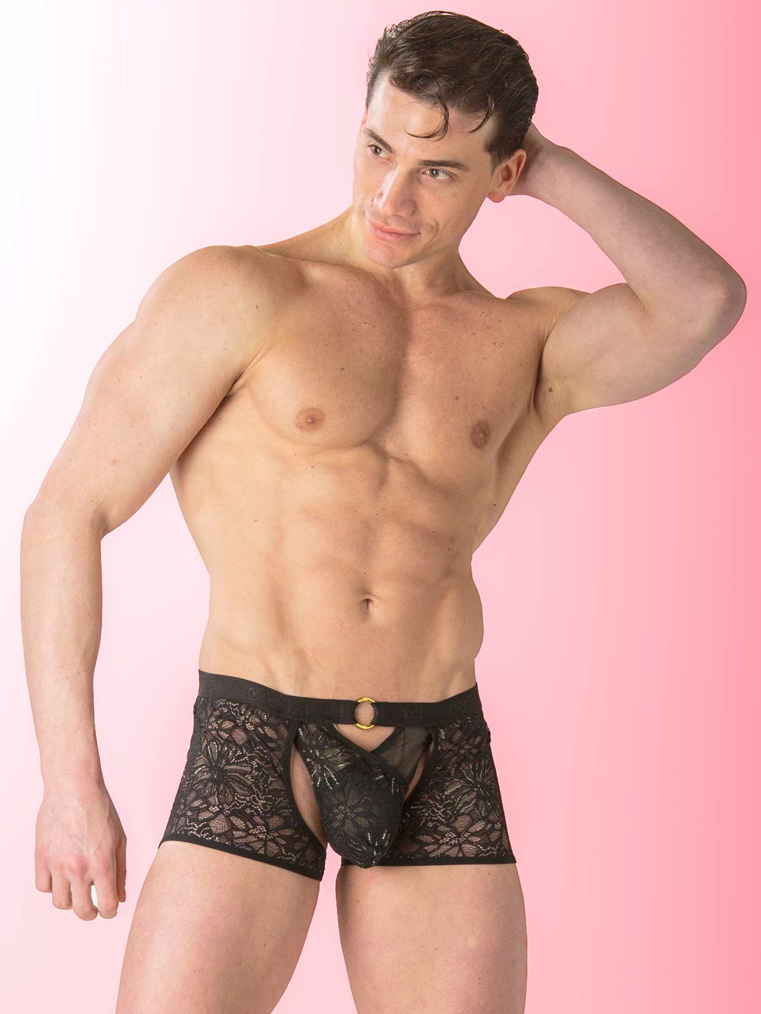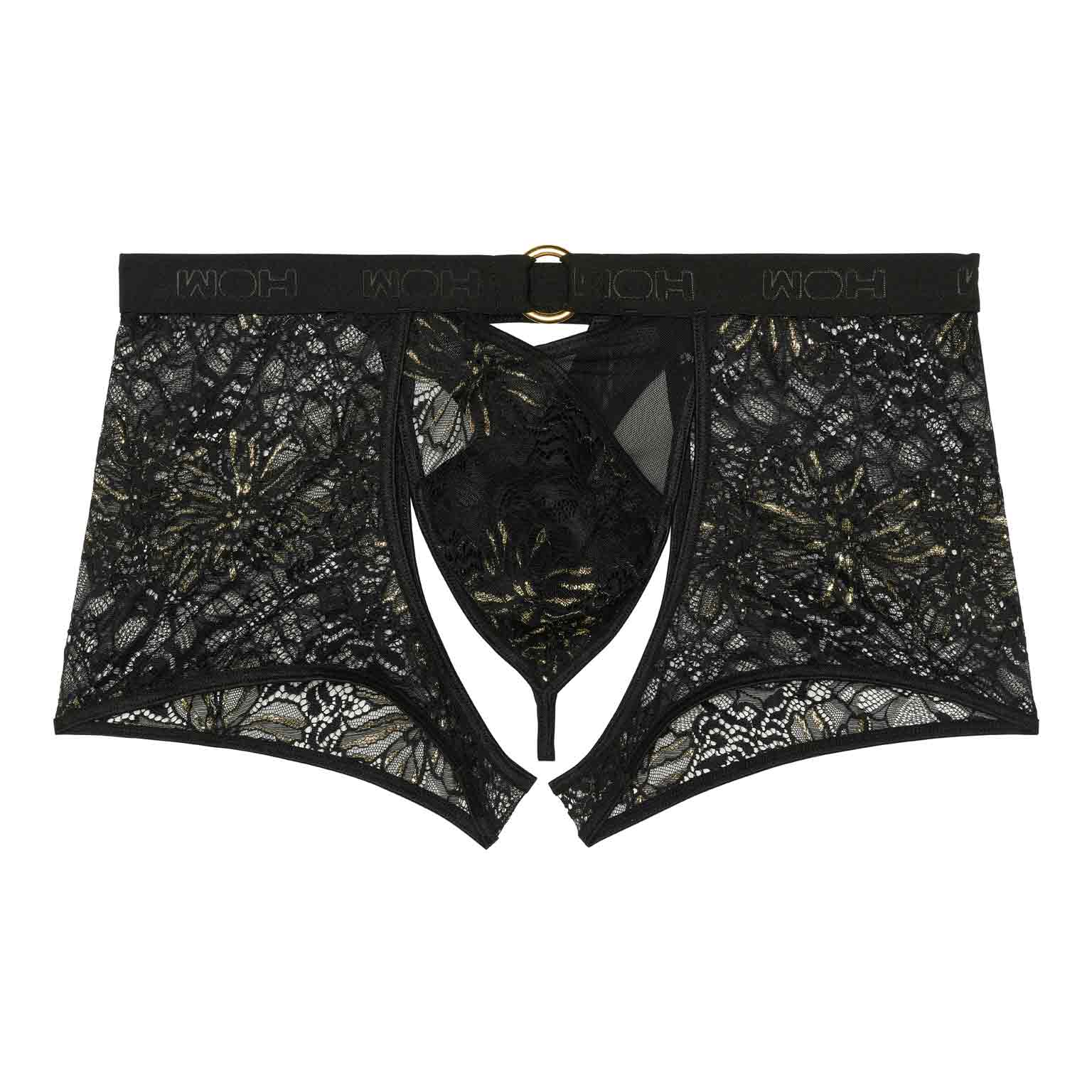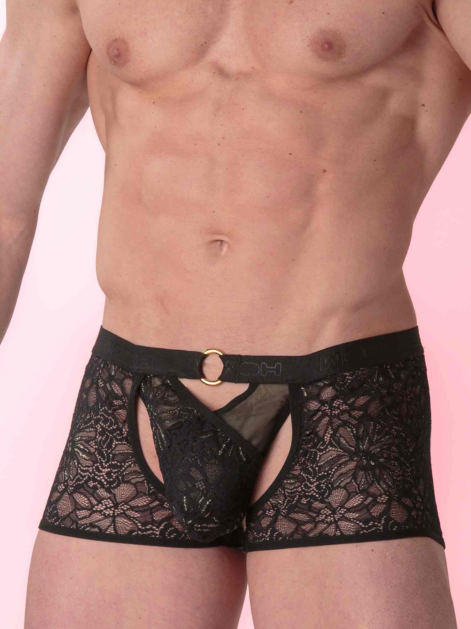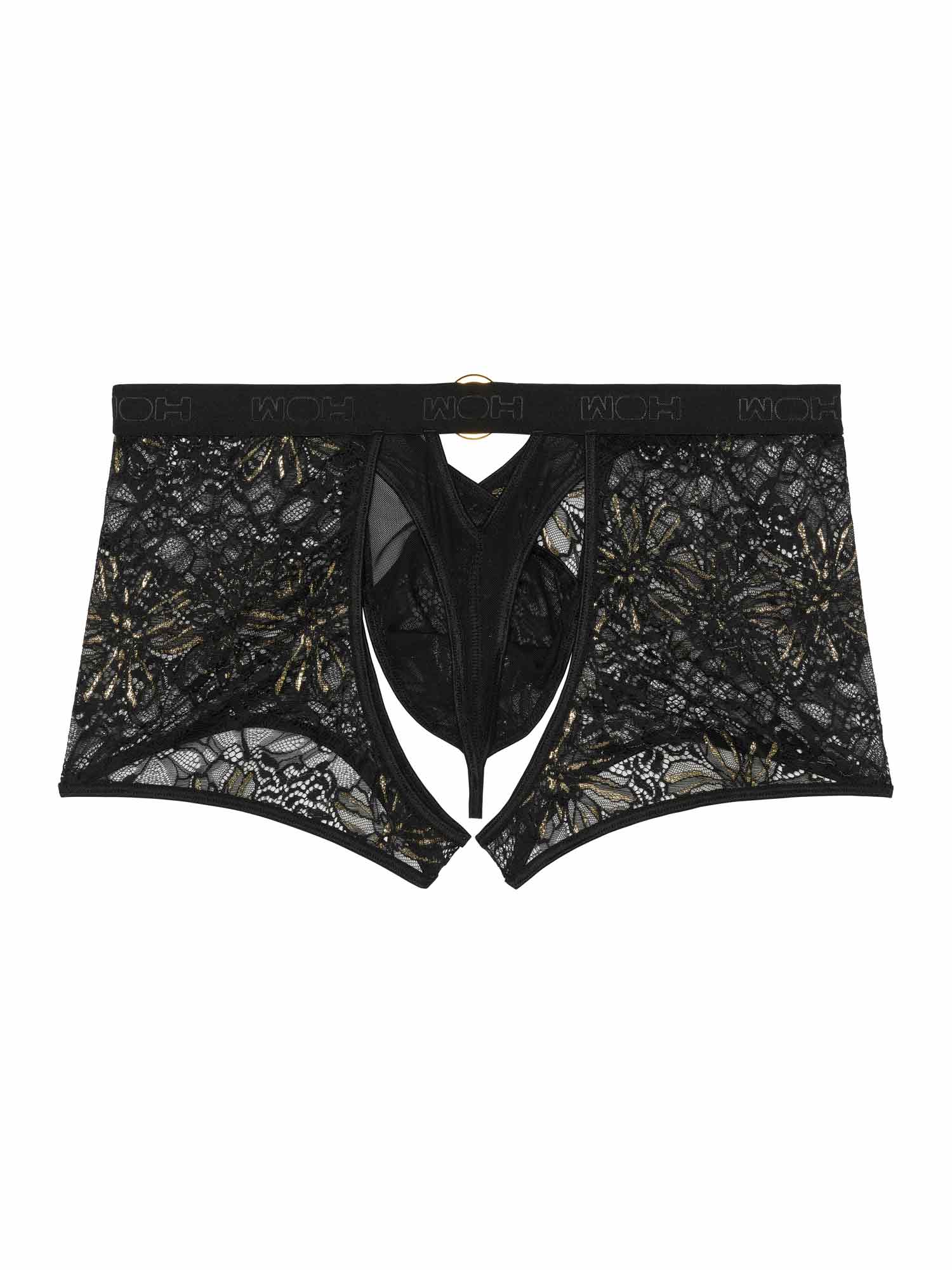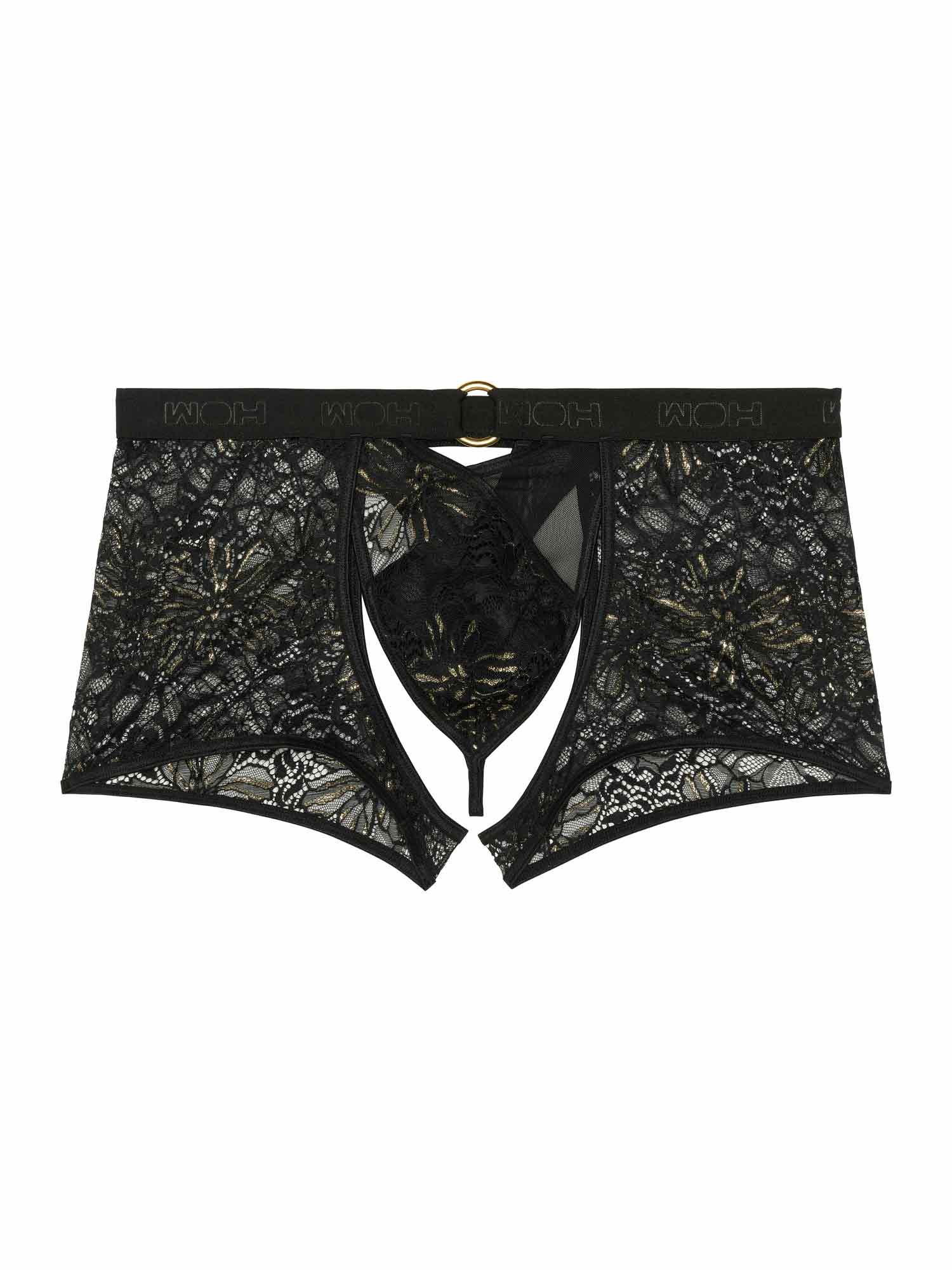 De Pure Seduction Boxer String van WOH is een boxer en string in één. Een gedurfd statement in de wereld van de herenlingerie. De boxer string is gemaakt van zwart kant met gouden accenten en doorschijnend tule, vormt deze boxer een perfecte mix van stijl en verleiding. De uitgesneden voorkant met goudkleurige ring zorgt voor een speels accent, terwijl de achterkant volledig open is met een string voor een extra dosis erotiek.