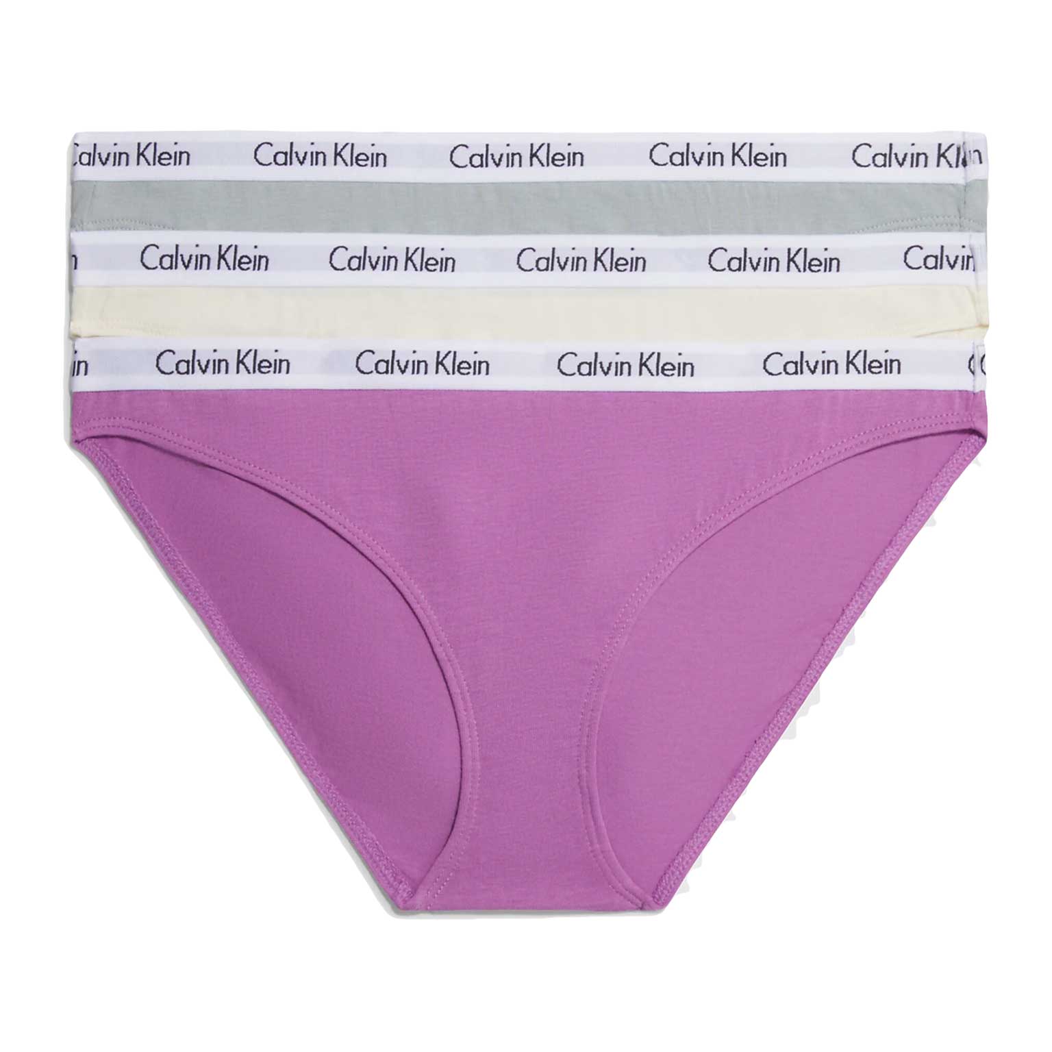 3 Comfortabele dames slips van Calvin Klein in een multipack, gemaakt van zacht ventilerend stretch katoen in lila, wit en melange grey, voor de afwisseling met op elastische heupband het Calvin Klein logo.