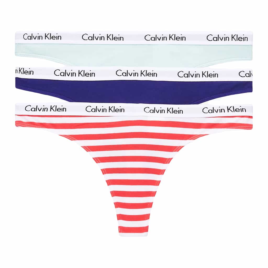 Drie dames strings van Calvin Klein in een voordeelpak, gemaakt van zacht ventilerend stretch katoen in diverse kleuren, voor de afwisseling met op elastische heupband het Calvin Klein logo.