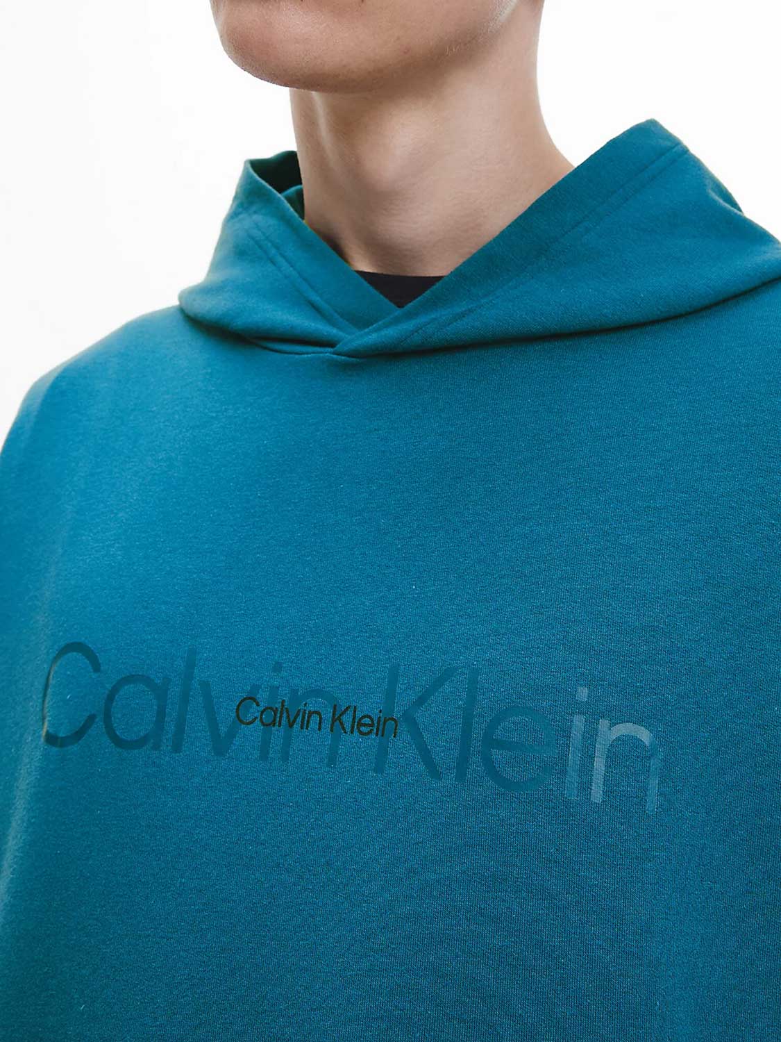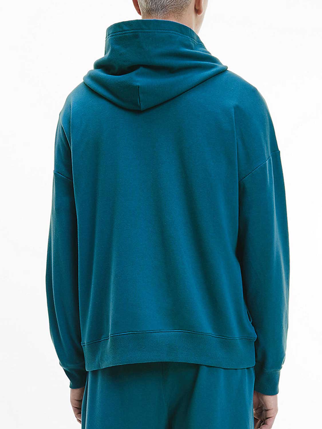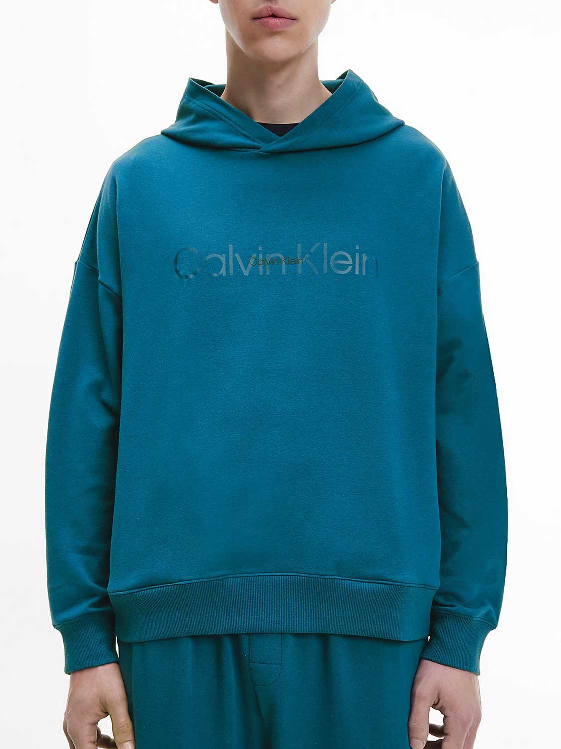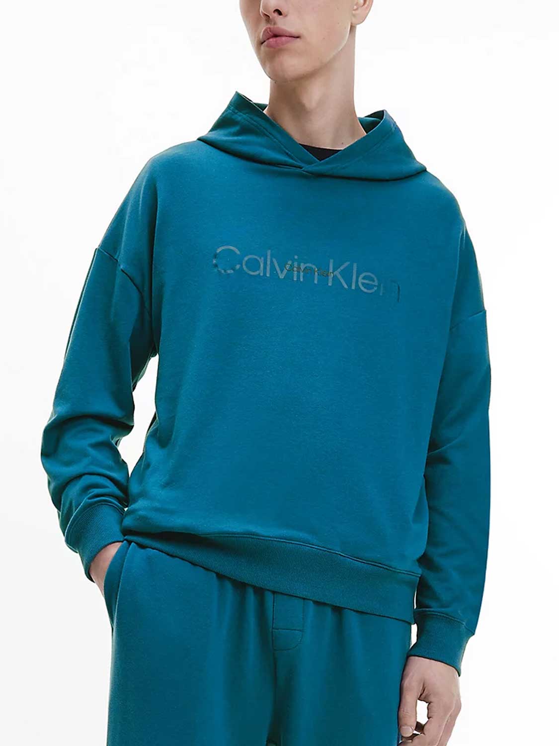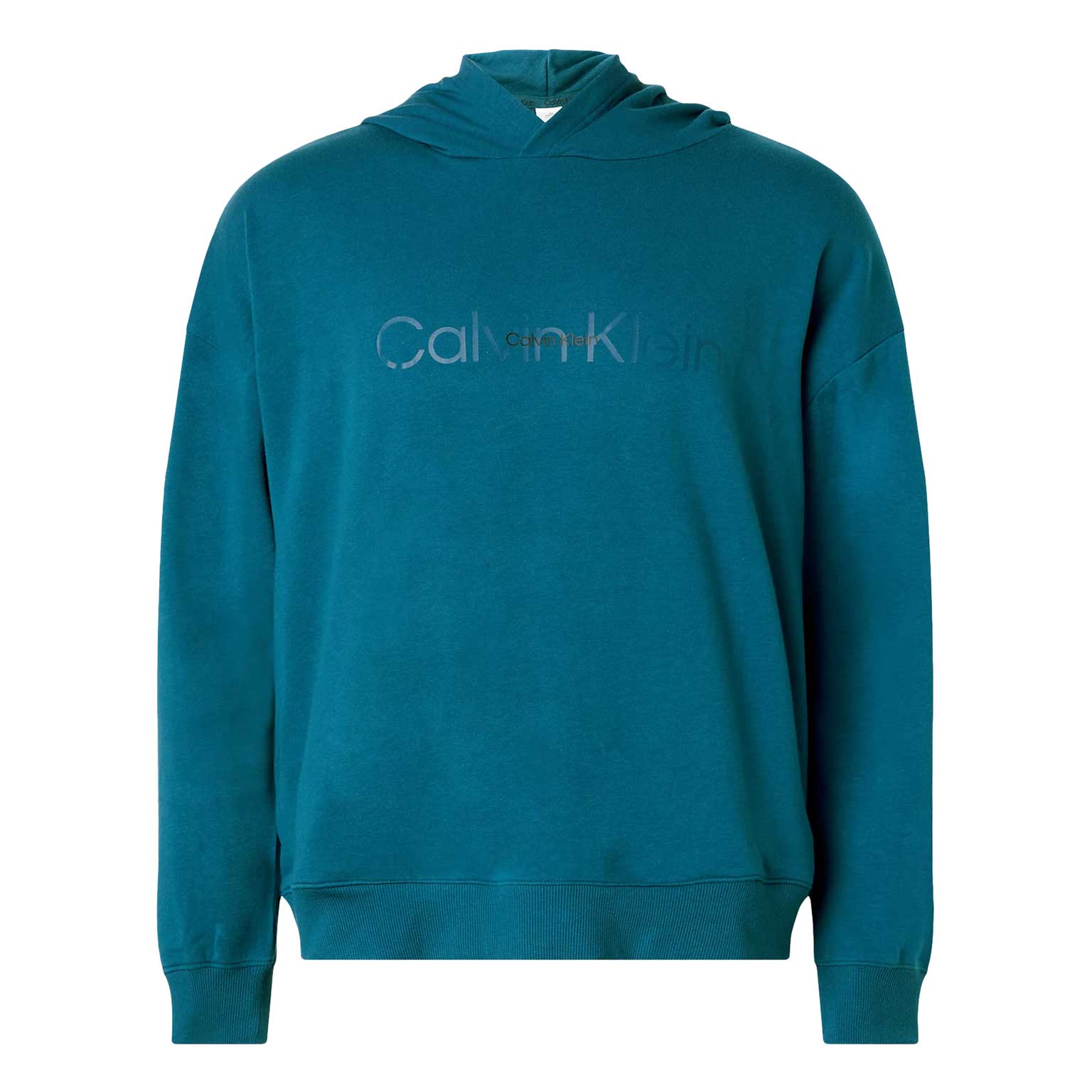 Lounge sweater uit de Modern Cotton Lounge collectie om heerlijk in te ontspannen. Deze lounge sweater valt lekker ruim en heeft lage schouders, zodat deze nonchalant langs je lichaam valt. De stof is gemaakt van een polyester/katoen mix zodat deze zacht op de huid ligt De capuchon heeft geen trekkoord voor een extra loungevoel. De sweater is uitgevoerd in de kleur aqua en heeft in het groot het Calvin Klein logo op de borst.