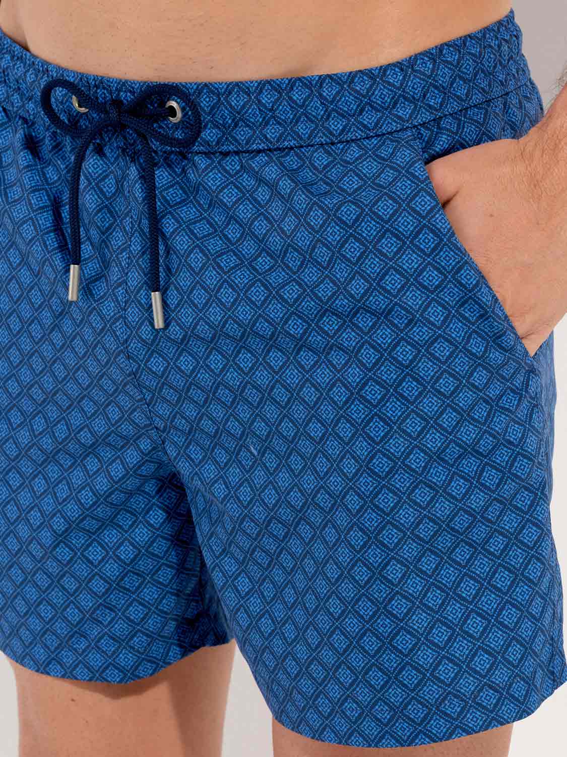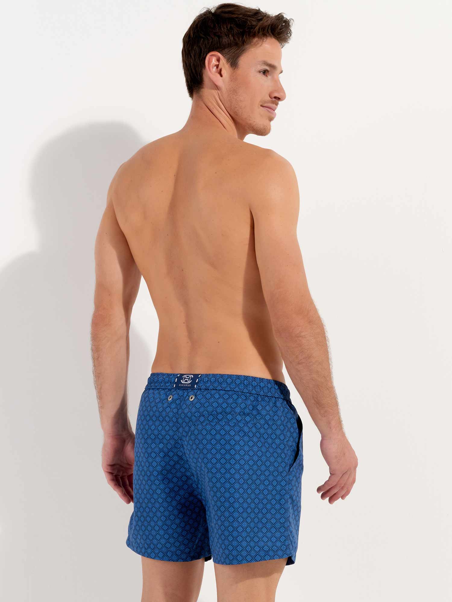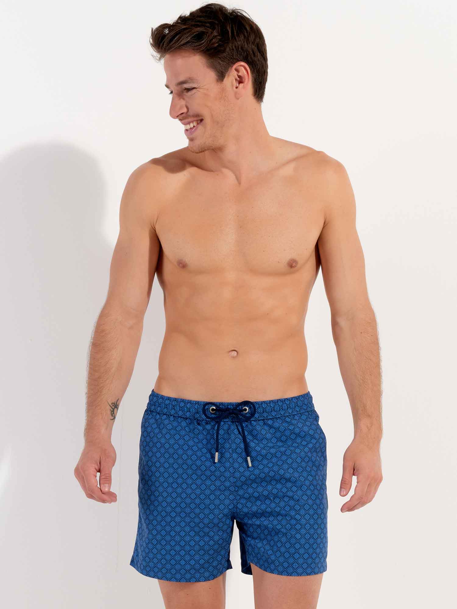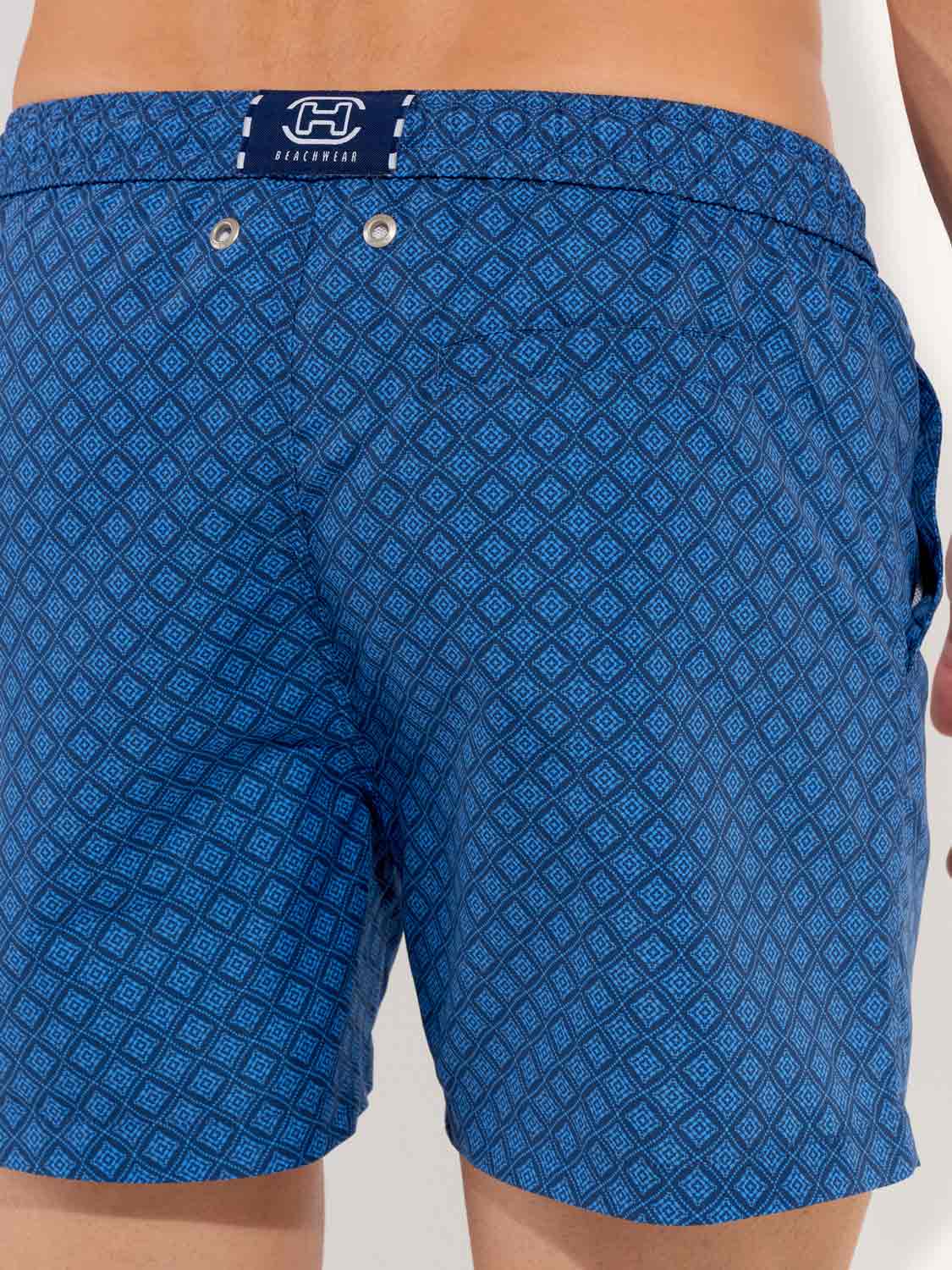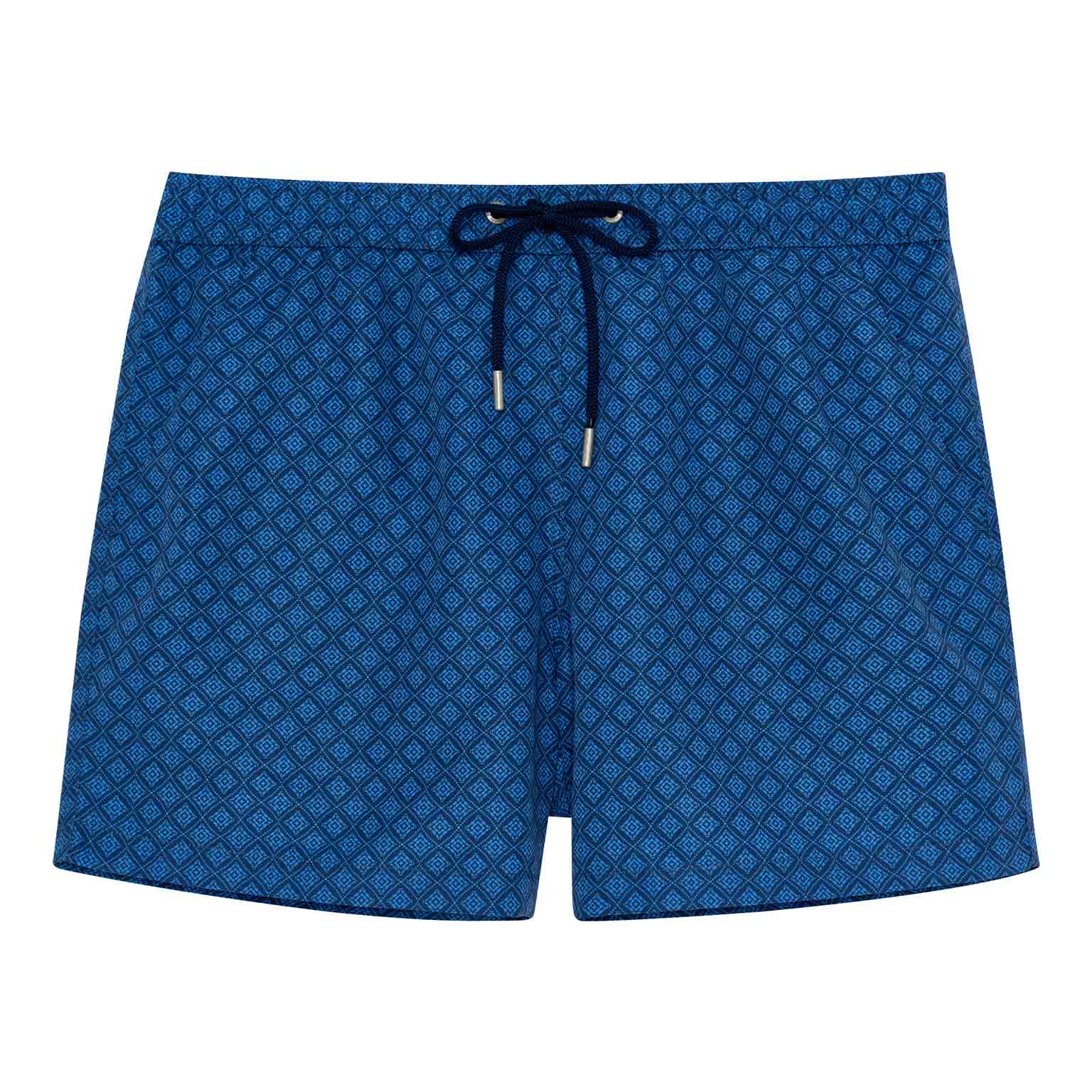 De Hendaya - Beach Boxer maakt deel uit van de HOM zomercollectie zwemkleding. Elegant dasmotief met lichtblauwe ruitjes op een marineblauwe achtergrond. De Beach Boxer heeft zakken in de zijnaden aan zowel de linker- als rechterkant en een binnenvoering voor extra comfort en ondersteuning. Het trekkoord in de tailleband zorgt ervoor dat je de Beach Boxer perfect kunt afstellen op jouw maat, zodat je met vertrouwen een verfrissende duik kunt nemen. De stof is van polyester, waardoor de Beach Boxers snel drogen. Ideaal voor op het strand of om daarna door te gaan naar het terras.