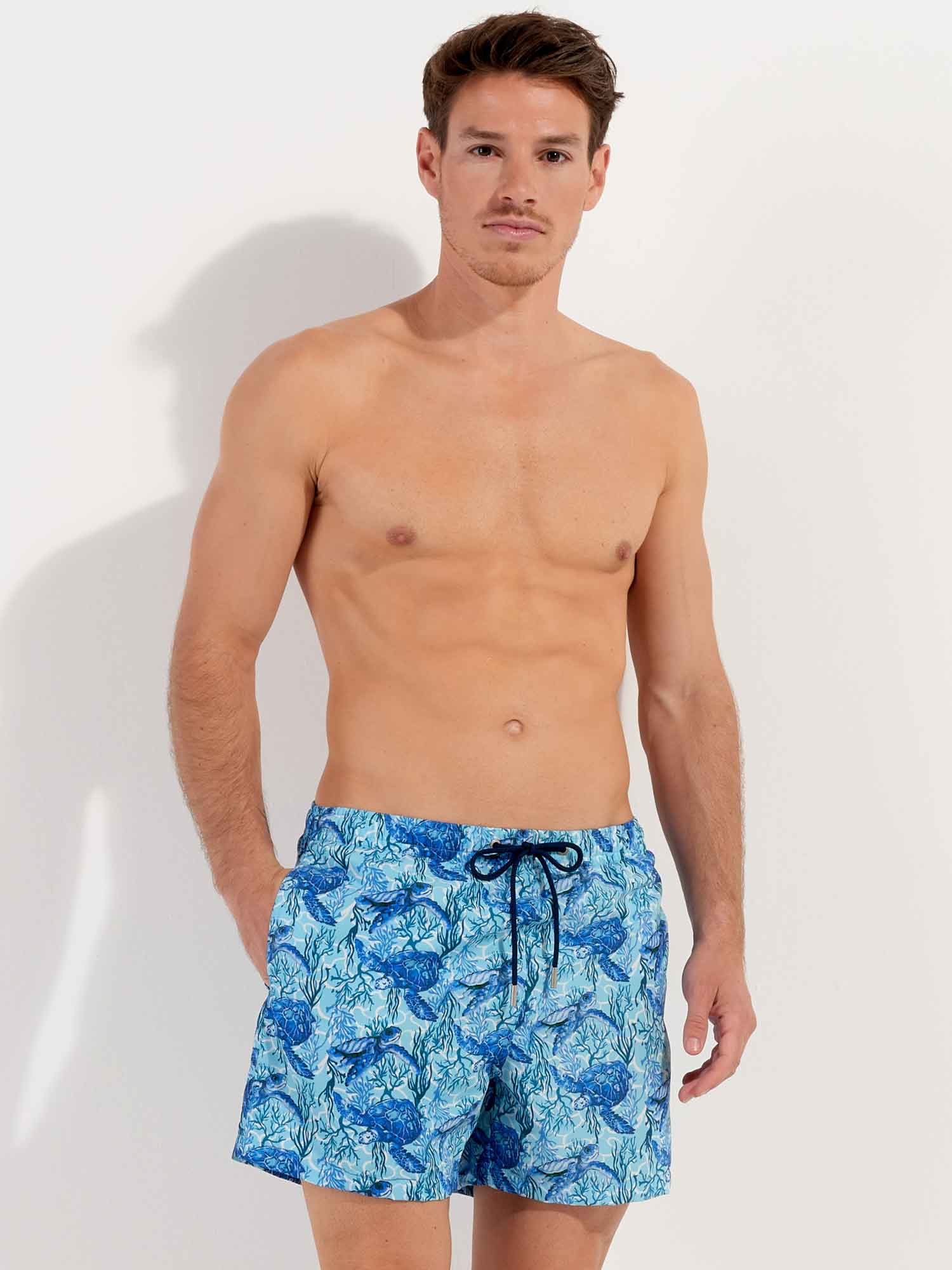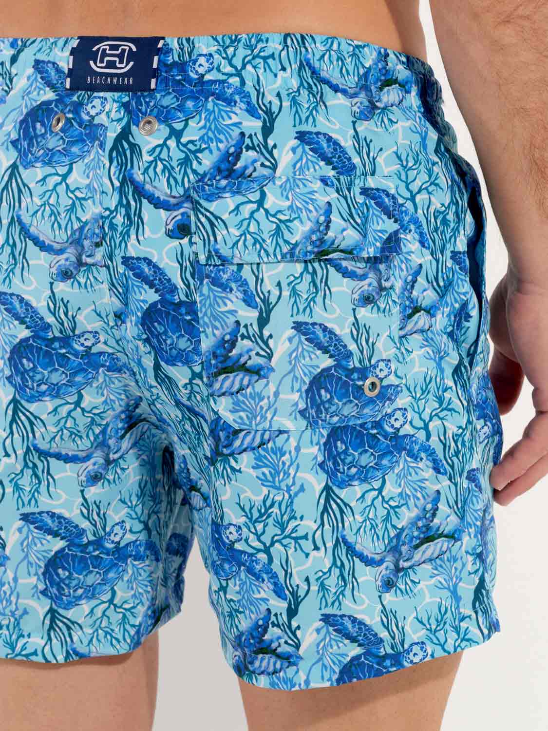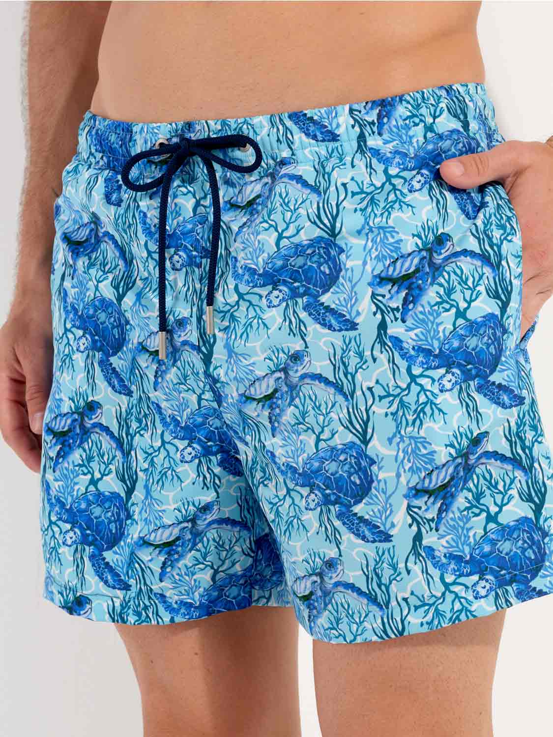 De Tartane - Beach Boxer heeft een verfrissende dierenprint uit de onderwaterwereld. Blauwe schildpadden op een turquoise achtergrond sieren dit aquatische ontwerp dat doet denken aan de zeebodem van de Caraïbische eilanden. De schildpad is een symbool van wijsheid, moed en doorzettingsvermogen. De Beach Boxer heeft steekzakken aan de linker- en rechterzijde in de naad en bevat een binnenvoering voor extra comfort en ondersteuning. Het trekkoord in de tailleband maakt het mogelijk om de Beach Boxer perfect af te stellen op jouw maat, zodat je met vertrouwen een verfrissende duik kunt nemen. De stof is gemaakt van polyester, waardoor de Beach Boxer snel droogt. Ideaal voor op het strand of op het terras daarna.