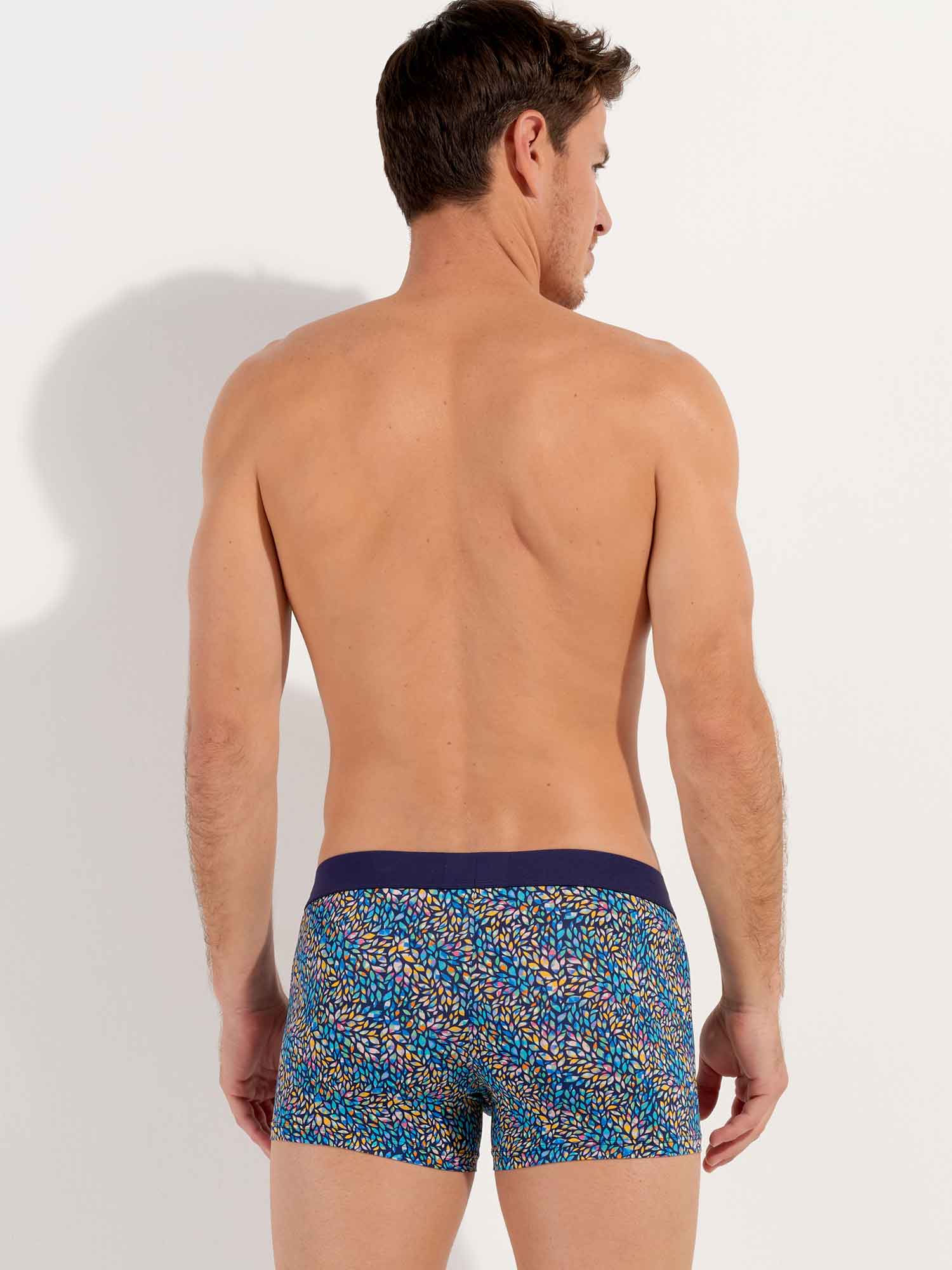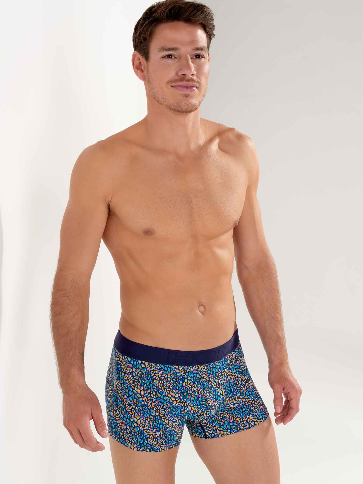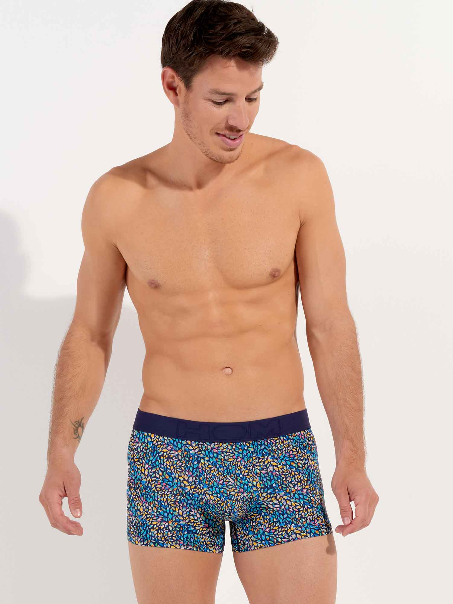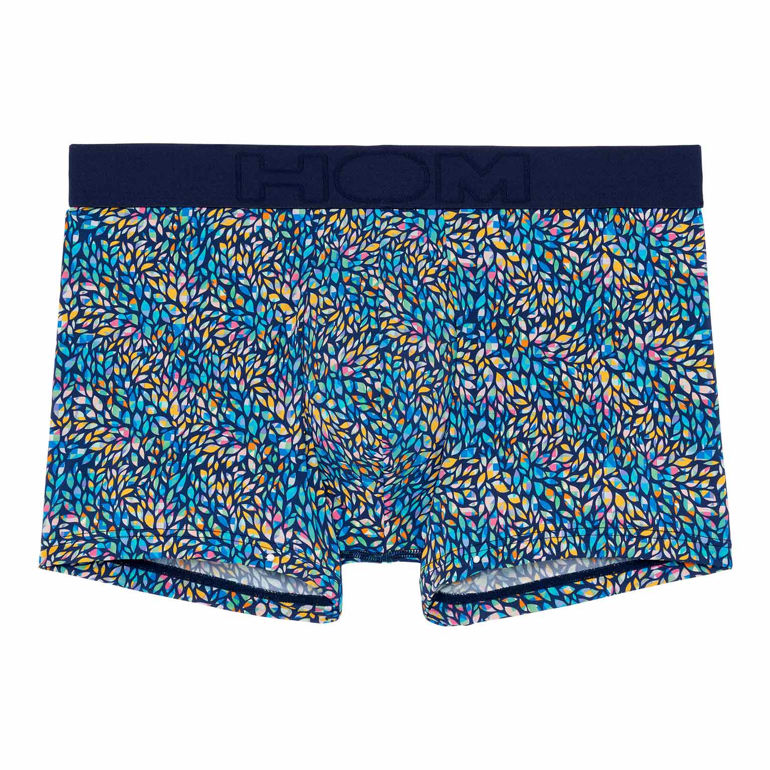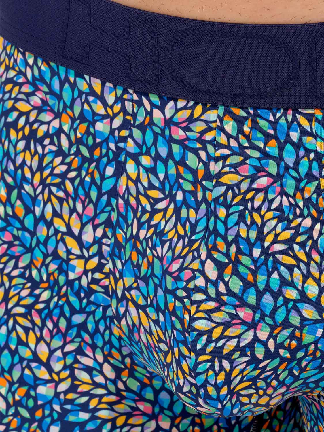 De Buddy - Boxer Briefs is gemaakt van een comfortabele microfiber. Deze heren boxer heeft een print met klleine veelkleurige blaadjes ingelegd met geometrische motieven op een marineblauwe achtergrond. De Buddy heeft een elastische heupband gemaakt van katoen met daarop het HOM Logo in ton sur ton.