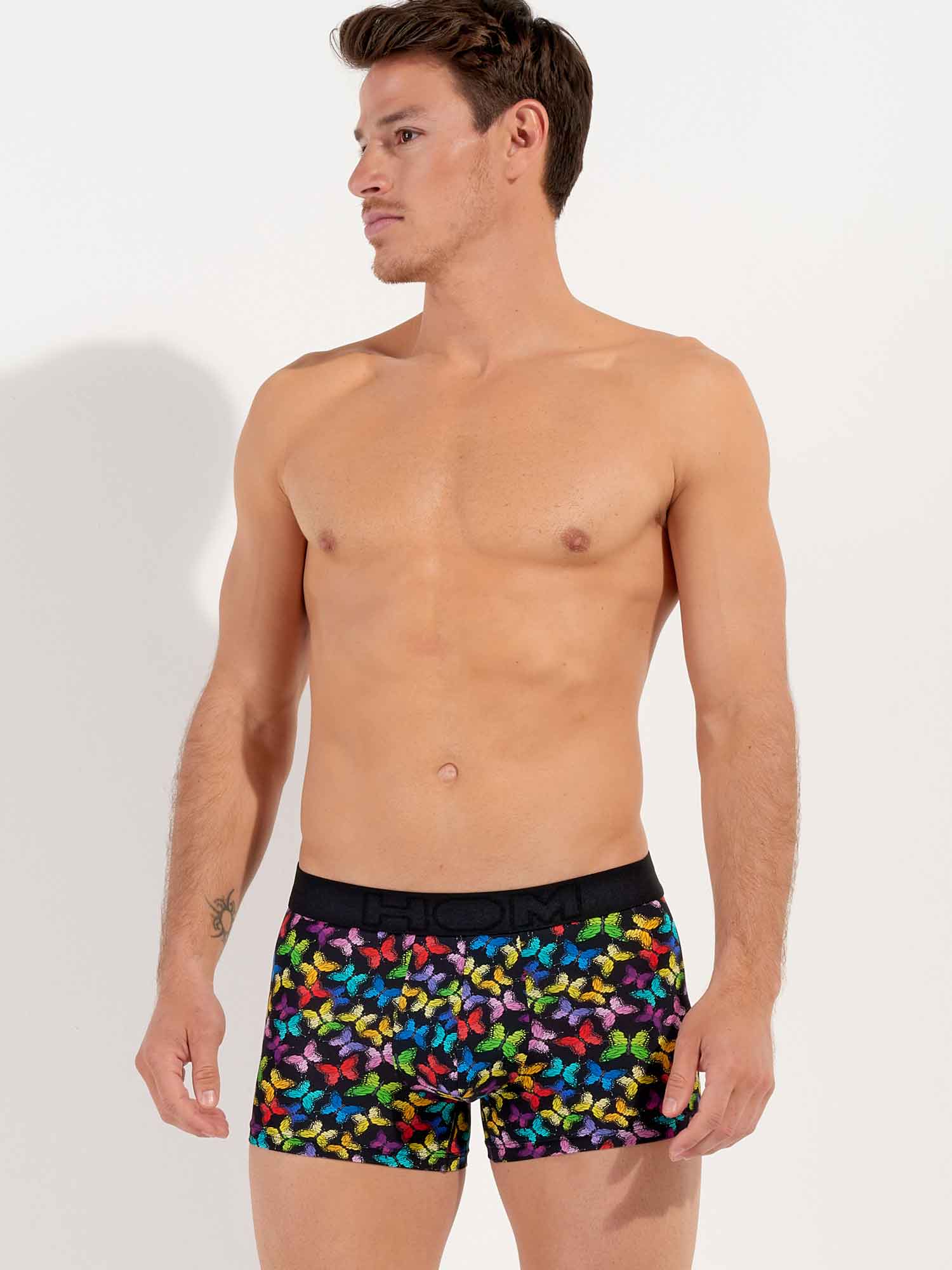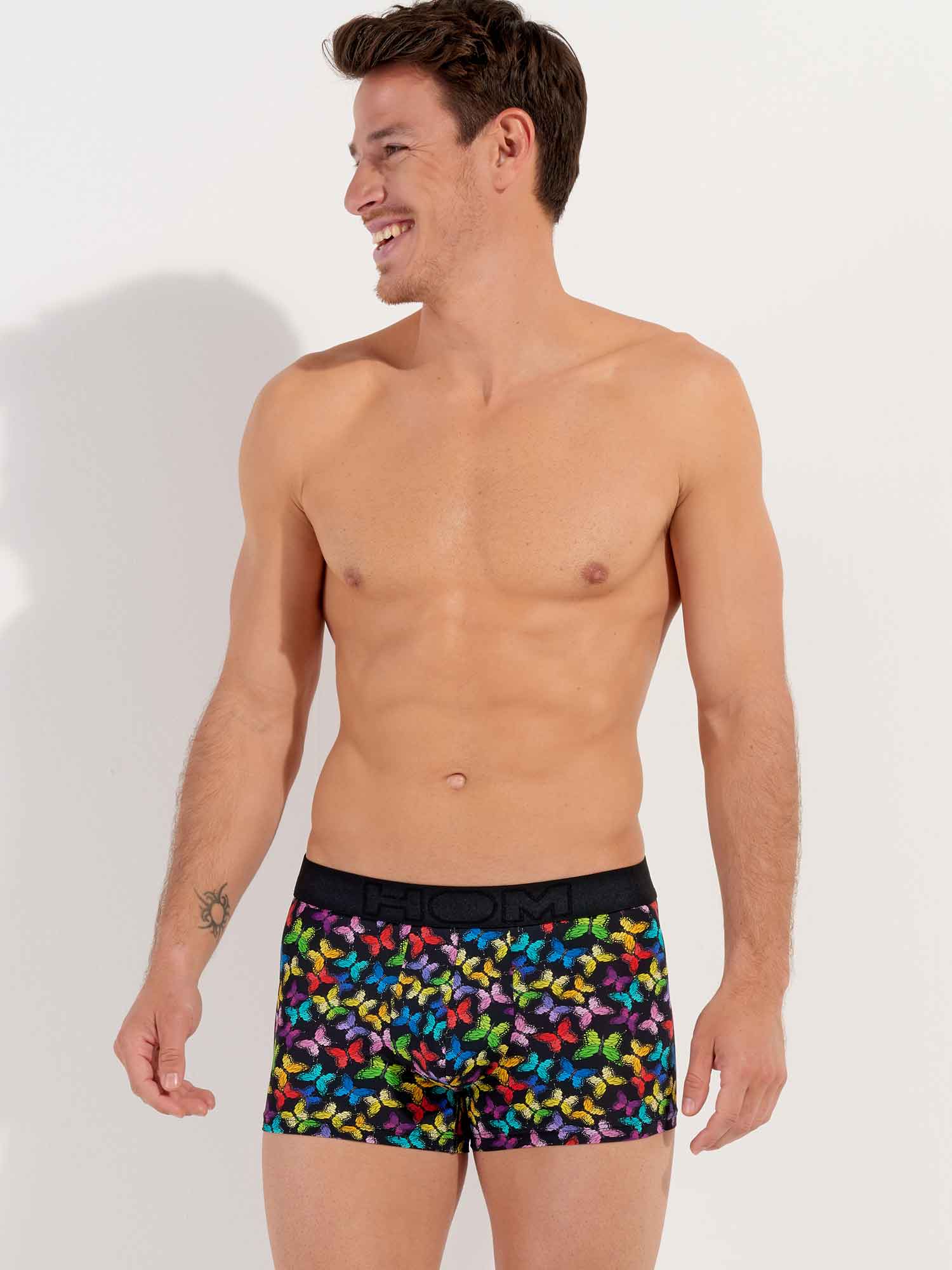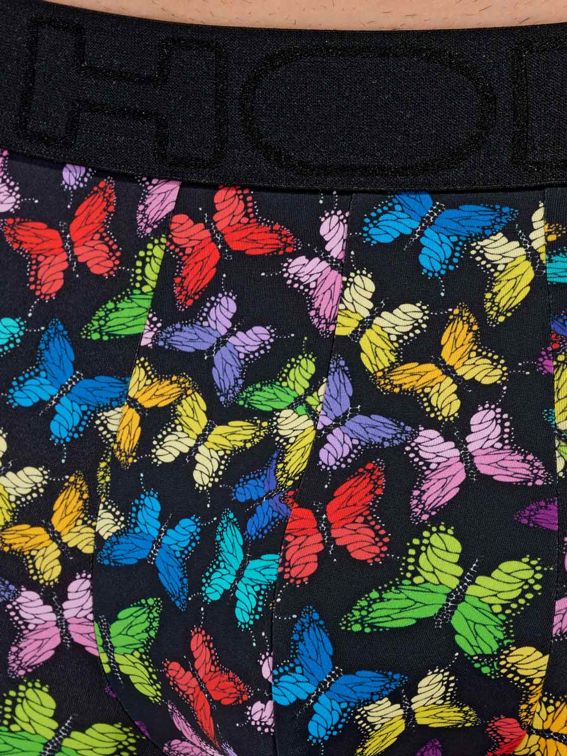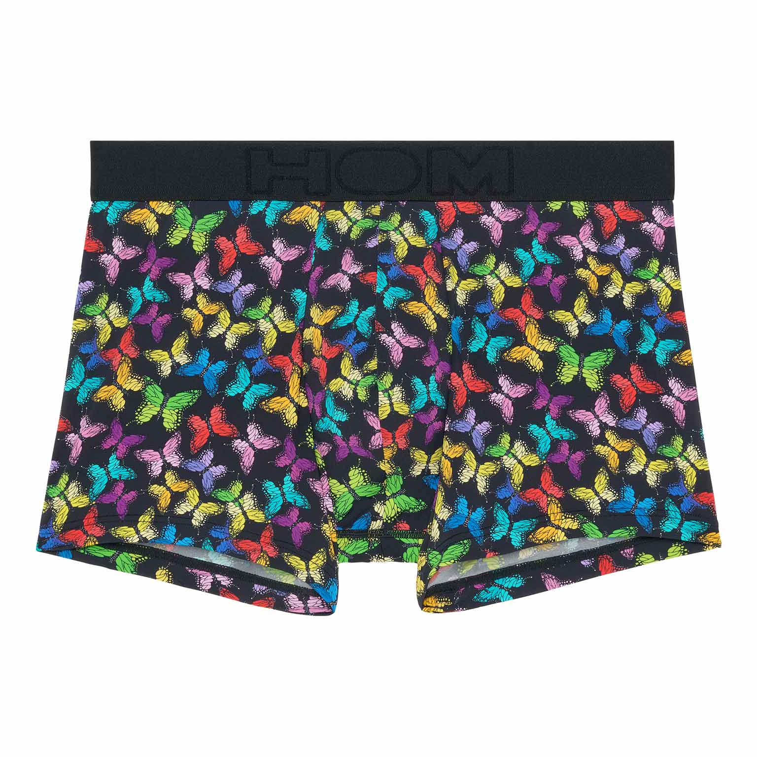 De Butterfly - Boxer Briefs is gemaakt van een comfortabele microfiber. De heren boxer heeft een opvallende figuratieve print met kleurrijke vlinders op een zwarte achtergrond. De Butterfly heeft een elastische heupband gemaakt van katoen met daarop het HOM Logo in ton sur ton.