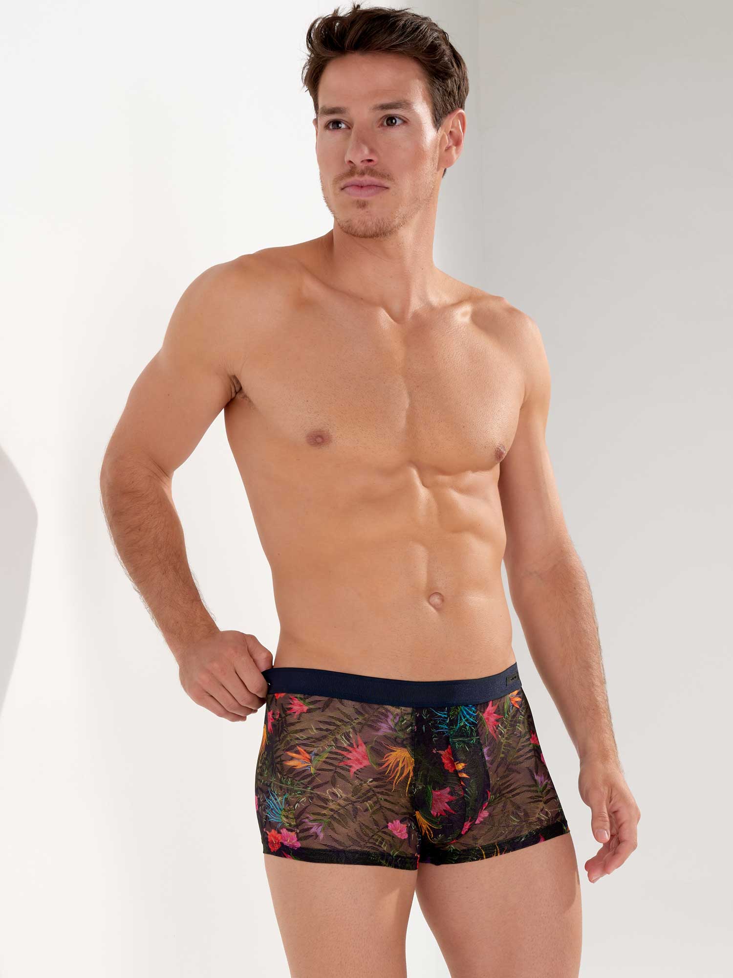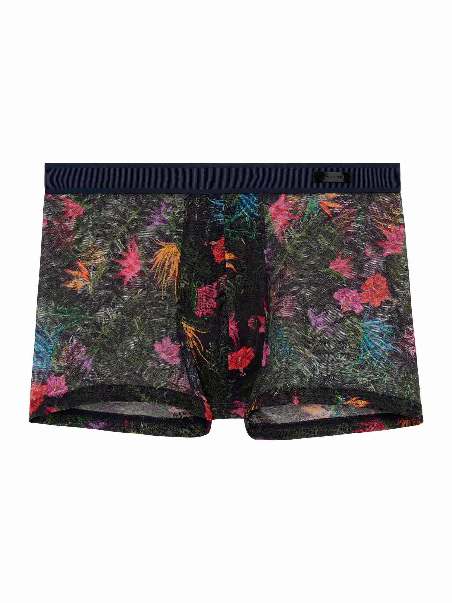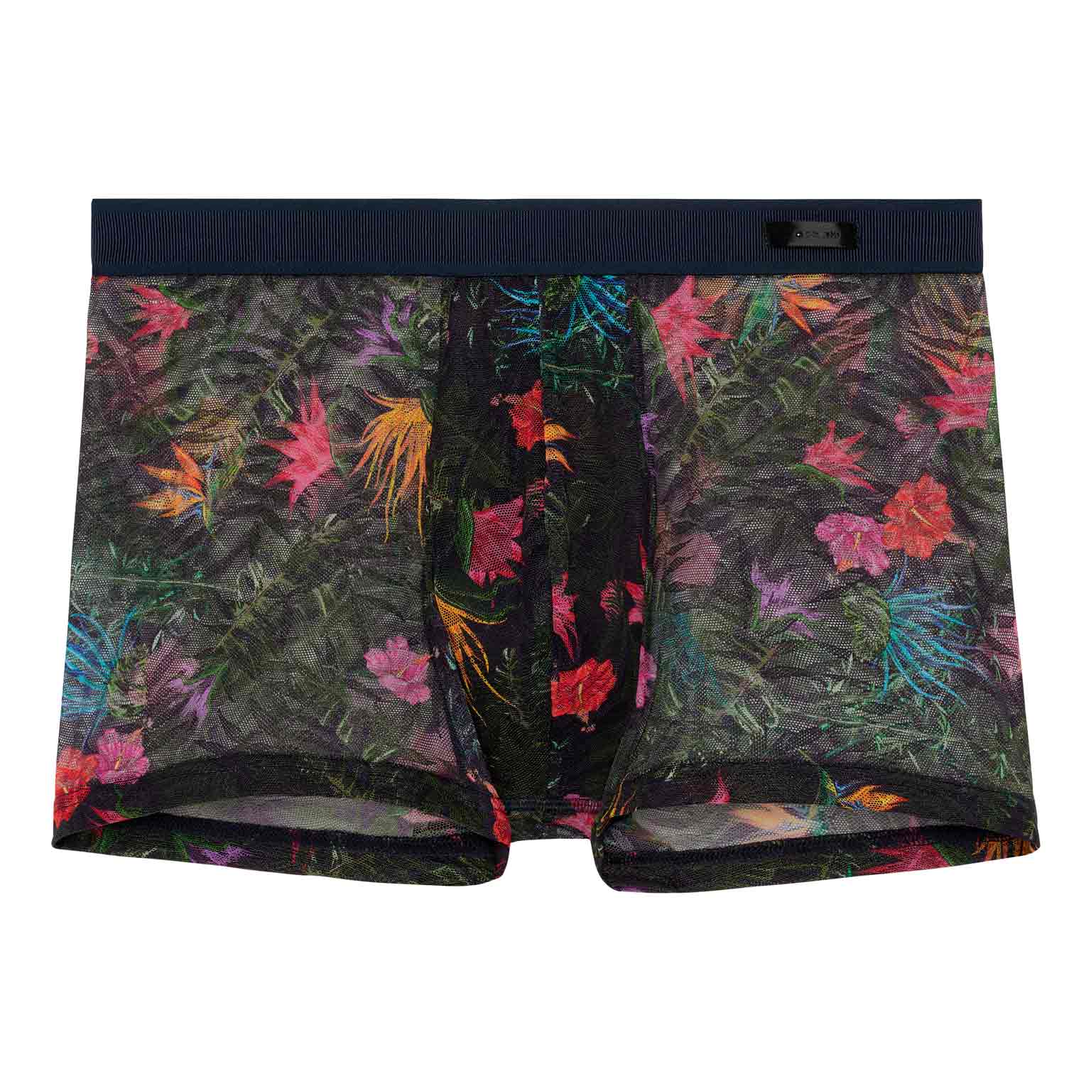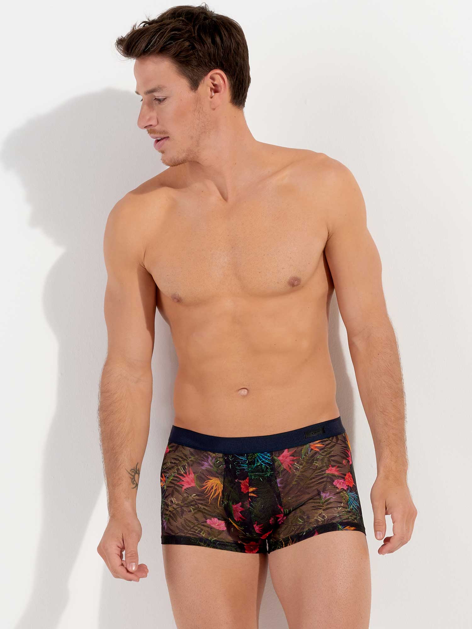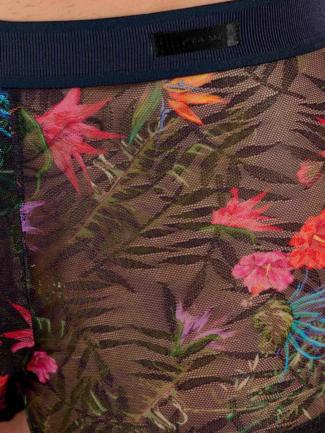 De Exotica - Boxer Brief is een uitdagend en tropisch element in de HOM Temptation lijn. De Exotica is gemaakt van een sierlijke mesh met een prachtig kleurrijk patroon met rode, gele en roe tropische plantmotieven op een achtergrond van groene bladeren. De transparante stof speelt op erotische wijze met de huid voor een sensueel effect. De pouch is gevoerd, waardoor deze niet doorschijnend is.