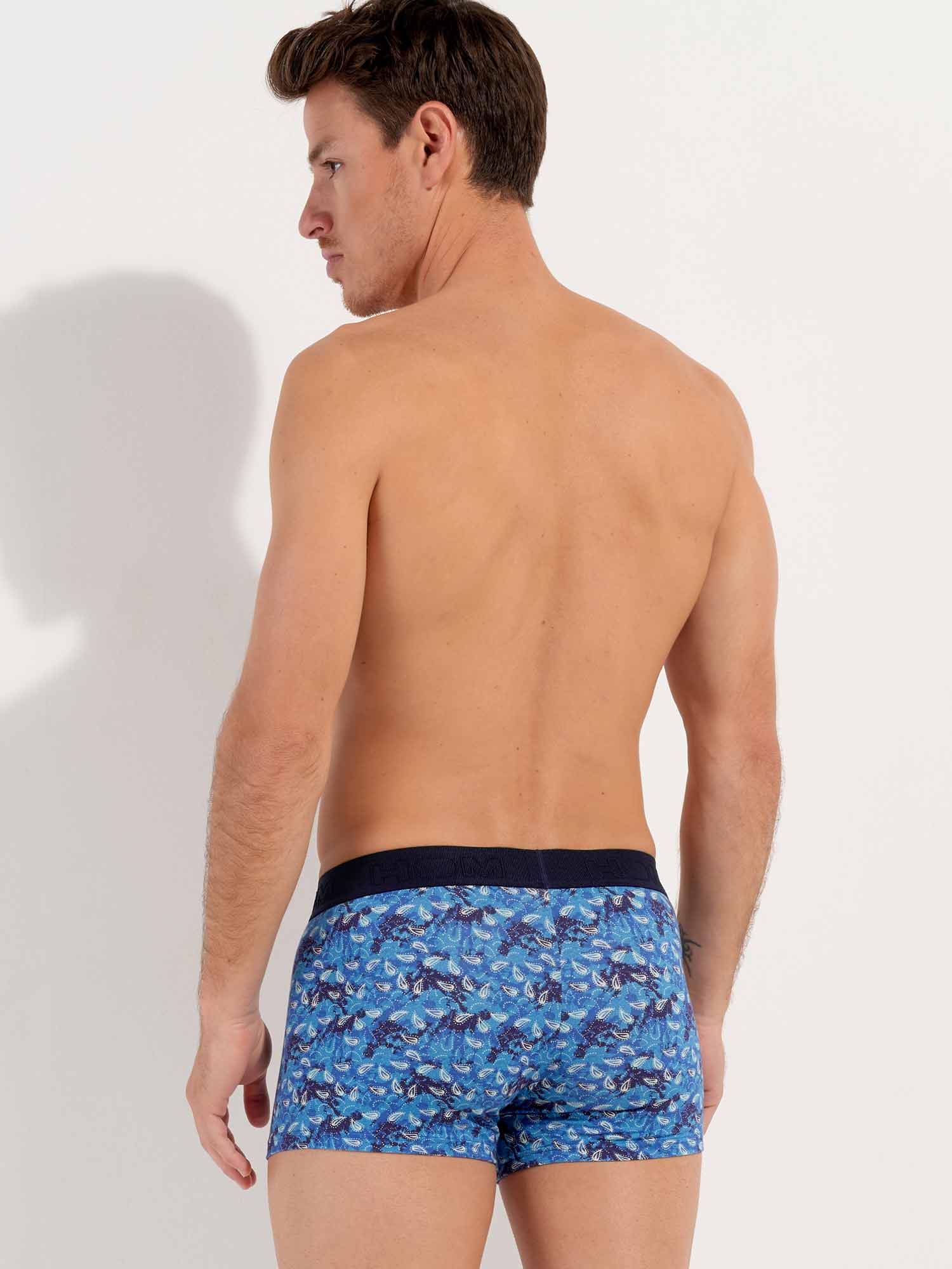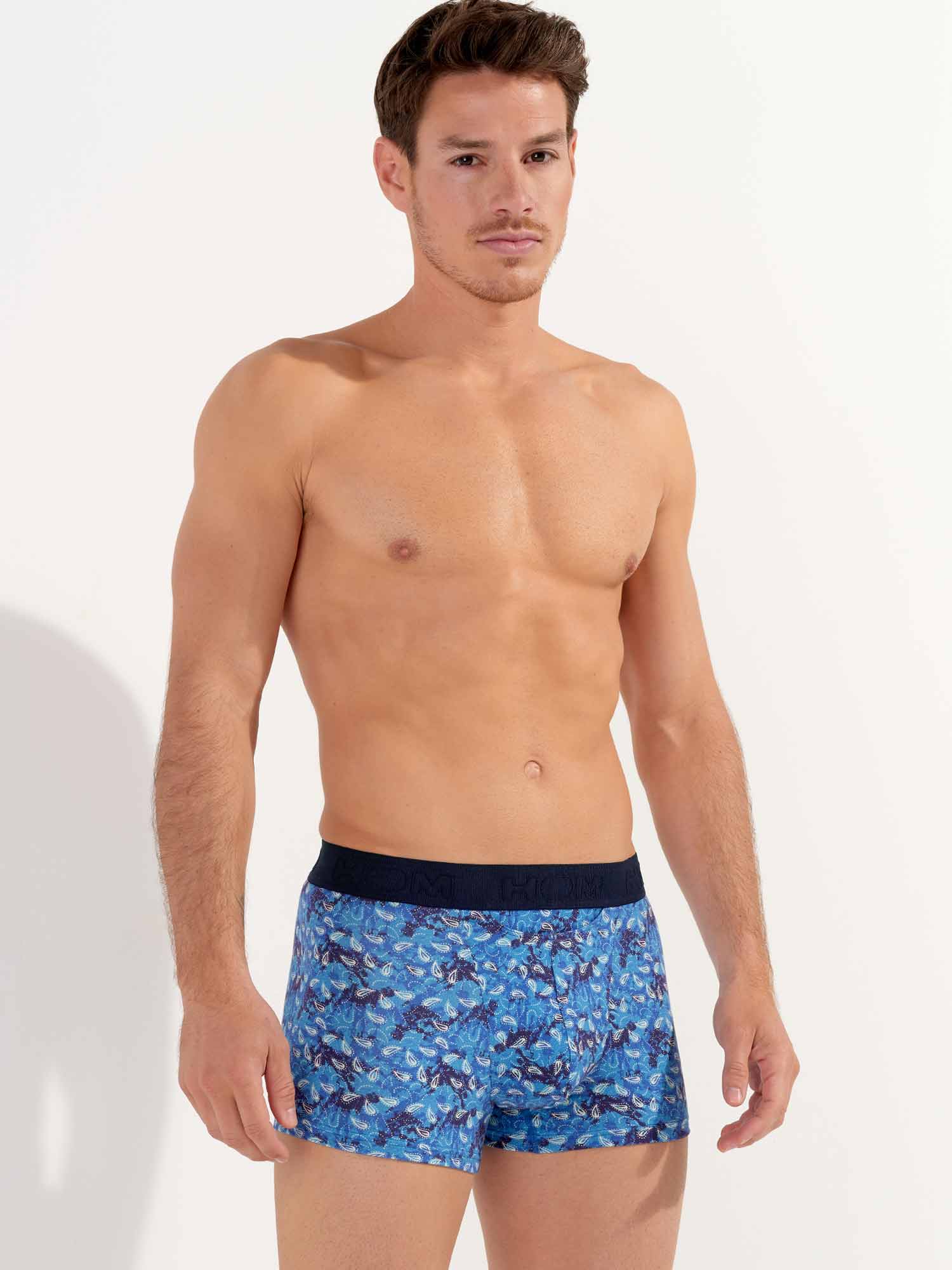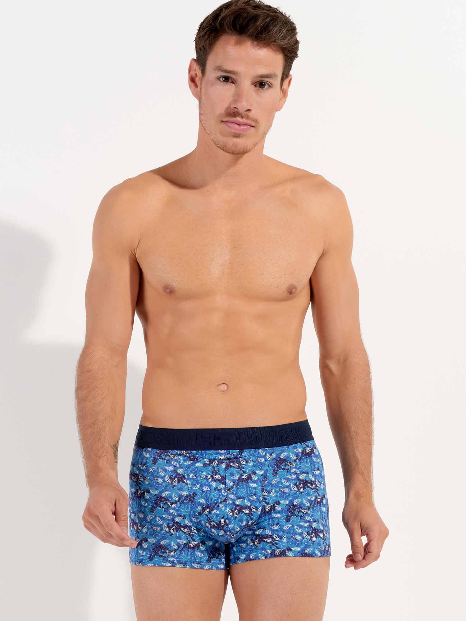 De Vibe - HO1 Boxer Briefs is gemaakt van katoenmodal en uitgevoerd met de 'horizontale opening', de speciale gulp voor extra gemak, waar HOM bekend om staat. Deze heren boxer heeft een vintage print met witte paisleys op een blauwe achtergrond. De Vibe heeft een elastische heupband in marine blauw, uitgevoerd met een rib. De heupband is voorzien van het HOM logo in ton sur ton.
