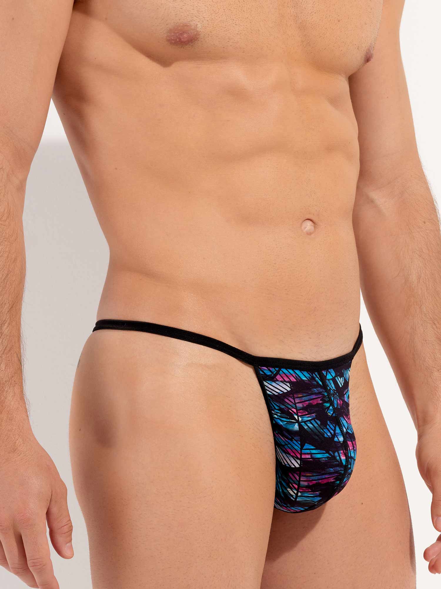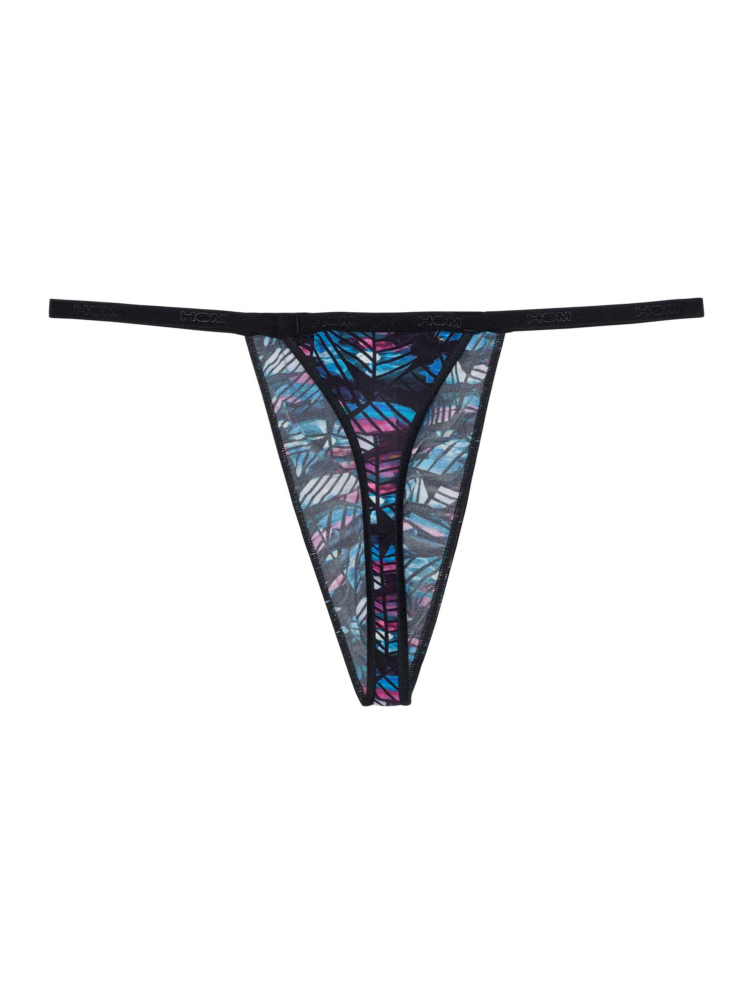 De Blackrock - G-string is een sensuele toevoeging aan de HOM collectie. Deze G-string is gemaakt van dezelfde stof als de reguliere Plumes string, een semi-transparante polyamide. De stof is uitgevoerd met een abstracte bloemenprint in blauw en roze op een zwarte achtergrond, bedekt met zwarte geometrische vormen.