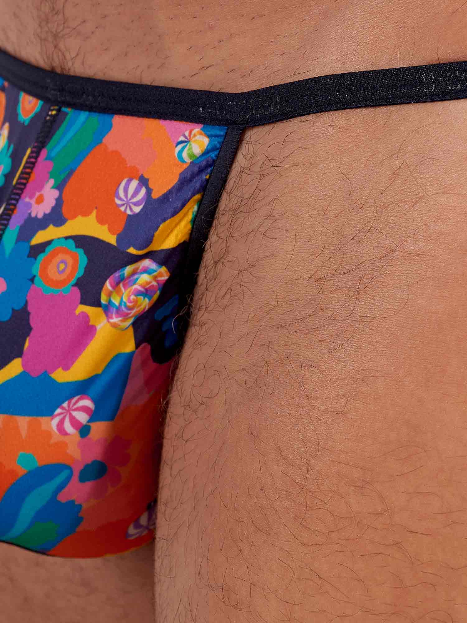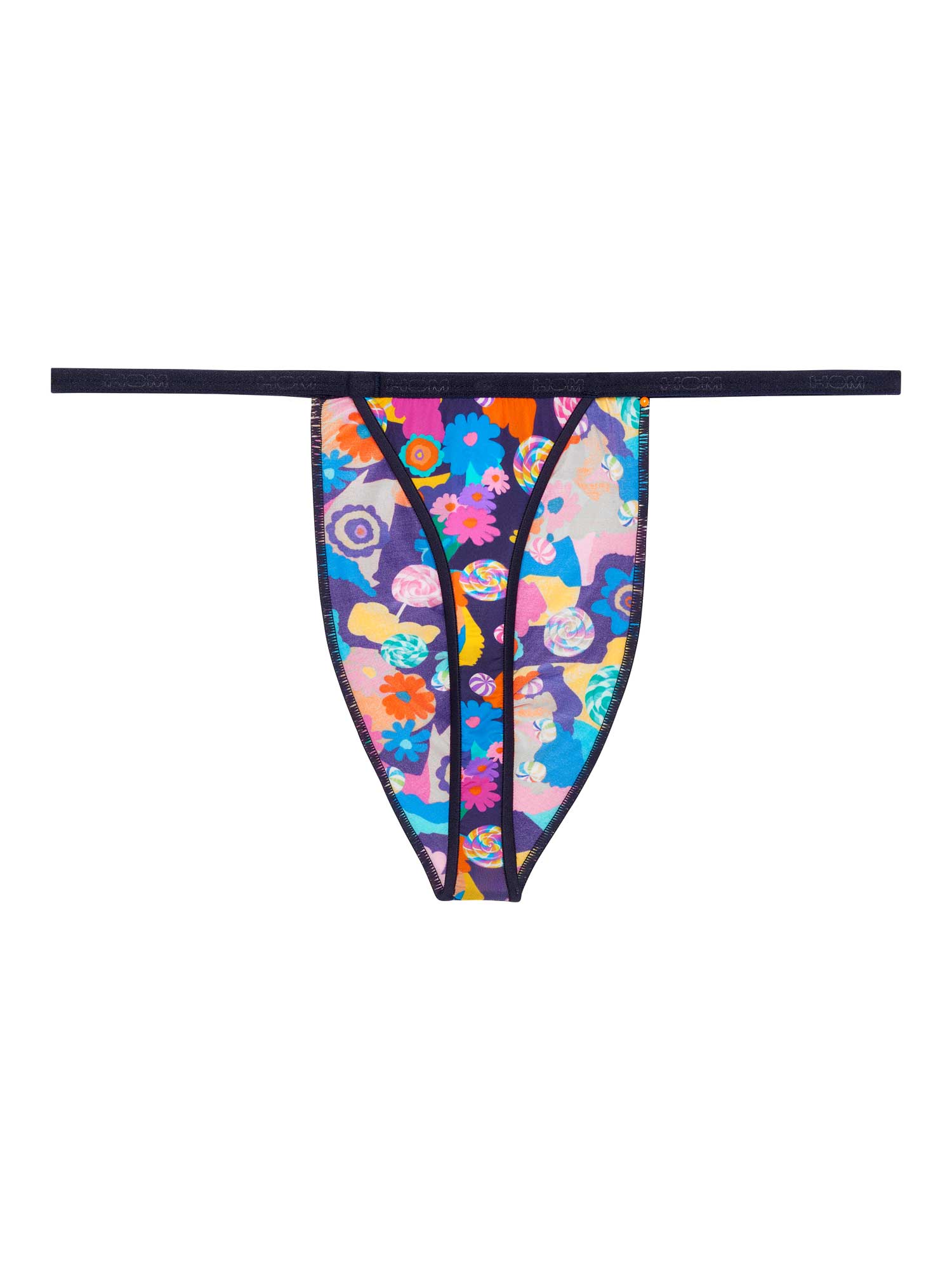 De Wonka G-string uit de HOM Temptation is gemaakt voor verleiding met een speelse knipoog. De ultralichte microvezel, identiek aan die van de HOM Plume-lijn, sluit aan als een tweede huid. De kleurrijke print met snoepjes en psychedelische bloemen maakt het geheel gedurfd en opvallend. Een gewaagd model voor mannen die houden van minimale bedekking en maximale impact.