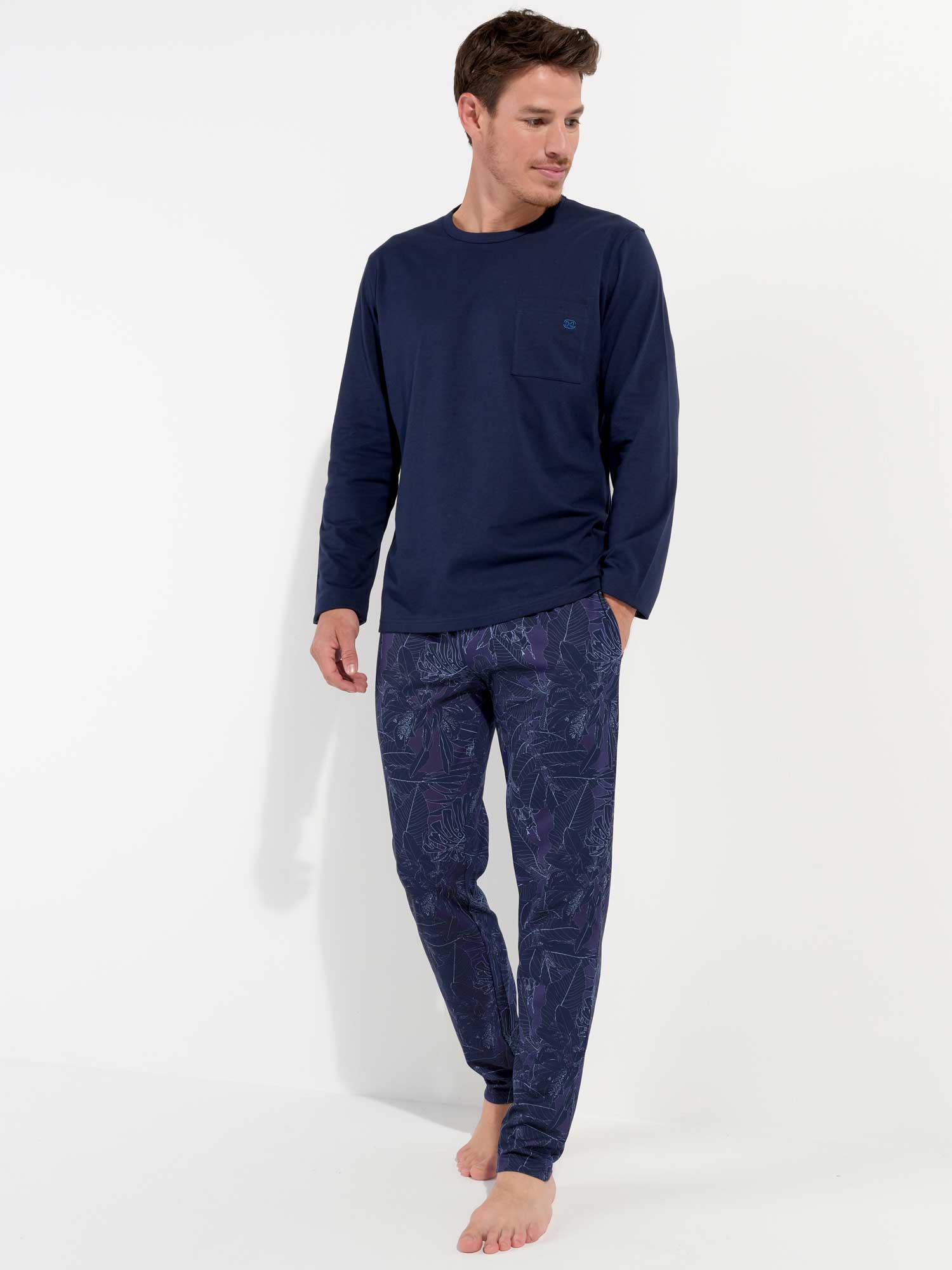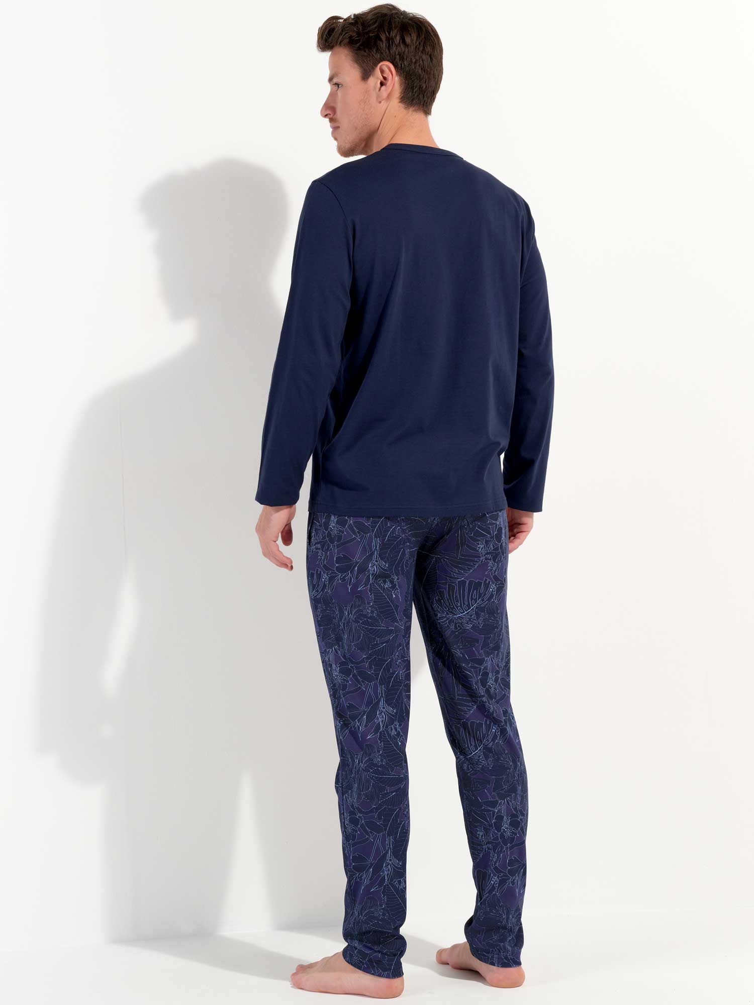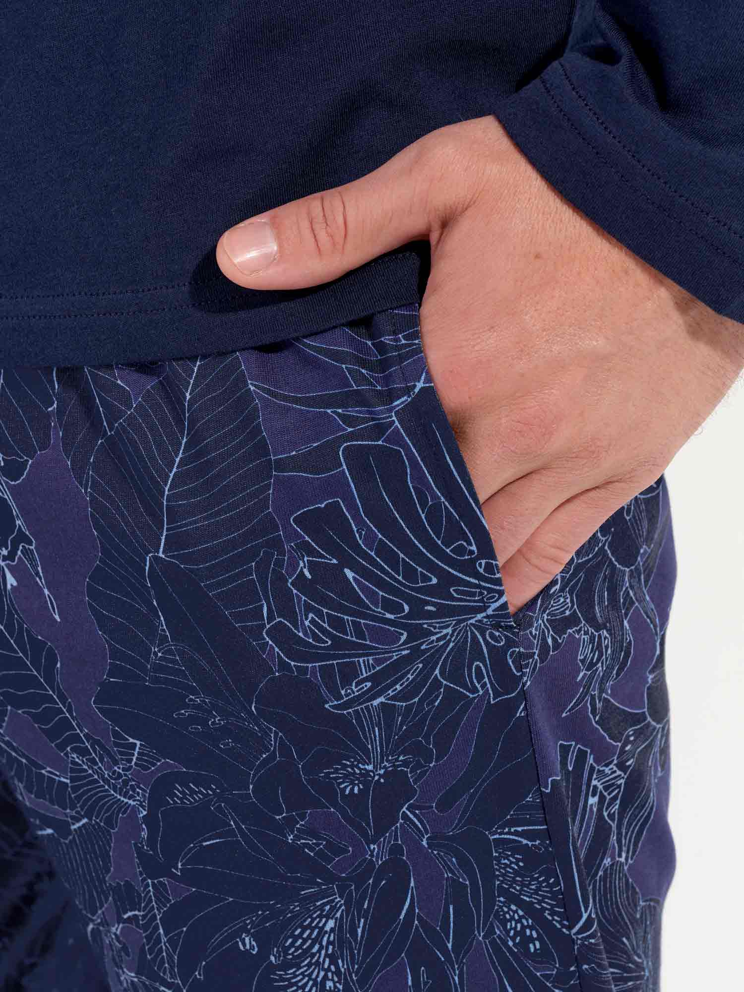 De Kenny - Long Sleepwear is gemaakt van 100% katoen uitgevoerd in een jersey. De pyjama beschikt over een effen T-shirt met lange mouwen en een ronde kraag met knopen met linksvoor een borstzakje. De lange broek heeft een print met een donkerblauw bloemenpatroon op een indigo blauwe achtergrond. De steekzakken in de zoom, aan de linker en rechterzijde zorgen voor extra gemak. Daarnaast beschikt de lange broek over een trekkoord om deze perfect op maat te brengen.
