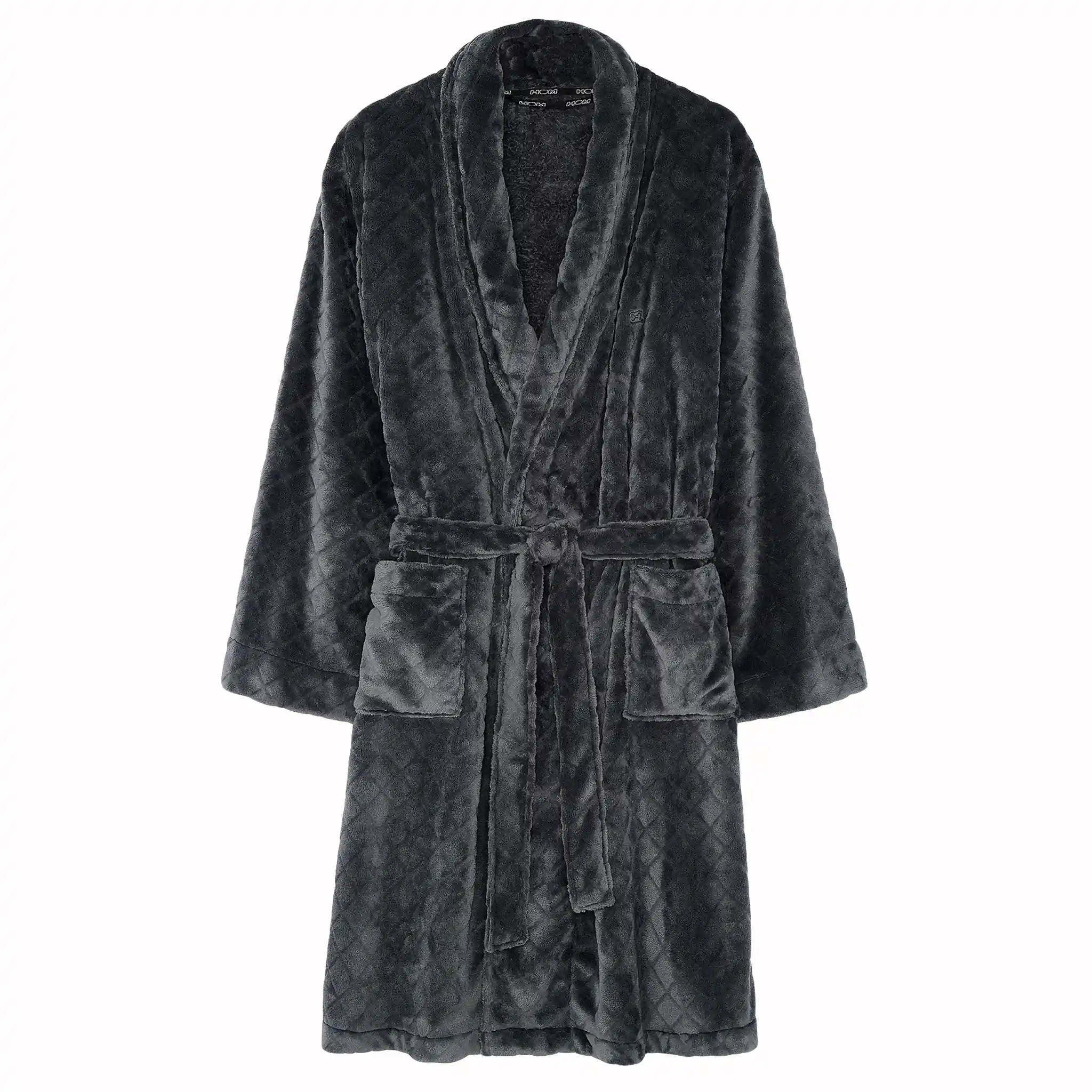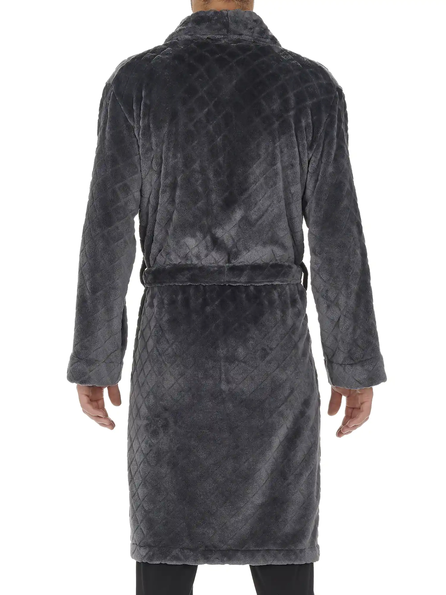 De Monaco is een kamerjas die lang is uitgevoerd en gemaakt van dik, zacht fleece materiaal van polyester, wat uitstekend de temperatuur reguleert en je lekker warm houdt. De kamerjas heeft een chique uitstraling door de ingeschoren lijnen voor een prachtig reliëf in de grijze stof. Met de bijpassende riem kun je de kamerjas sluiten.