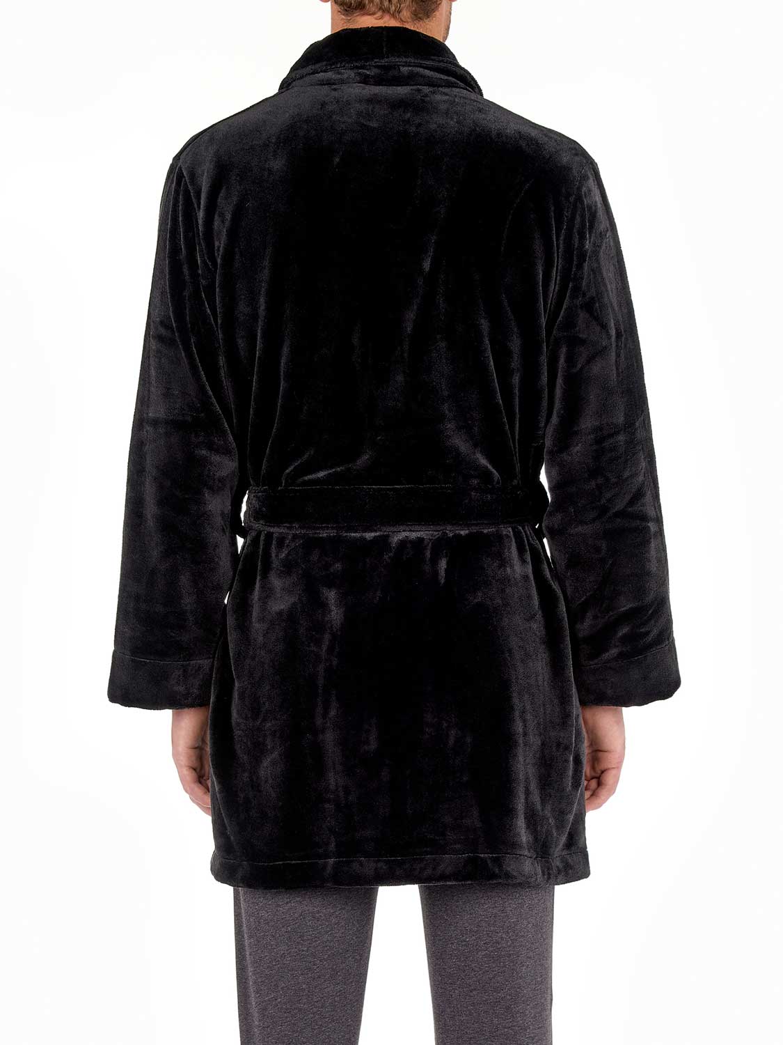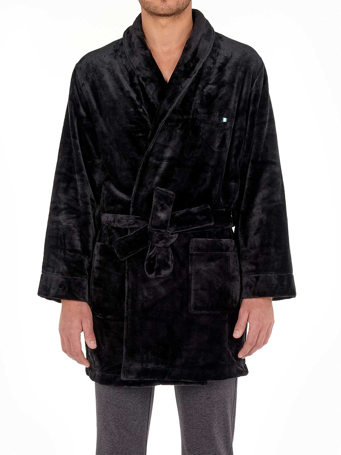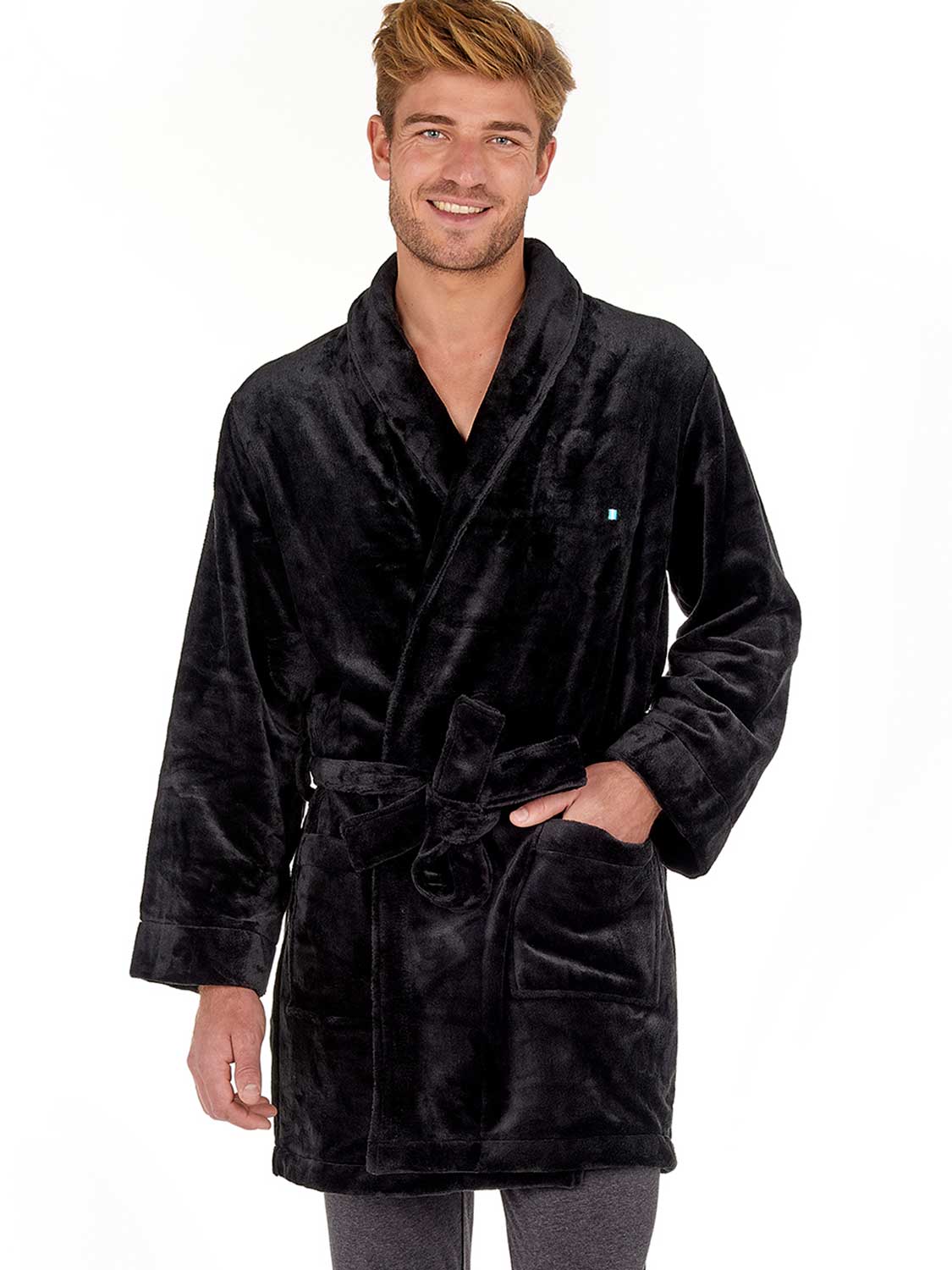 De Robe Short - Nice is kort uitgevoerd en valt boven de knieën. De kamerjas is gemaakt van dik, zacht fleece materiaal van polyester, wat uitstekend de temperatuur reguleert en je lekker warm houdt. De kamerjas is uitgevoerd in het zwart en heeft een lichte glans. De neklijn is aan de binnenzijde afgewerkt met HOM logo tape. Je sluit de kamerjas met de riem, rondom je middel. Let op: Polyester neemt geen water op, waardoor je deze niet kunt dragen als badjas in bijvoorbeeld de sauna.