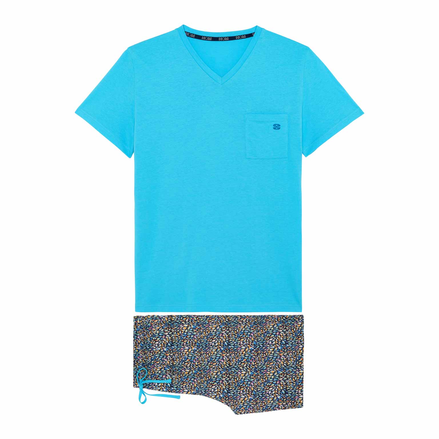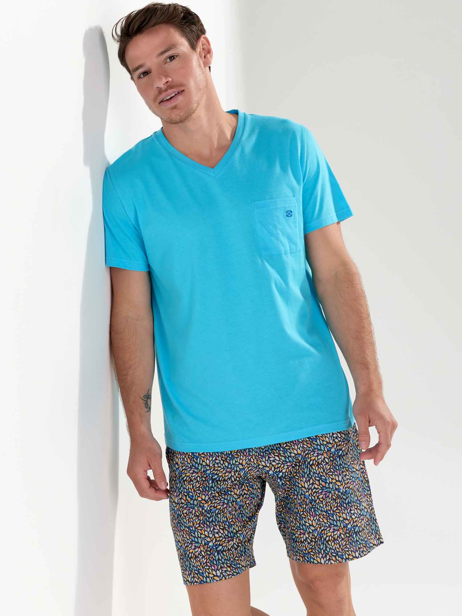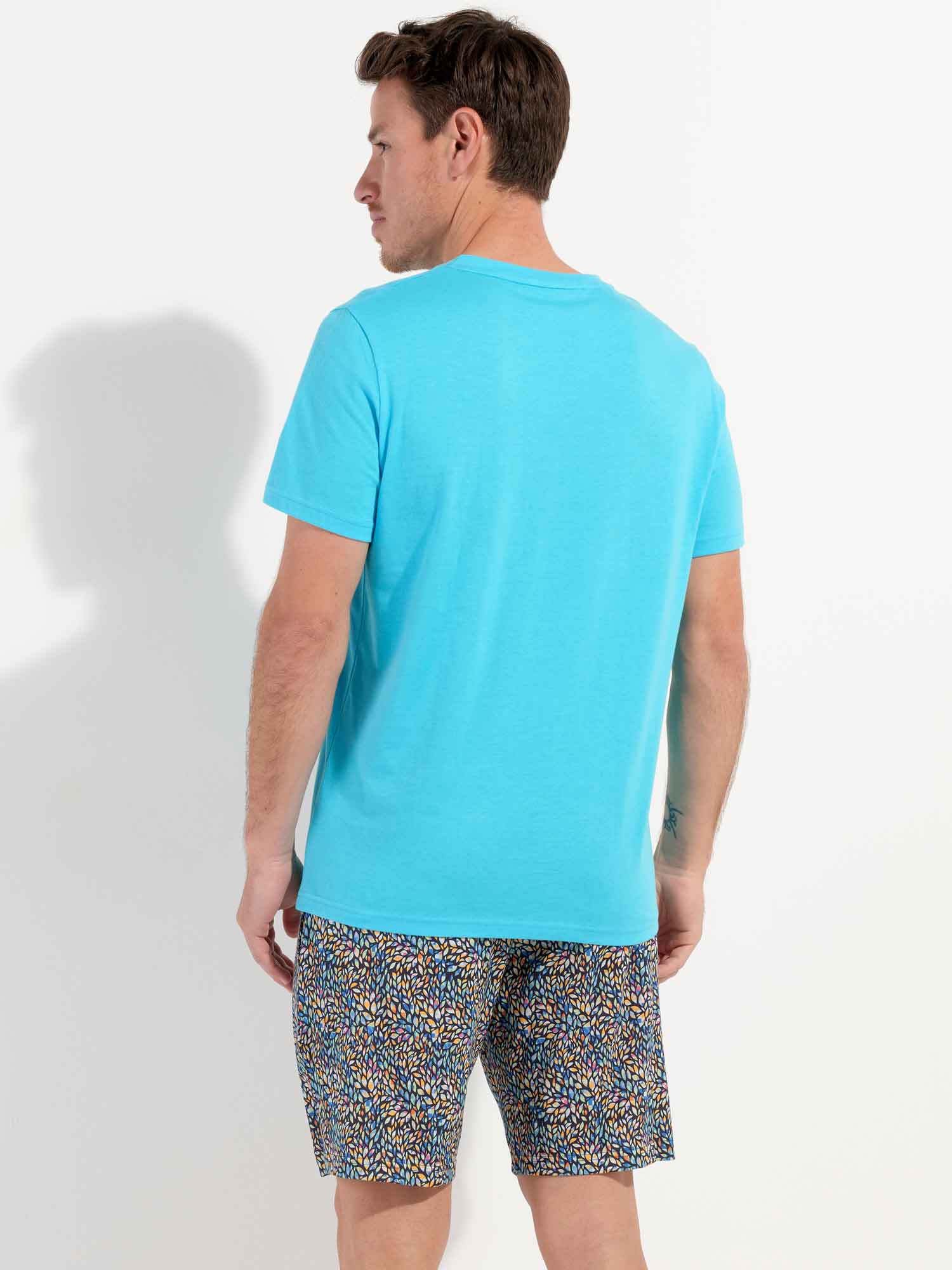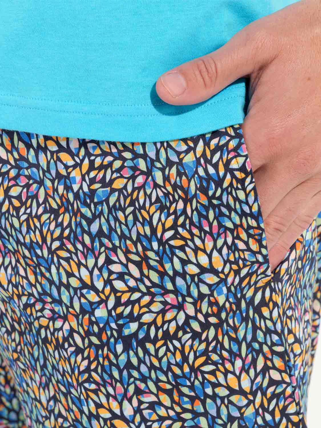 De Buddy - Shortama heeft een speels en kleurrijk karakter en is gemaakt van 100% katoen, uitgevoerd in een jersey. De pyjama beschikt over een effen T-shirt met korte mouwen uitgevoerd in lichtblauw en heeft een V-hals. De korte broek heeft een meerkleurige bladerprint, ingelegd met geometrische motieven op een marine blauwe achtergrond. De pyjama short heeft steekzakken in de zoom, aan de linker en rechterzijde en beschikt over een trekkoord in de heupband om deze perfect op maat te brengen.