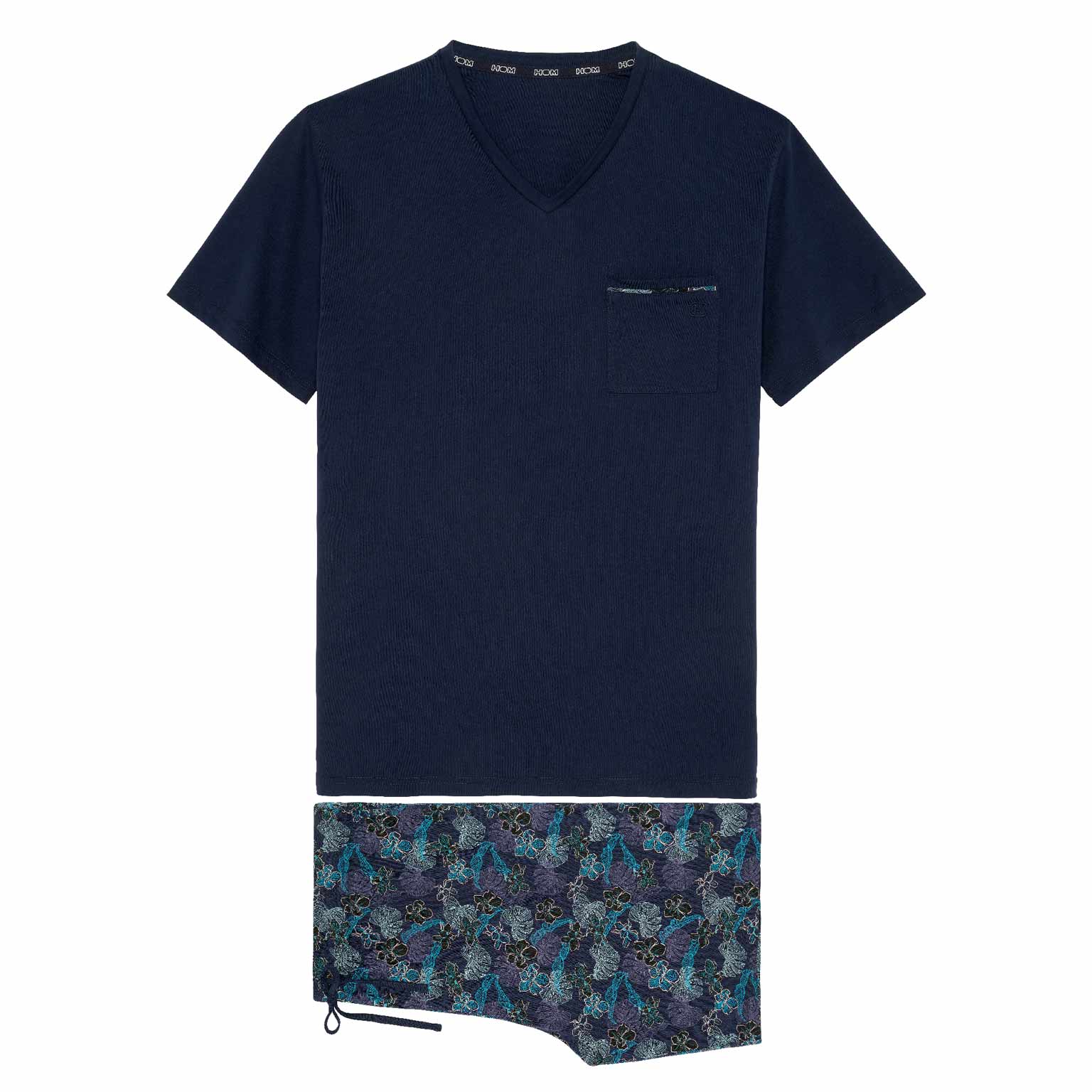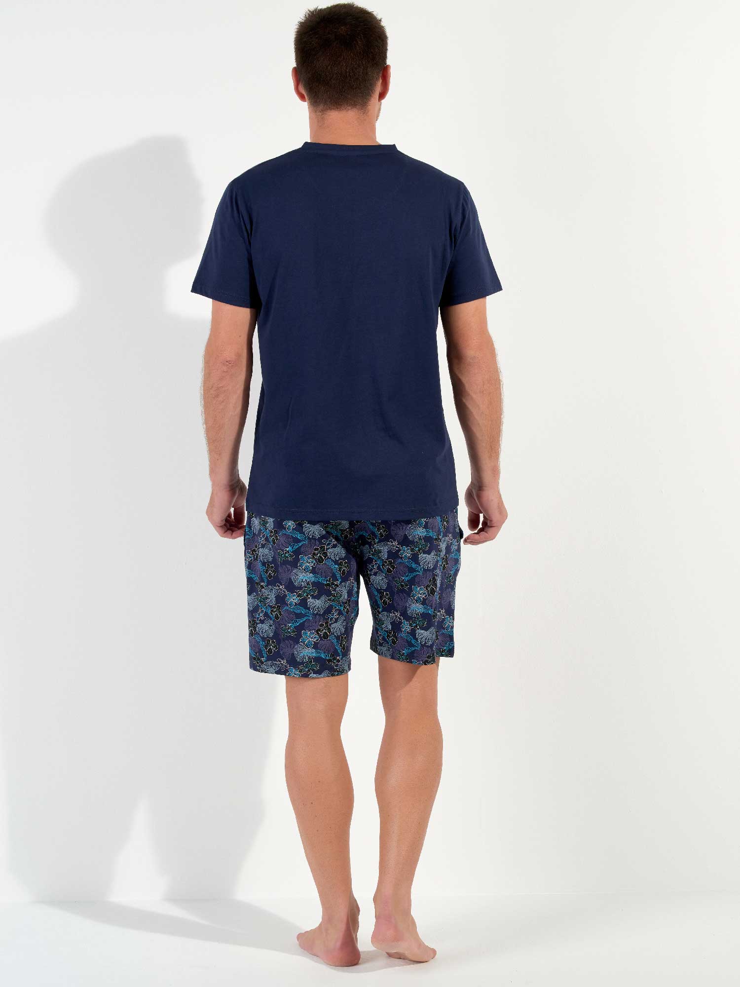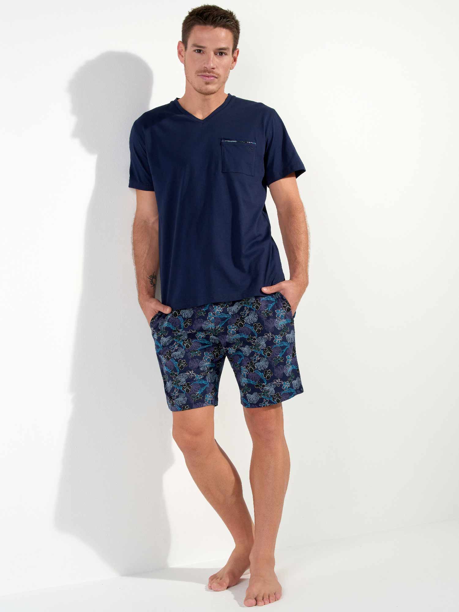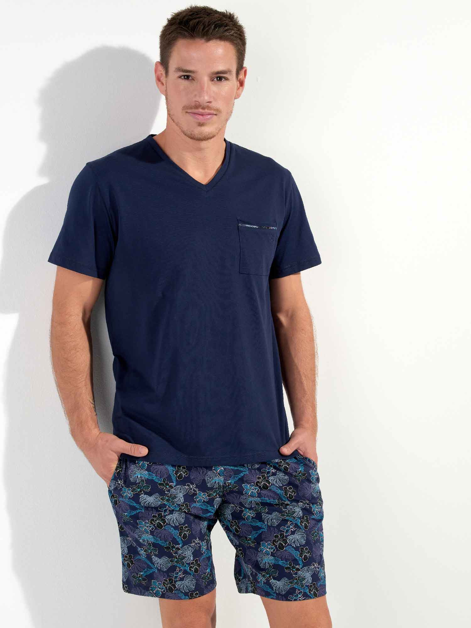 De Maldives - Shortama is gemaakt van 100% katoen, uitgevoerd in een jersey. De pyjama beschikt over een effen marine blauw T-shirt met korte mouwen en heeft een v-hals. De korte broek is uitgevoerd met een exotische bloemenprint op een marine blauwe achtergrond. De broek beschikt over steekzakken in de zoom, aan de linker en rechterzijde en heeft een trekkoord in de heupband om deze perfect op maat te brengen.