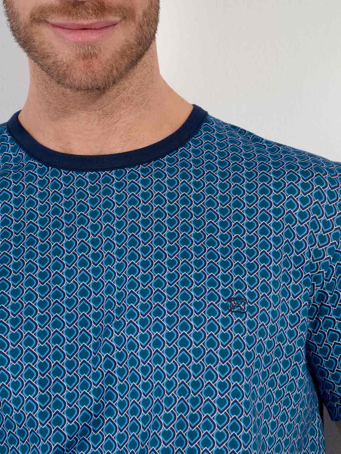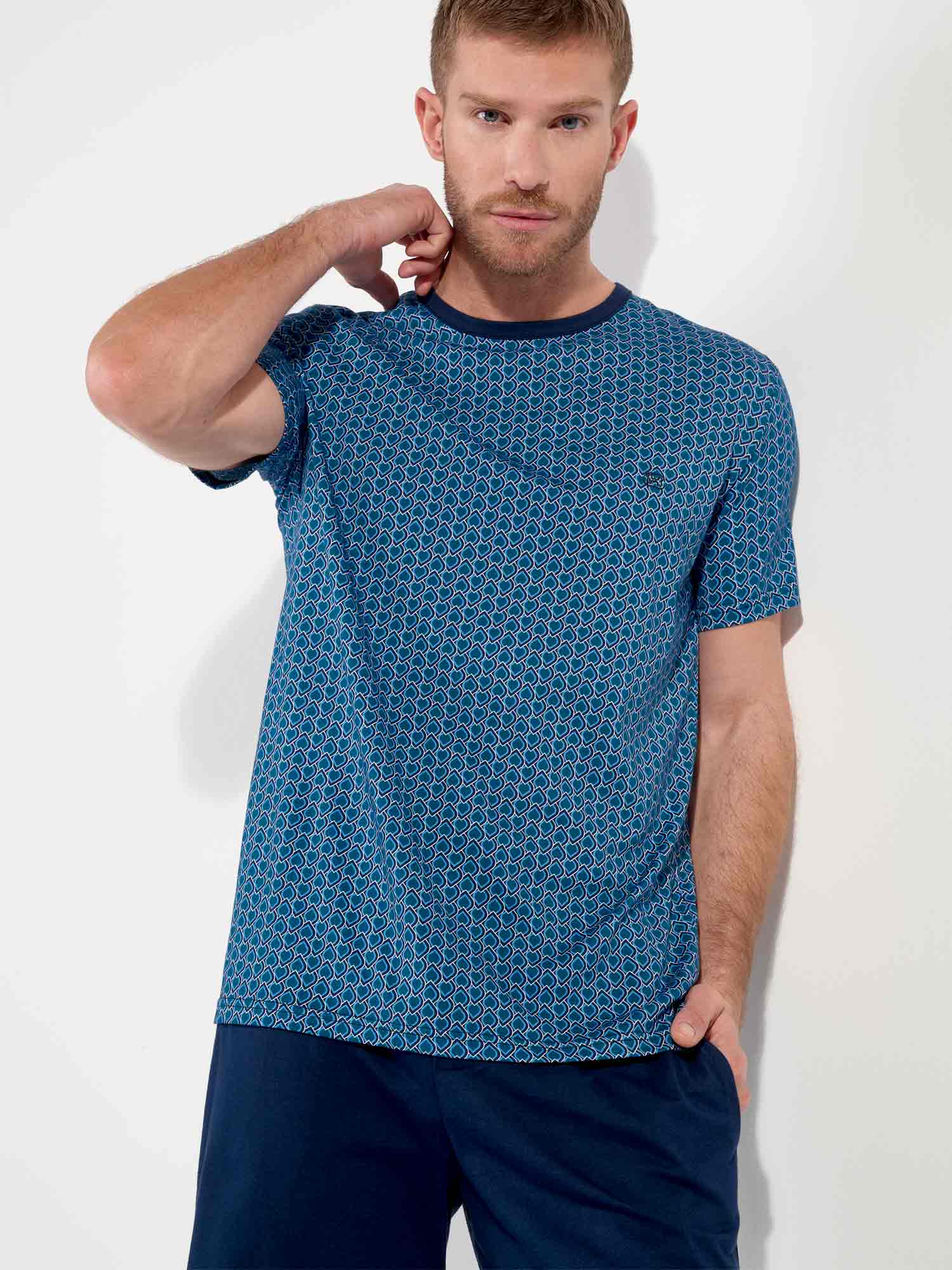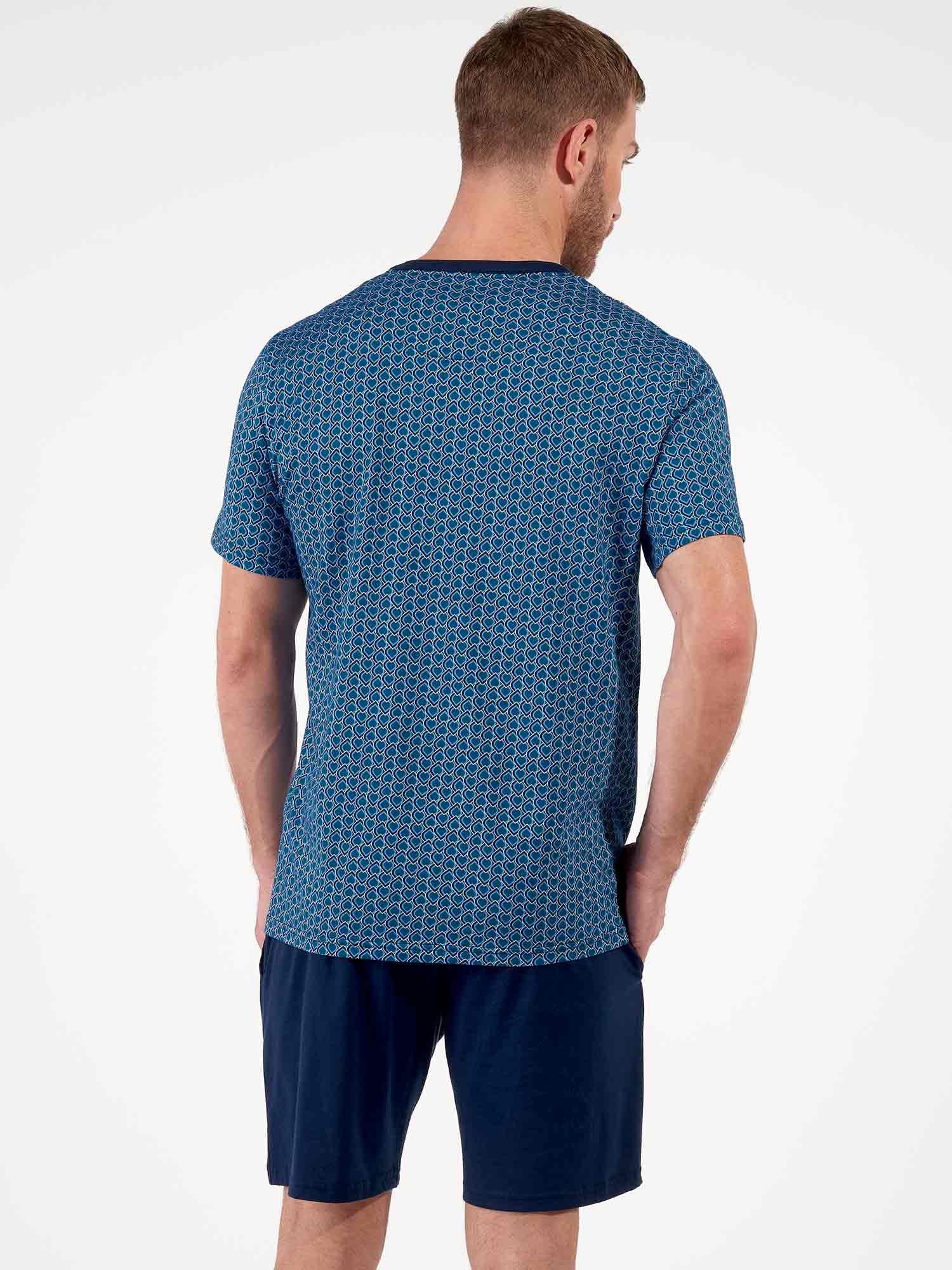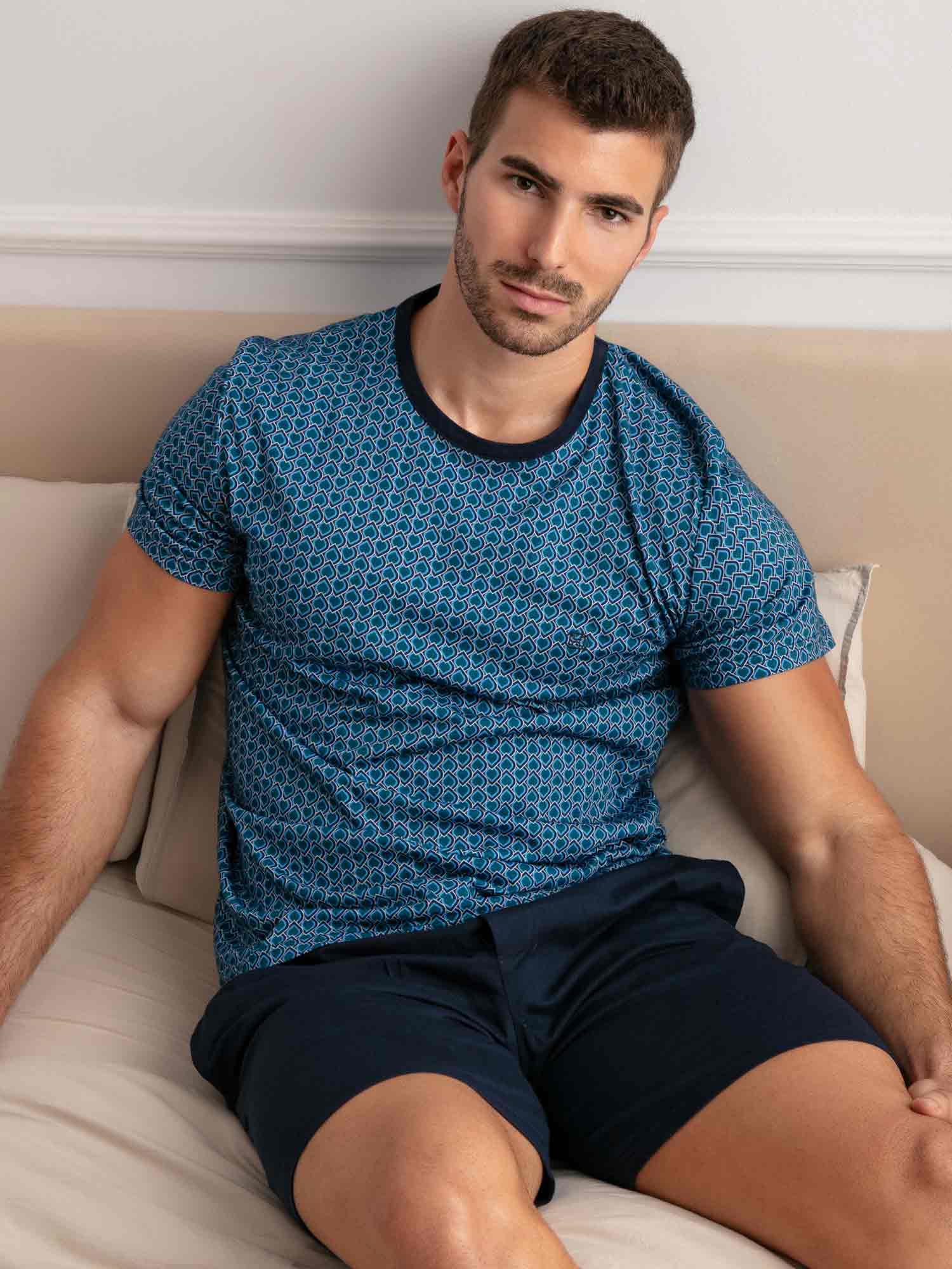 Met zijn grafische patroon en geraffineerde kleurencombinatie is de Martinez shortama van HOM een stijlvolle keuze voor warme nachten of ontspannen ochtenden. Het korte mouwshirt is uitgevoerd in een blauw Art Deco motief dat subtiel verwijst naar Egyptische ornamenten. De effen navy short met zakken heeft een elastische tailleband met een printkoord dat mooi aansluit bij het shirt. Dankzij het gebruik van 100% katoen voelt deze shortama heerlijk zacht aan en blijft hij comfortabel, ook na veelvuldig wassen. Tijdloze klasse in een modern silhouet.