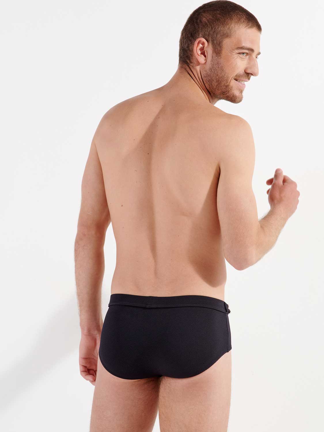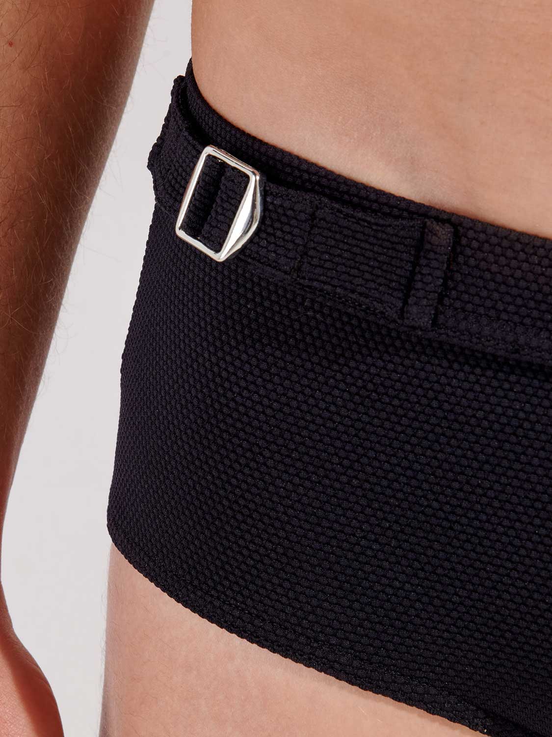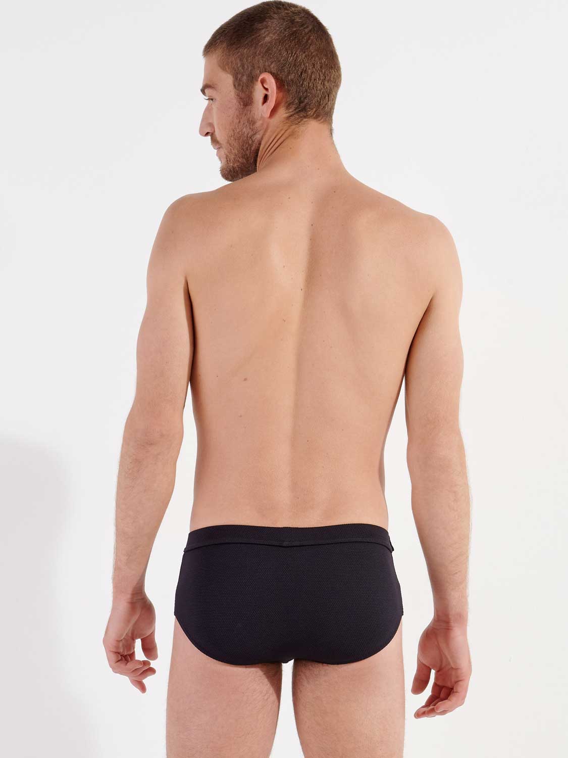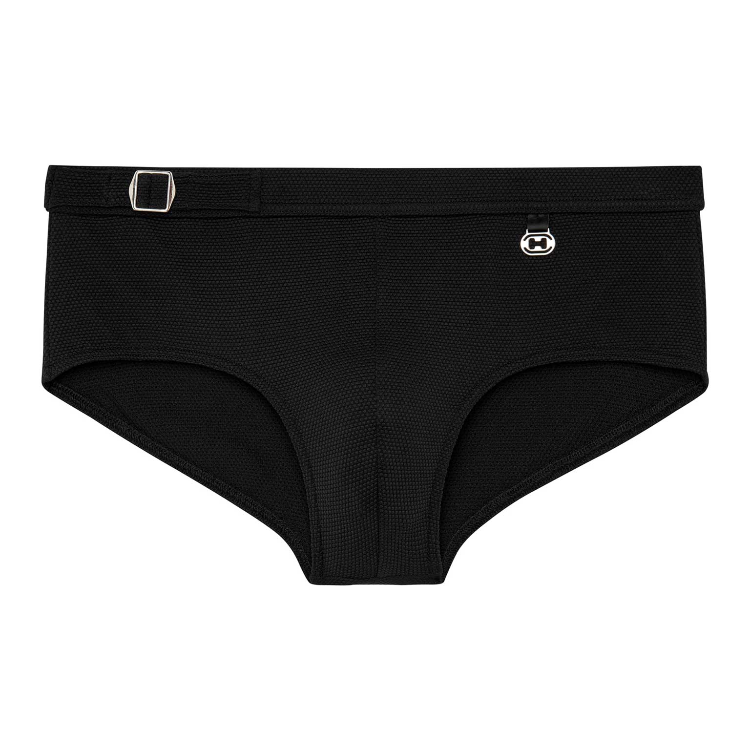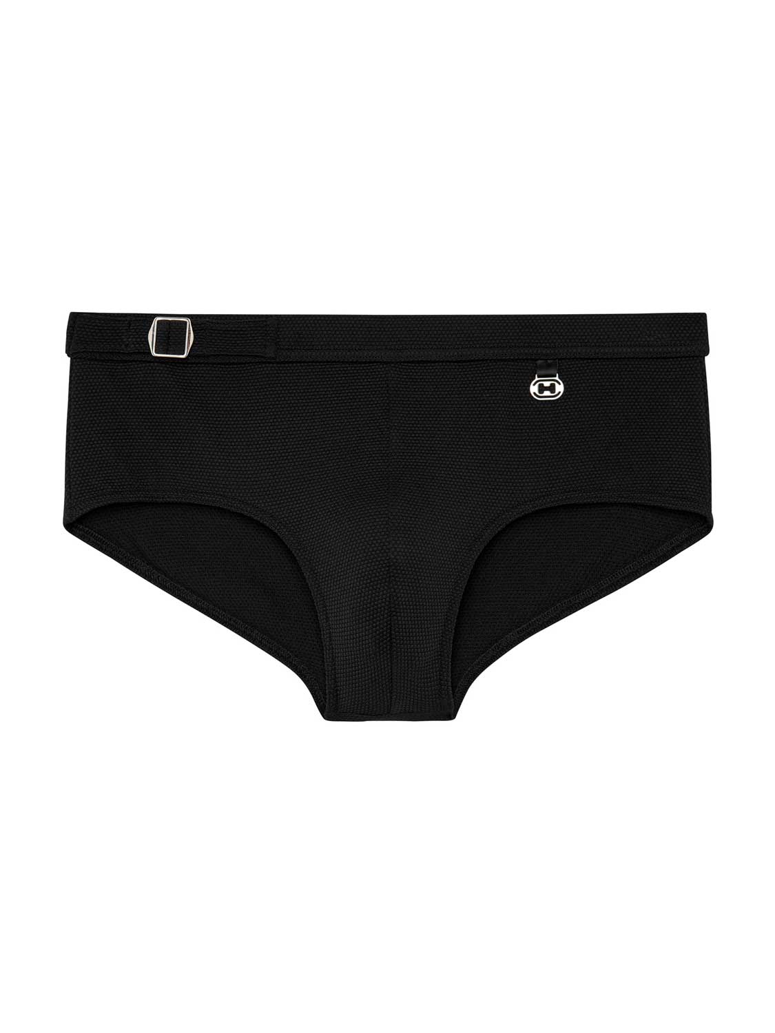 De Ian - Swim Midi Briefs uit de Heritage lijn van HOM, met een eigen unieke styling, voor de modebewuste man, die graag goed voor de dag komt en houdt van een de eigentijdse heritage look. De zwembroek is uitgevoerd in de kleur zwart en jacquard gebreid voor een subtiel patroon en reliëf. Samen met de riem en gesp linksvoor heeft deze zwembroek een eigentijdse James Bond stijl, voor een opvallende elegante look. De zwembroek betreft een midi model die je hoog op de heupen draagt. De zwembroek is laag uitgesneden waardoor de zwembroek robuust voor de dag komt. Een prachtig mode-item voor op het strand of in het zwembad.
