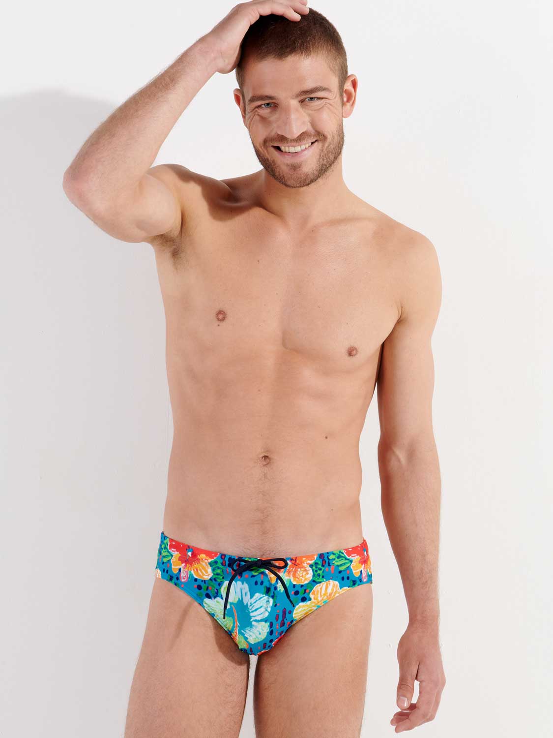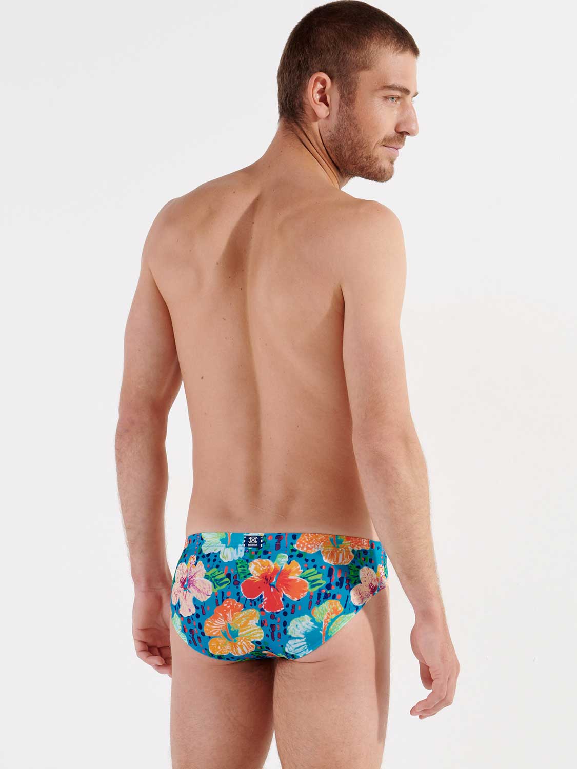 De Dino - Swim Mini Briefs heeft een zomerse kleurrijke look, met zijn opvallende bloemen print op een turquoise achtergrond. De stof is elastisch, sluit mooi aan op de huid en schijnt niet door. Het betreft een Mini Briefs, dus je draagt deze zwembroek hoger op de heupen. Met het trekkoord in de heupband breng je de zwembroek perfect op maat. Met dit mode-item breng je een stukje vrolijkheid naar het strand of het zwembad.