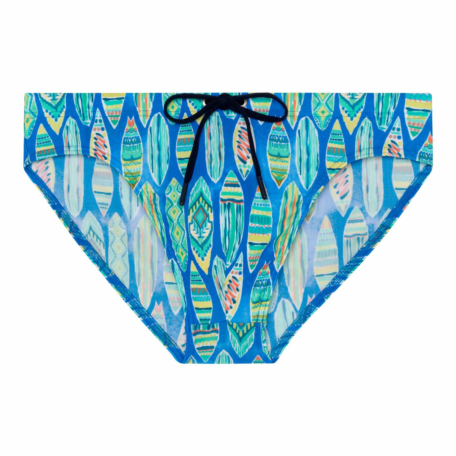 De Marbella - Swim Mini Briefs maken deel uit van de zomercollectie zwemkleding van HOM. Het ontwerp toont turquoise, groene en gele surfplanken op een blauw tie-dye achtergrond en roept exotische vakanties op. De stof is elastisch, sluit mooi aan op de huid en is niet doorschijnend. Omdat dit mini briefs zijn, zitten ze hoger op de heupen. Het trekkoord in de tailleband maakt het mogelijk om de zwembroek perfect af te stellen op jouw maat voor een stevige en comfortabele pasvorm.