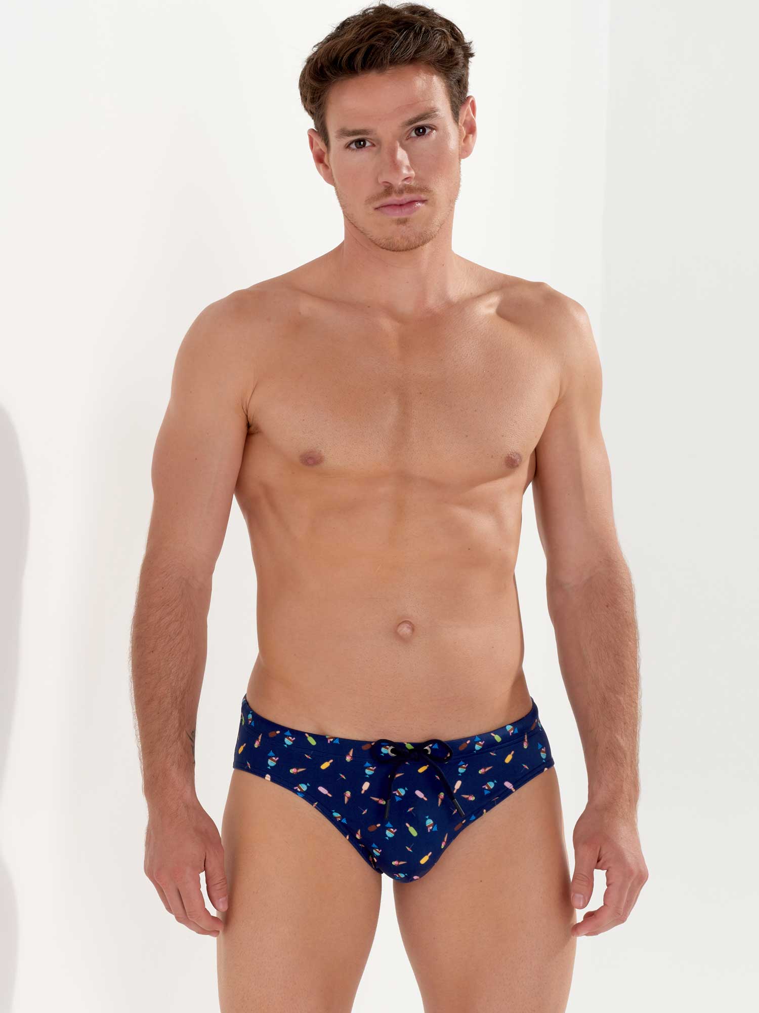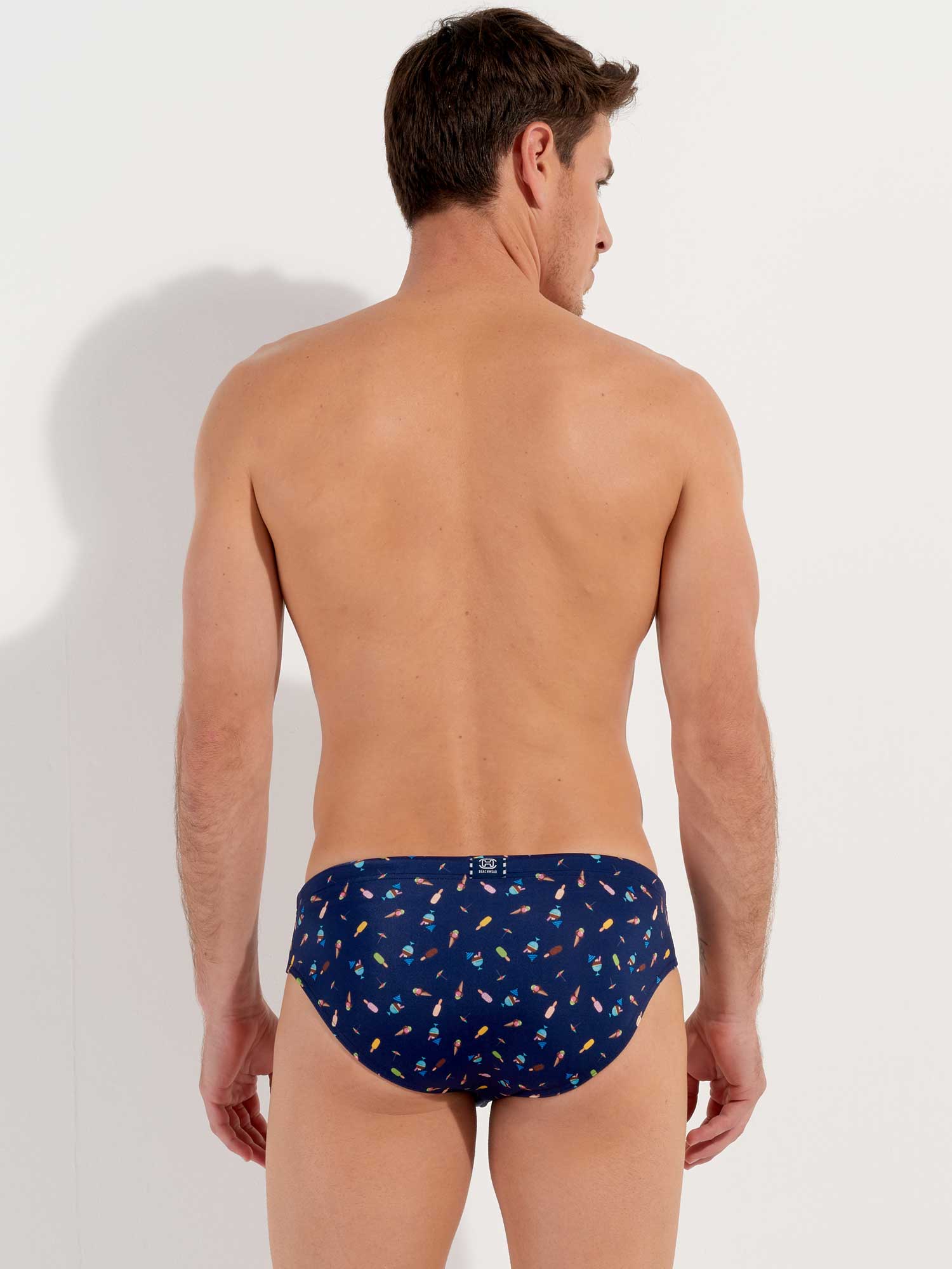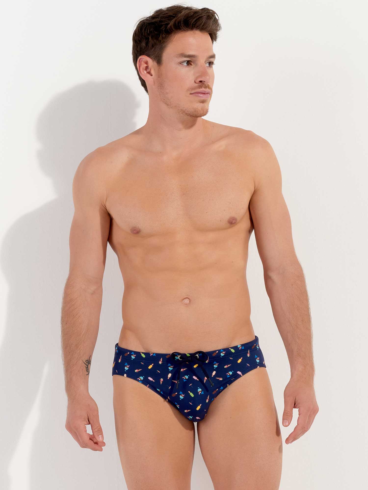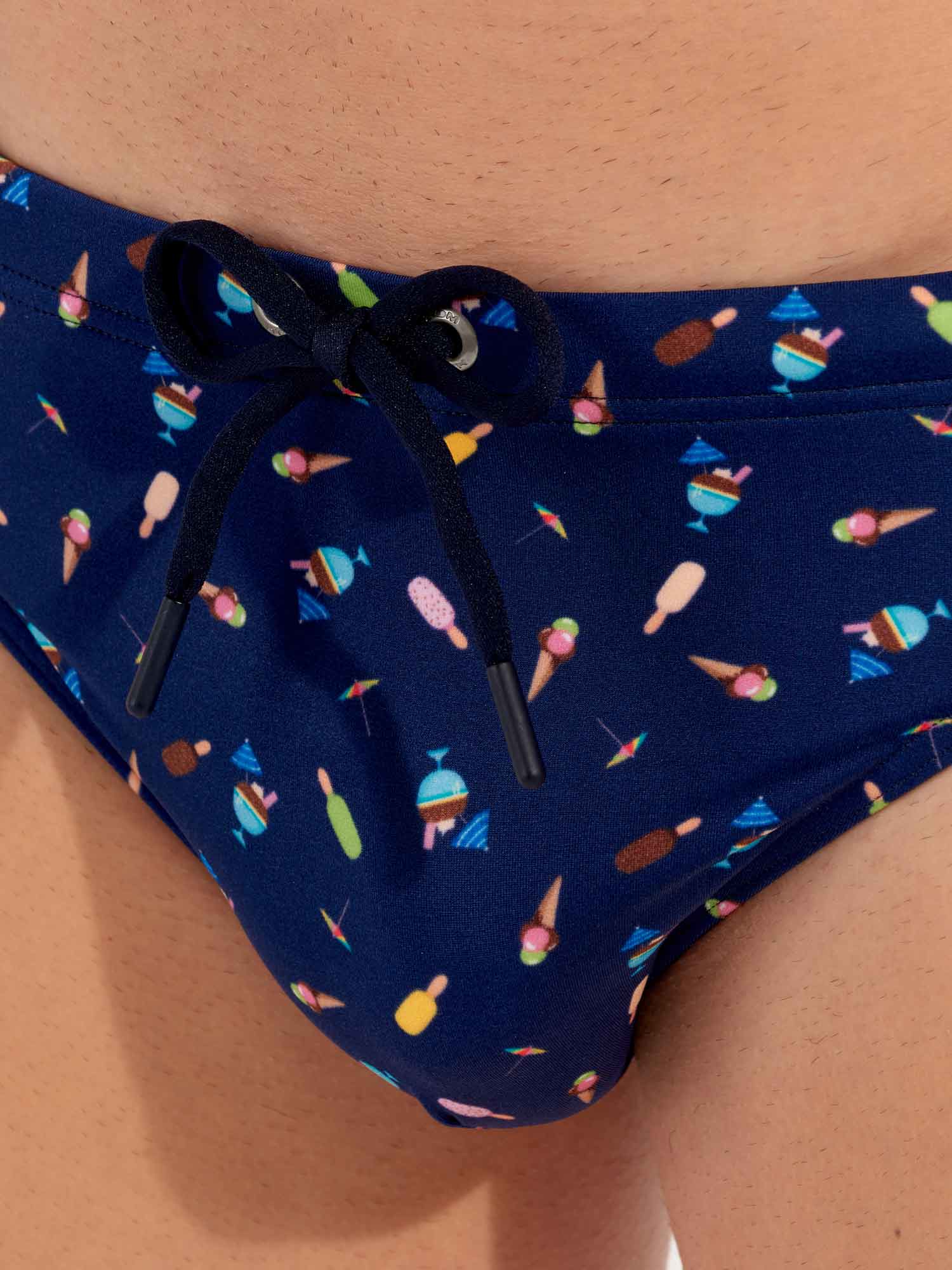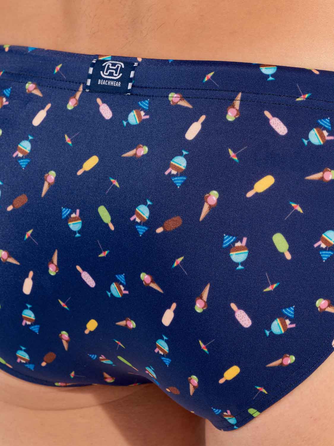 De Summer - Swim Mini Briefs maken deel uit van de zomercollectie zwemkleding van HOM. De print toont kleurrijke ijsjes op een marineblauwe achtergrond en roept de zoetheid en verfijning van zomervakanties op. De stof is elastisch, sluit mooi aan op de huid en is niet doorschijnend. Omdat dit een mini brief is, zit de zwembroek hoger op de heupen. Het trekkoord in de tailleband maakt het mogelijk om de zwembroek perfect af te stellen op jouw maat voor een stevige en comfortabele pasvorm.