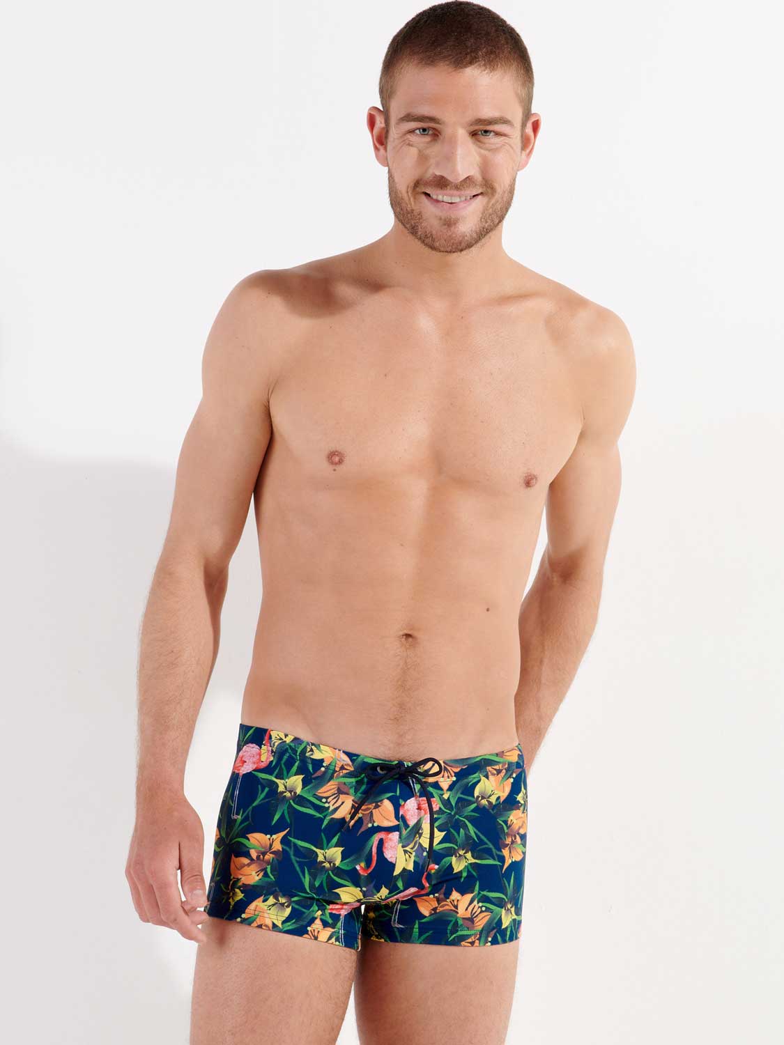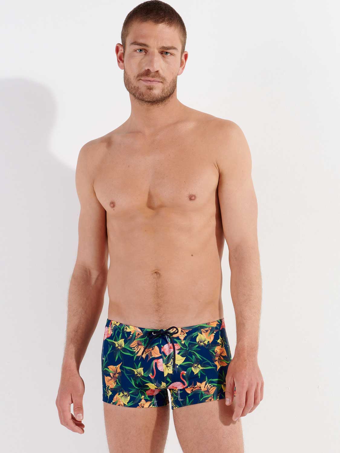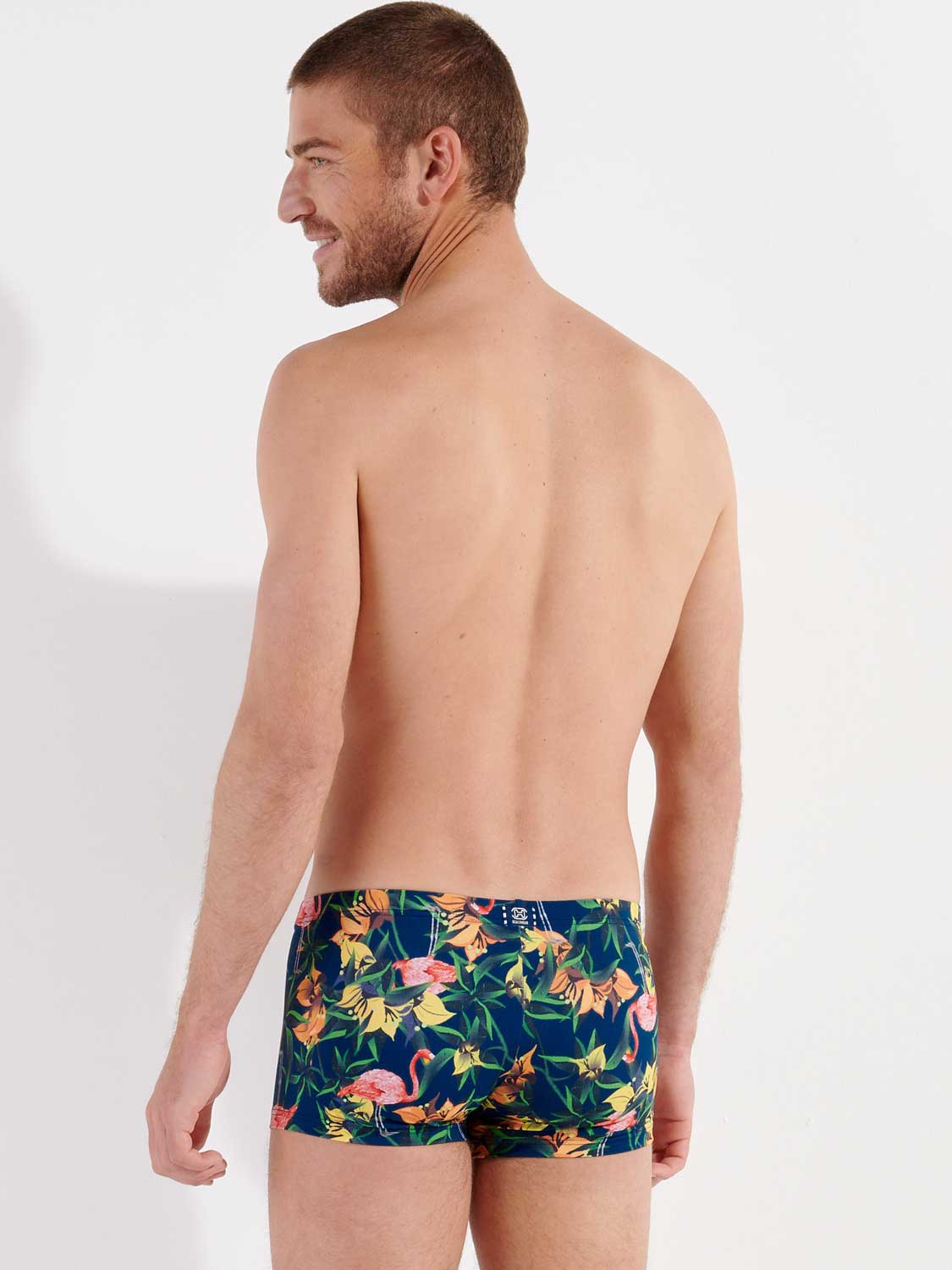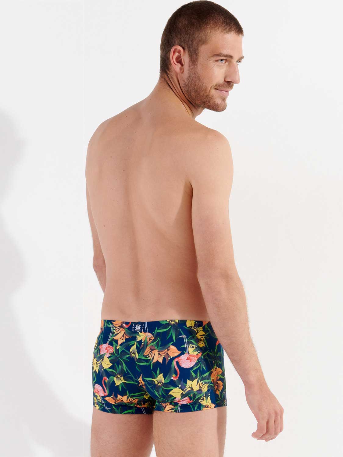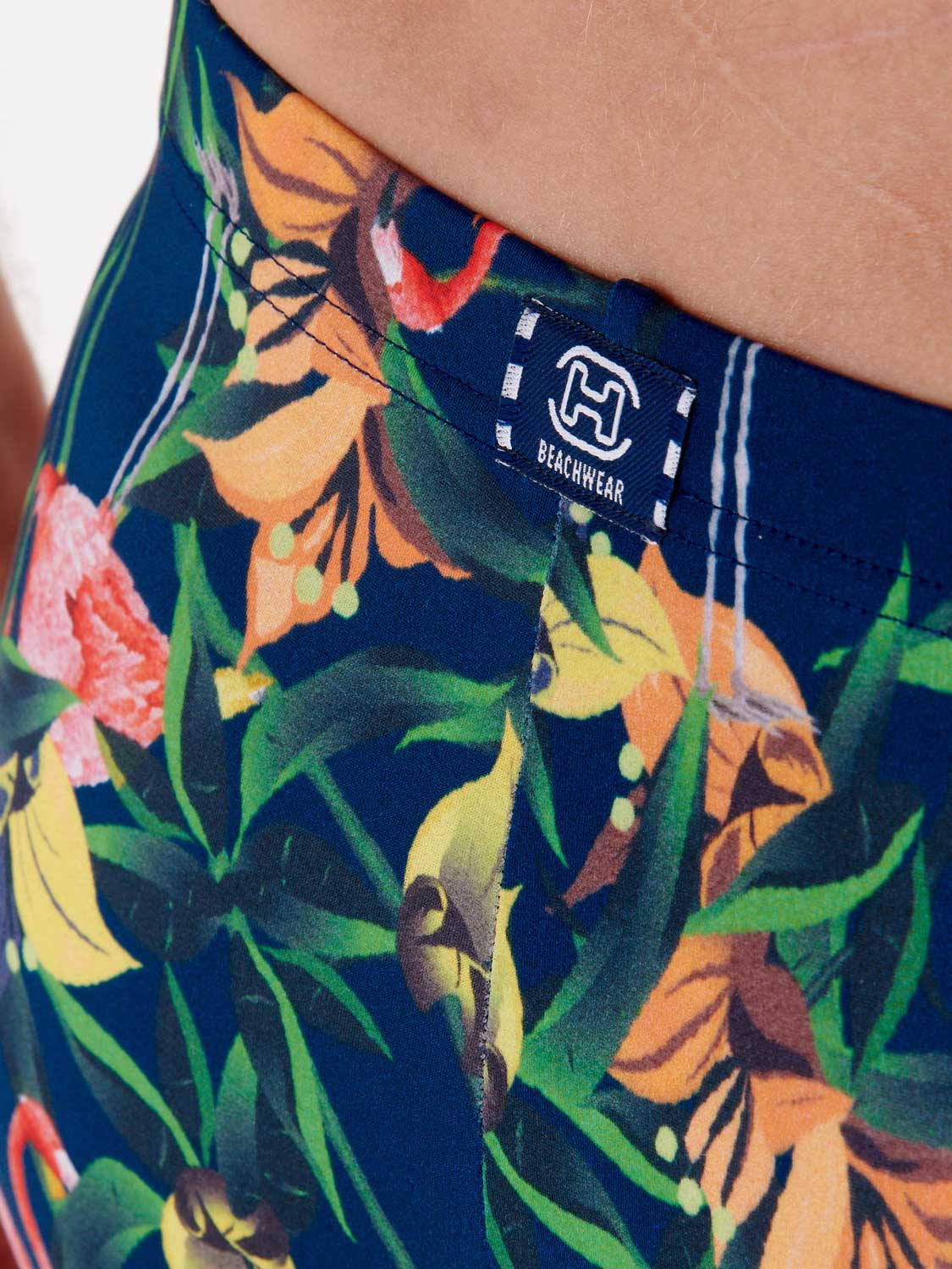 De Flamingo - Swim Shorts met een prachtige tropische look door zijn kleurrijke print met roze flamingo's op een achtergrond van gele en oranje bloemen. De stof is elastisch, sluit mooi aan op de huid en schijnt niet door. Met het trekkoord in de heupband breng je de zwemshort perfect op maat. Dit tropische mode-item geeft je een gevoel van vakantie.