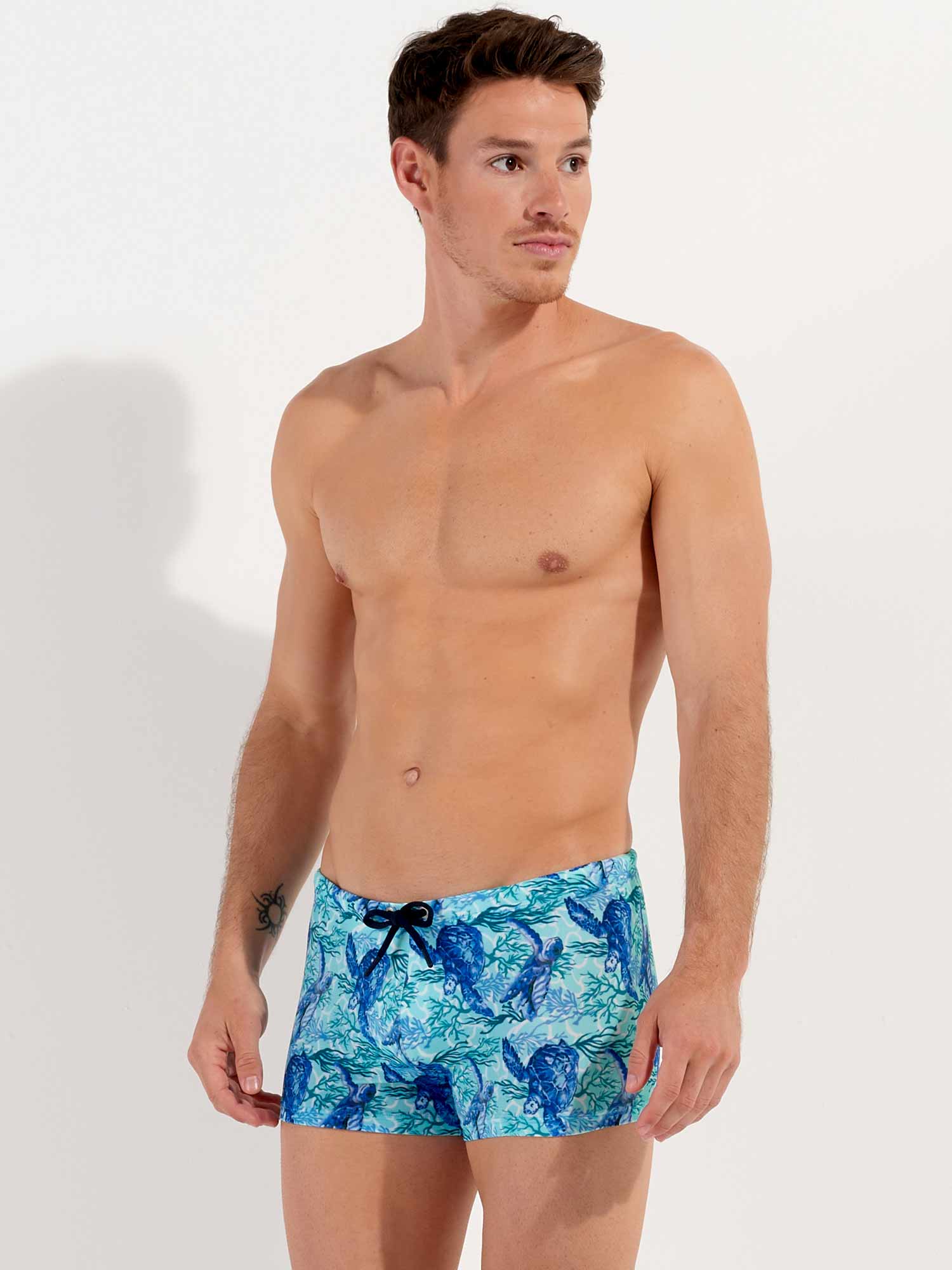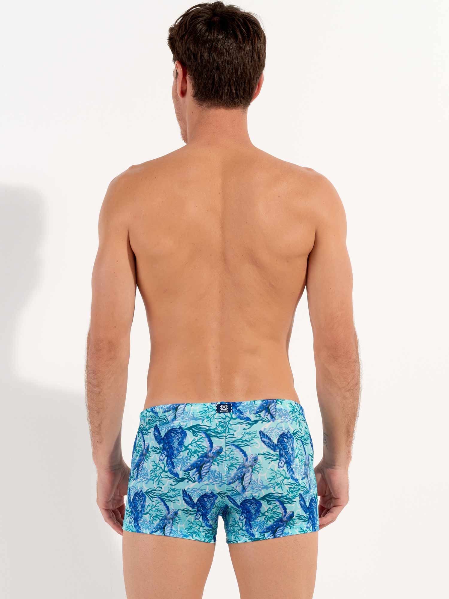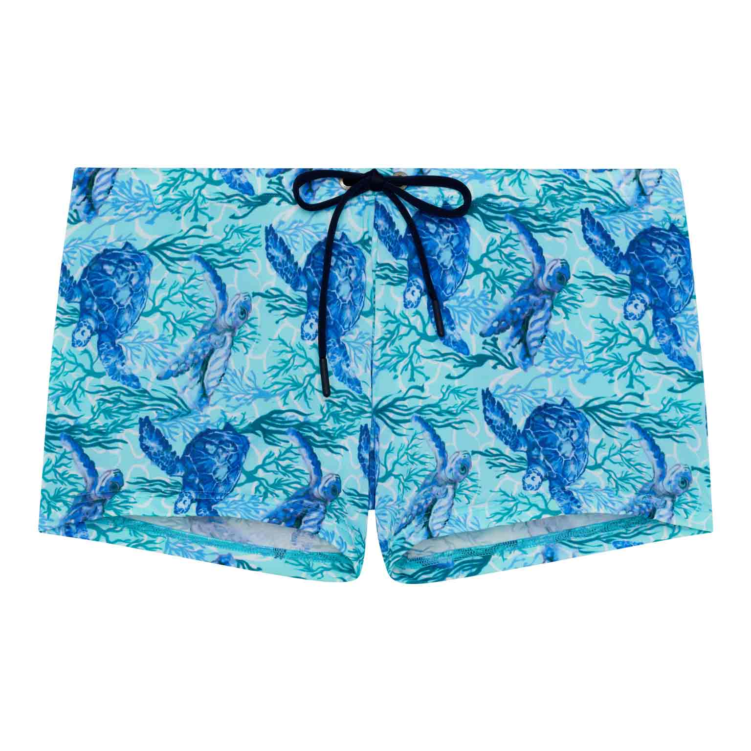 De Tartane - Swim Shorts hebben een verfrissende print met zeedieren. Blauwe schildpadden op een turquoise achtergrond sieren dit waterachtige ontwerp dat doet denken aan de zeebodem van de Caribische eilanden. De schildpad staat symbool voor wijsheid, moed en doorzettingsvermogen. De stof is elastisch, sluit mooi aan op de huid en is niet doorschijnend. Het trekkoord in de tailleband maakt het mogelijk om de zwembroek perfect af te stellen op jouw maat voor een stevige pasvorm. Met dit mode-item breng je een vrolijke noot naar het strand of het zwembad.