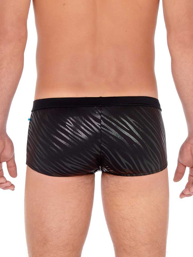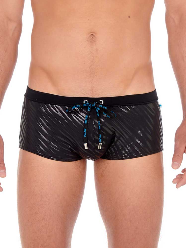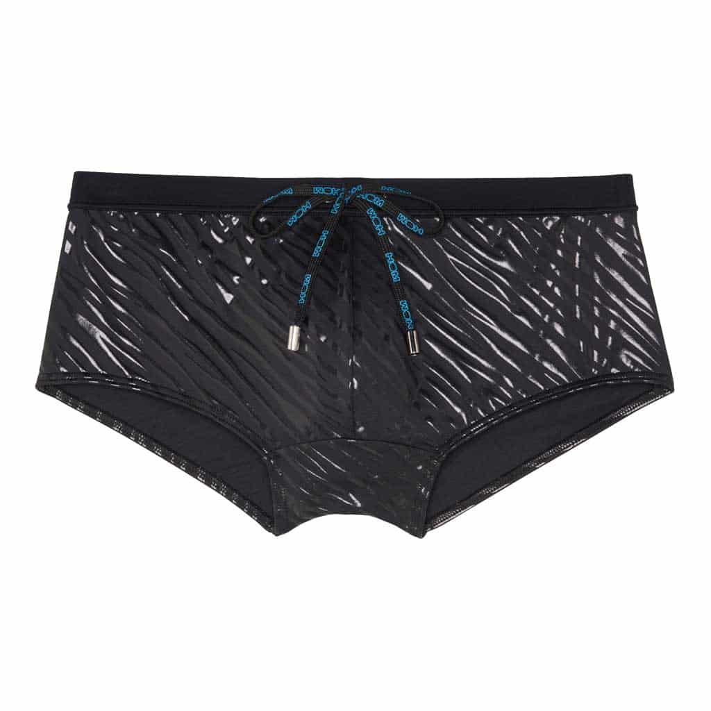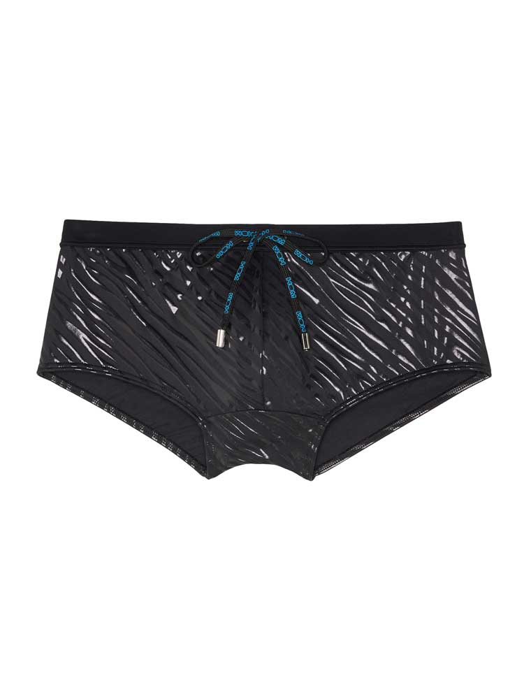 Het Clubber - Swim Short is uitgevoerd in het zwart en heeft een uitdagend glanzend patroon (let op, dit is dus geen print) en past wat design betreft prima in de temptation collectie. De zwembroek heeft een comfortabele fit met een trekkoordje in de heupband om de zwemboxer perfect op maat te brengen.
