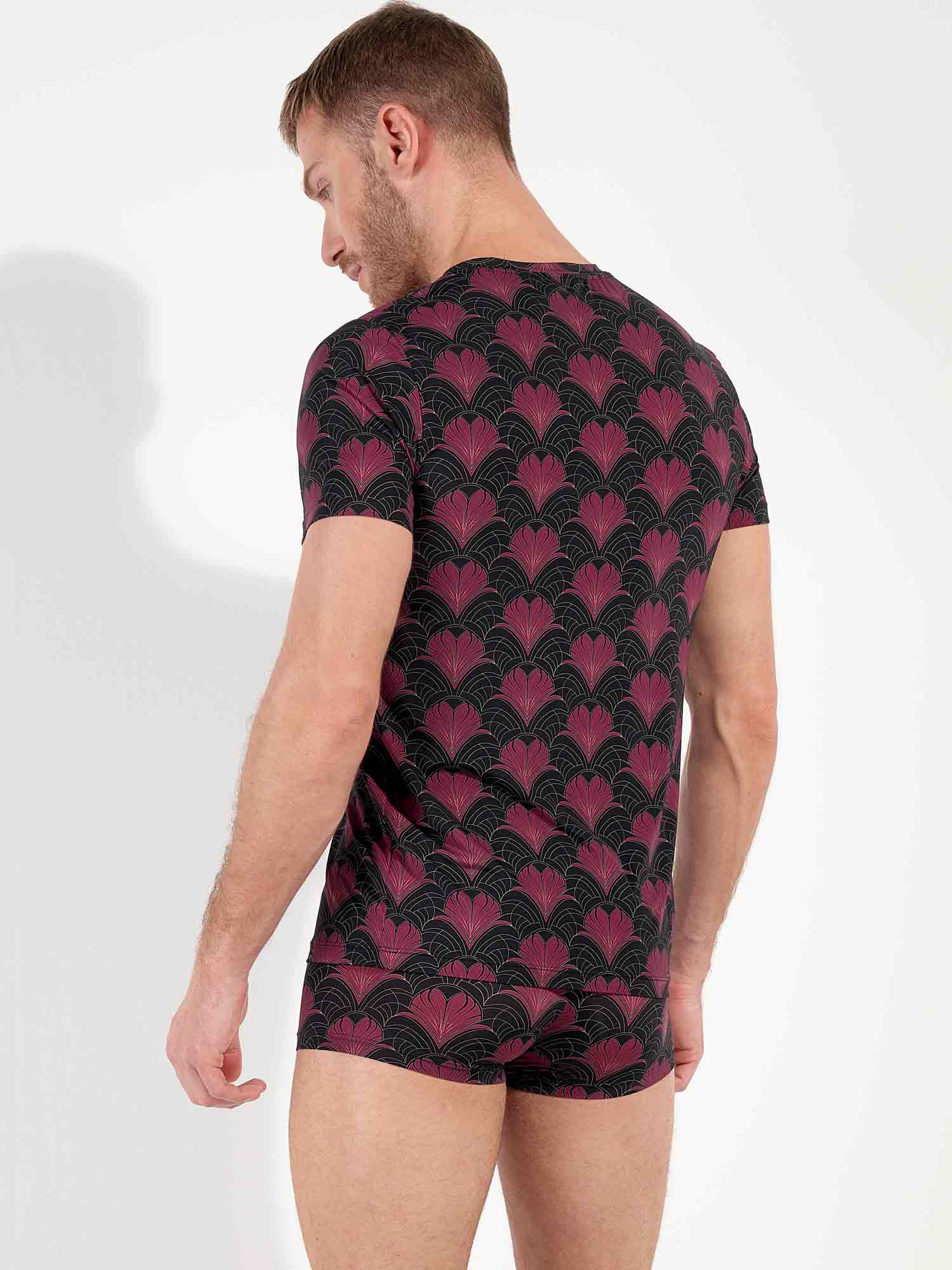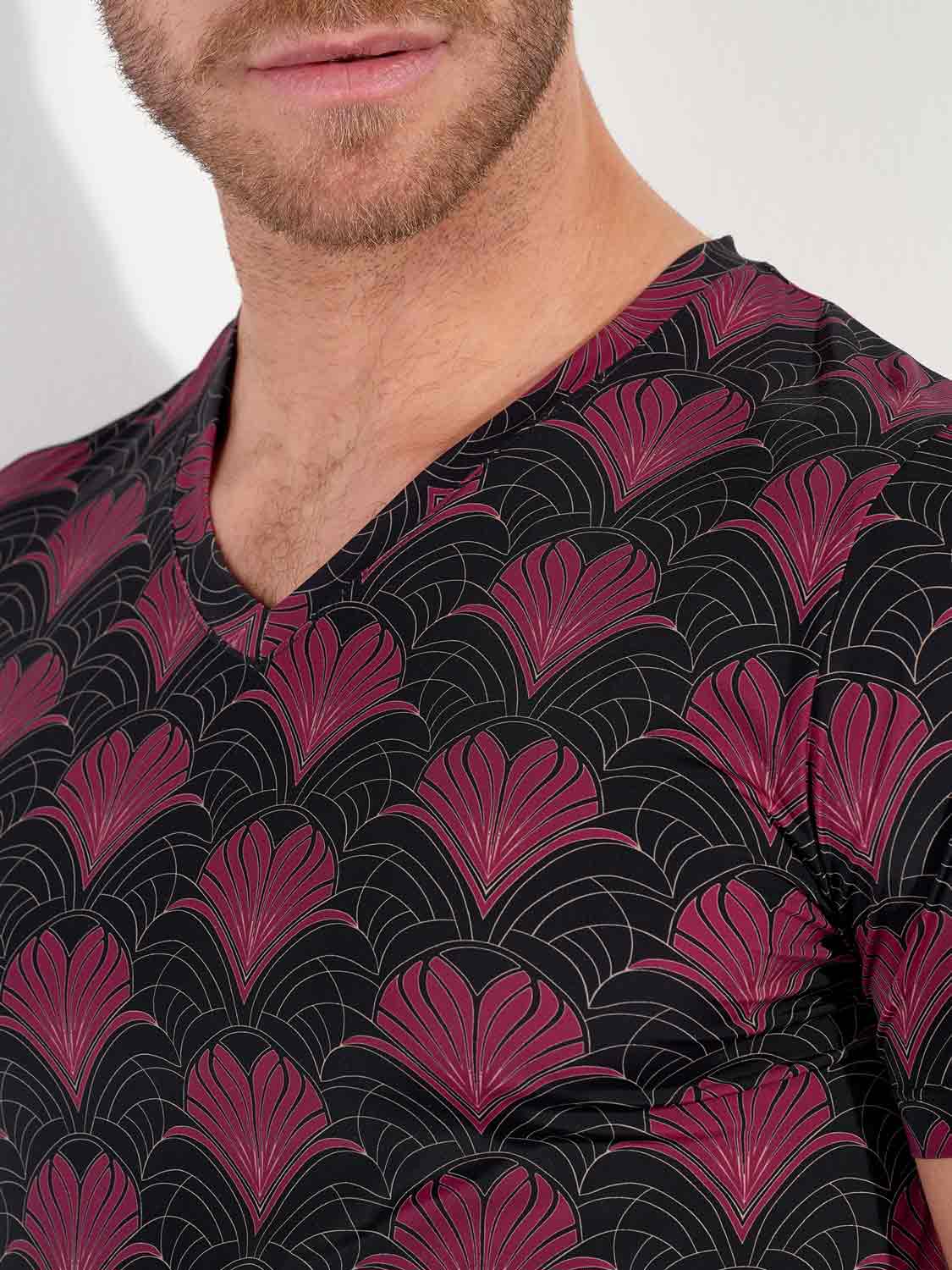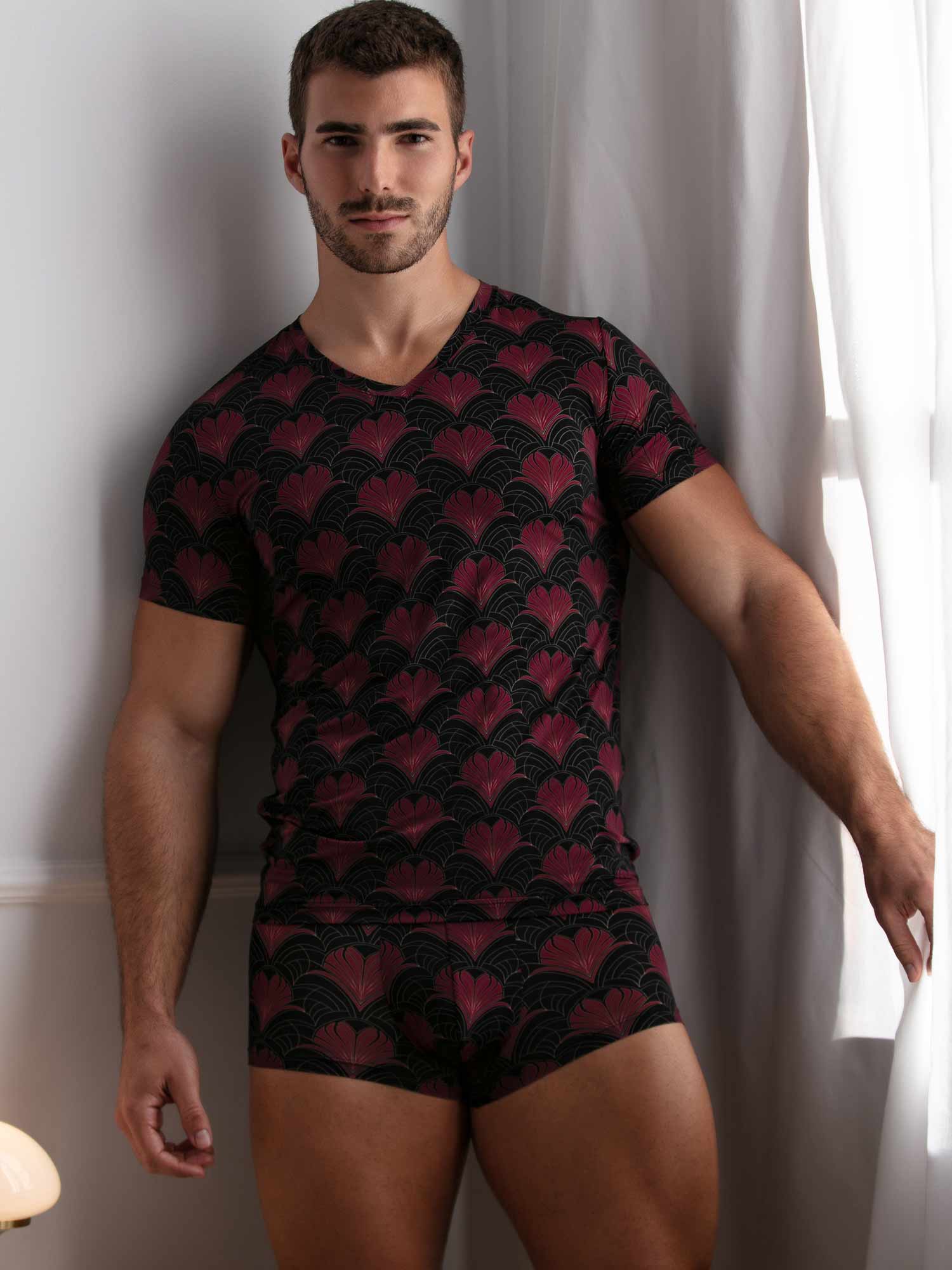 Het Carlyle shirt is meer dan een loungewear basic: het is een statement van stijl en verfijning. Het luxueuze Art Deco-patroon in bordeaux en goud komt prachtig tot zijn recht op de diepzwarte basis. De gladde, ademende microvezel voelt aan als een tweede huid en volgt moeiteloos elke beweging. Het shirt is uitgevoerd met een elegante V-hals en is te combineren met de bijpassende trunk tot een complete set.