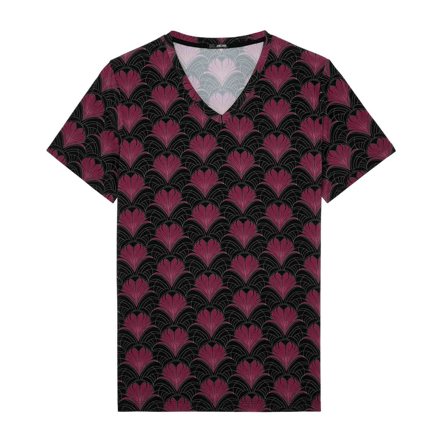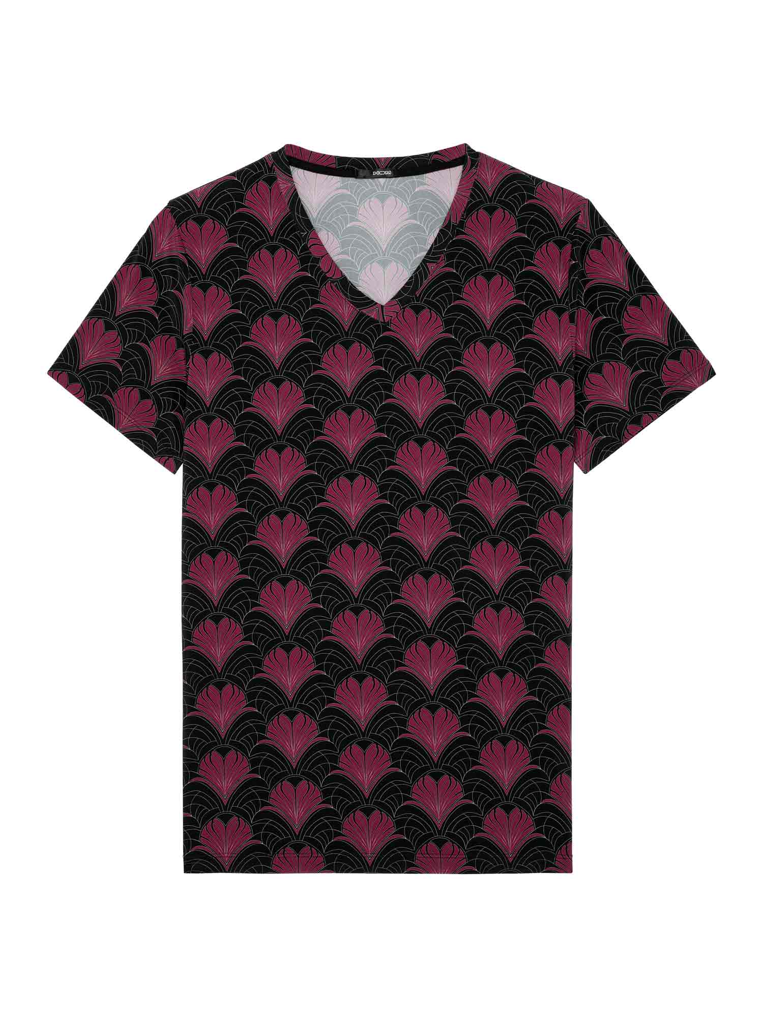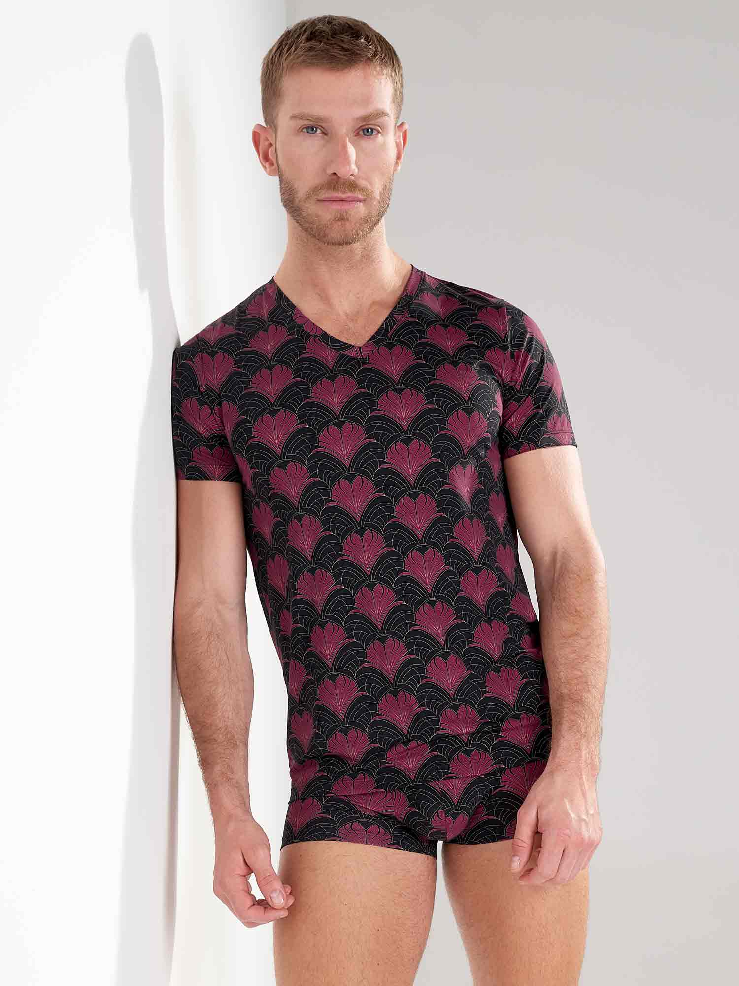 Het Carlyle shirt is meer dan een loungewear basic: het is een statement van stijl en verfijning. Het luxueuze Art Deco-patroon in bordeaux en goud komt prachtig tot zijn recht op de diepzwarte basis. De gladde, ademende microvezel voelt aan als een tweede huid en volgt moeiteloos elke beweging. Het shirt is uitgevoerd met een elegante V-hals en is te combineren met de bijpassende trunk tot een complete set.