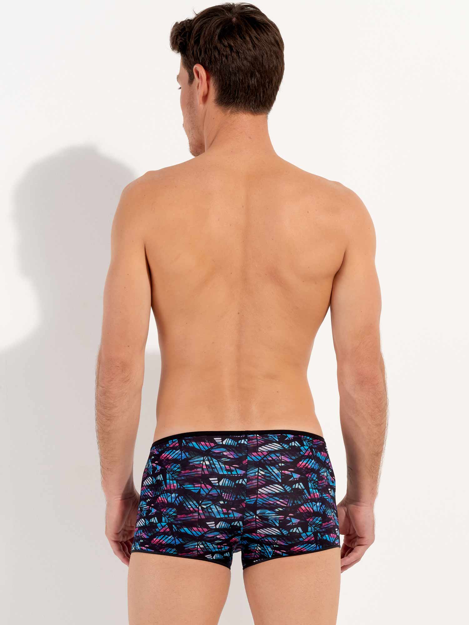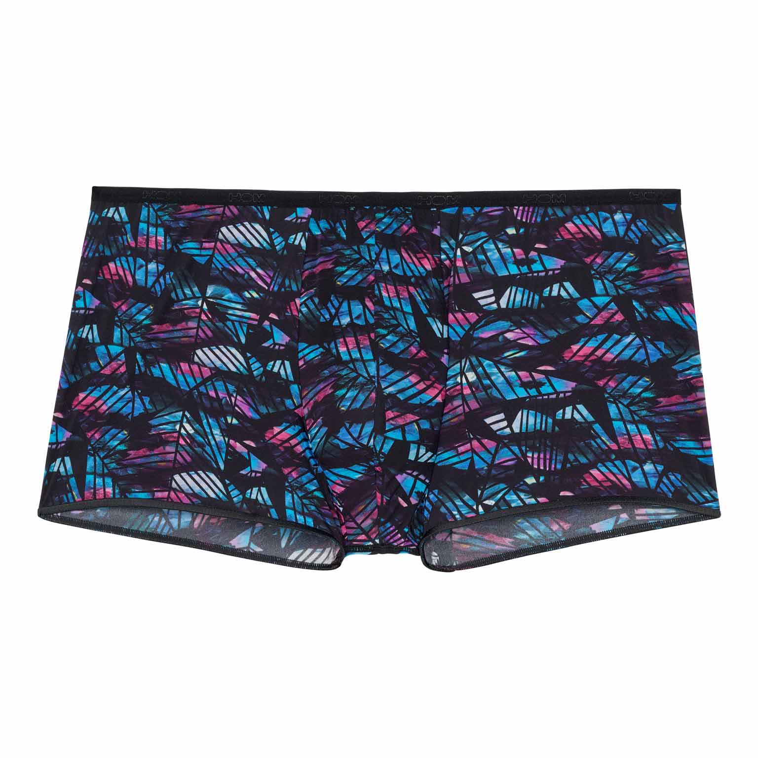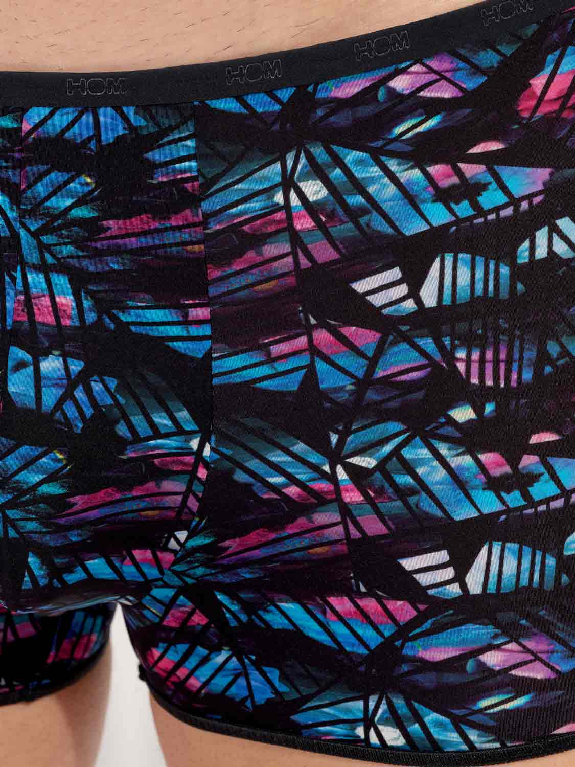 De Blackrock - Trunk is een sensuele toevoeging aan de HOM collectie. Dit korte boxershort draag je laag op de heupen. De stof is gemaakt van een dunne semi-transparante polyamide. De stof is uitgevoerd met een abstracte bloemenprint in blauw en roze op een zwarte achtergrond, bedekt met zwarte geometrische vormen.