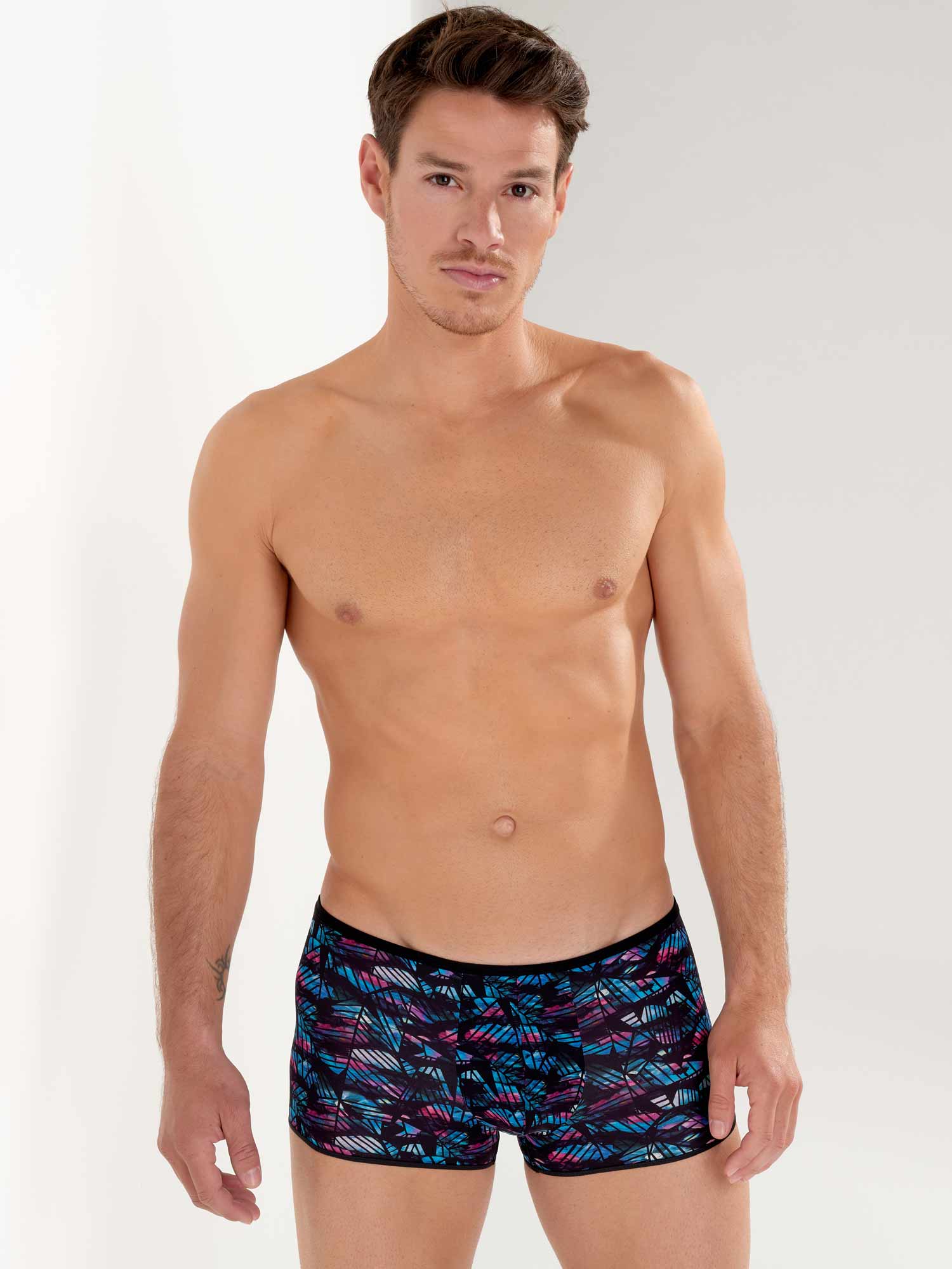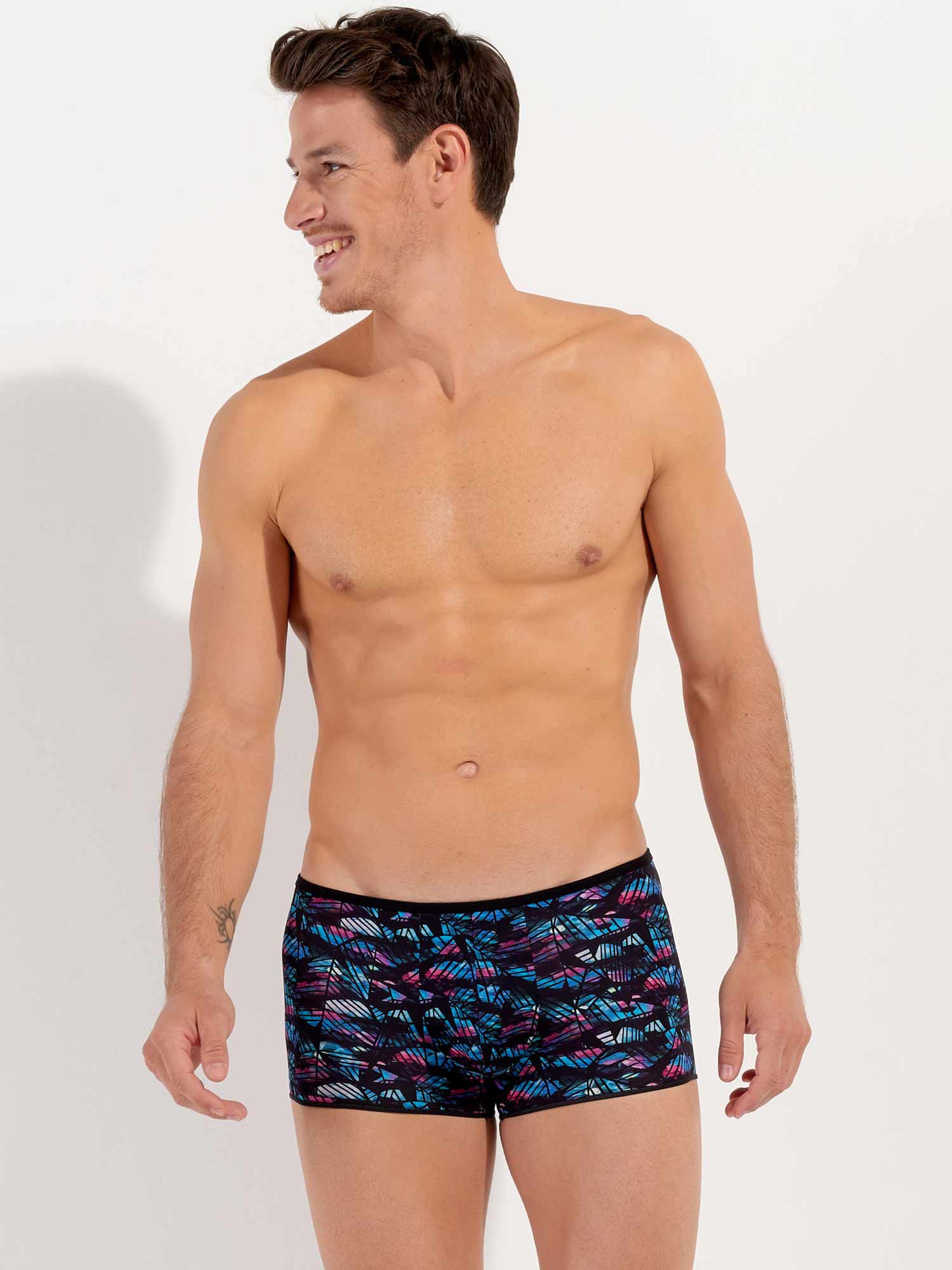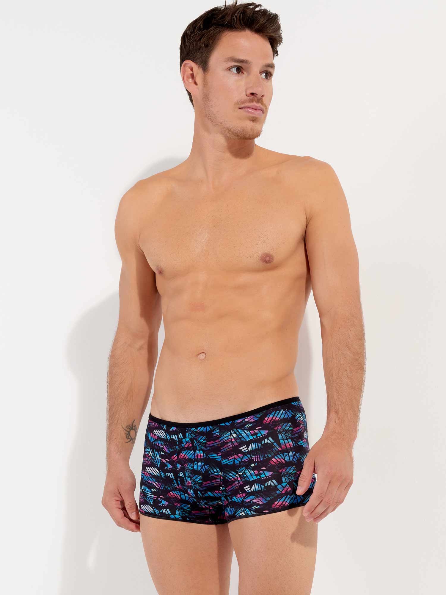 De Blackrock - Trunk is een sensuele toevoeging aan de HOM collectie. Dit korte boxershort draag je laag op de heupen. De stof is gemaakt van een dunne semi-transparante polyamide. De stof is uitgevoerd met een abstracte bloemenprint in blauw en roze op een zwarte achtergrond, bedekt met zwarte geometrische vormen.