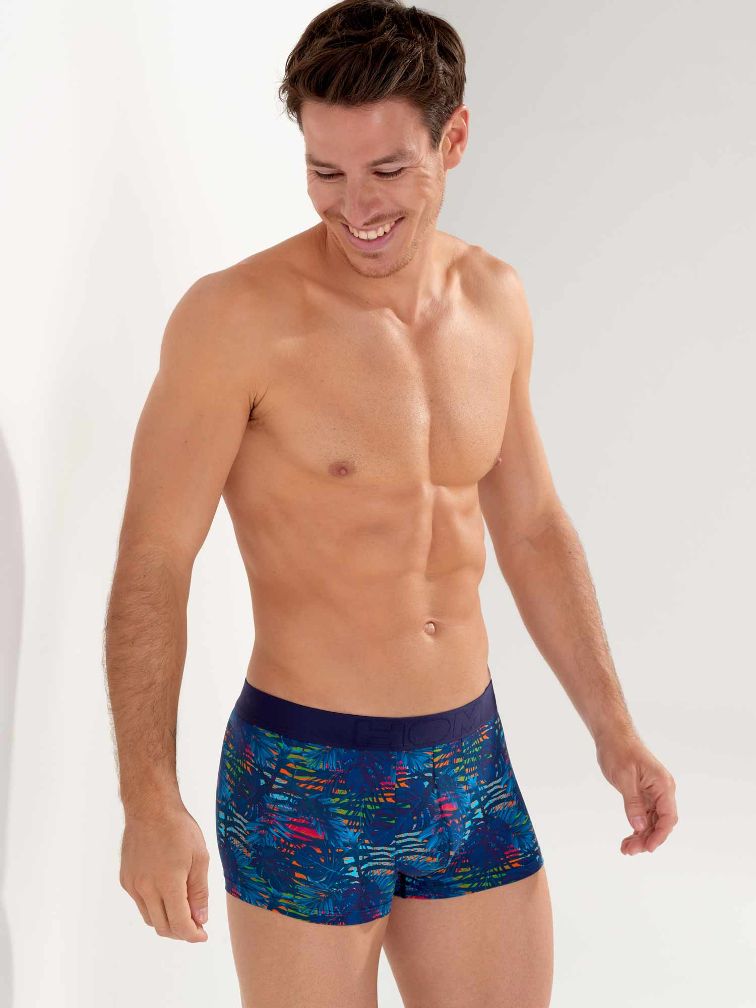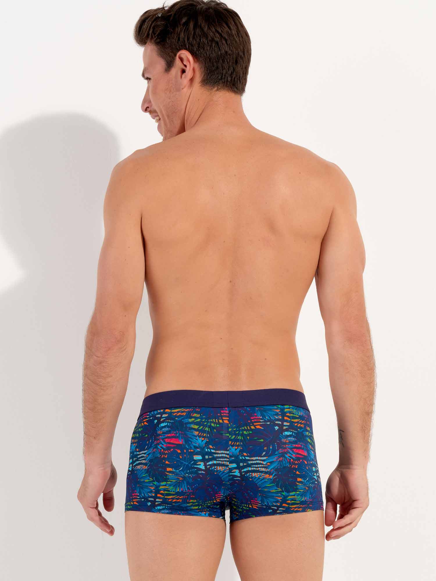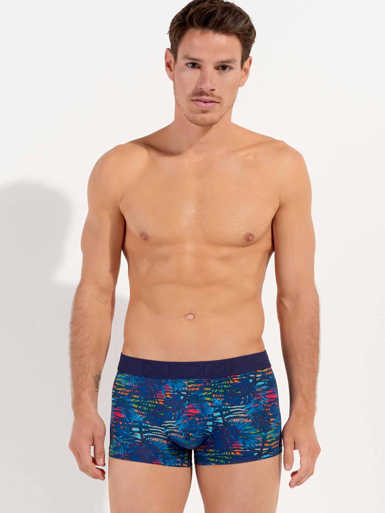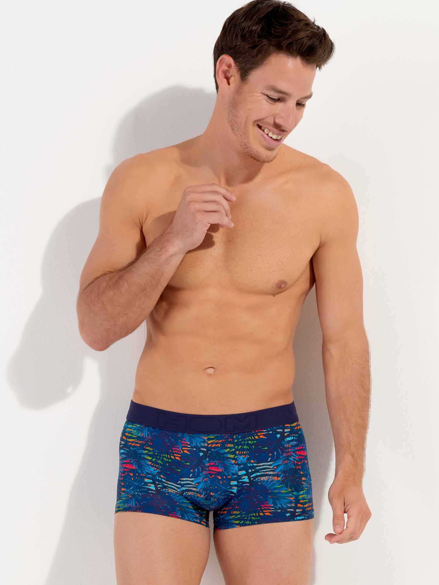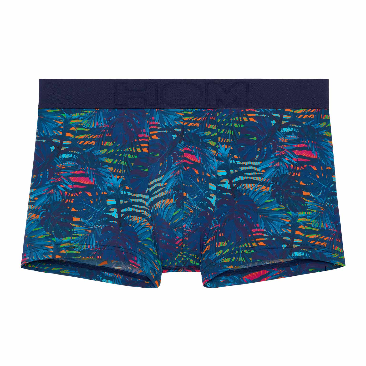 De Dreamland - Trunk is gemaakt van een comfortabele microfiber. De Dreamland is uitgevoerd in een donkerblauw tropisch patroon op een kleurrijke camouflage-achtige bloemenachtergrond. De elastische heupband in de kleur marine blauw is gemaakt van katoen met daarop het HOM Logo in ton sur ton.