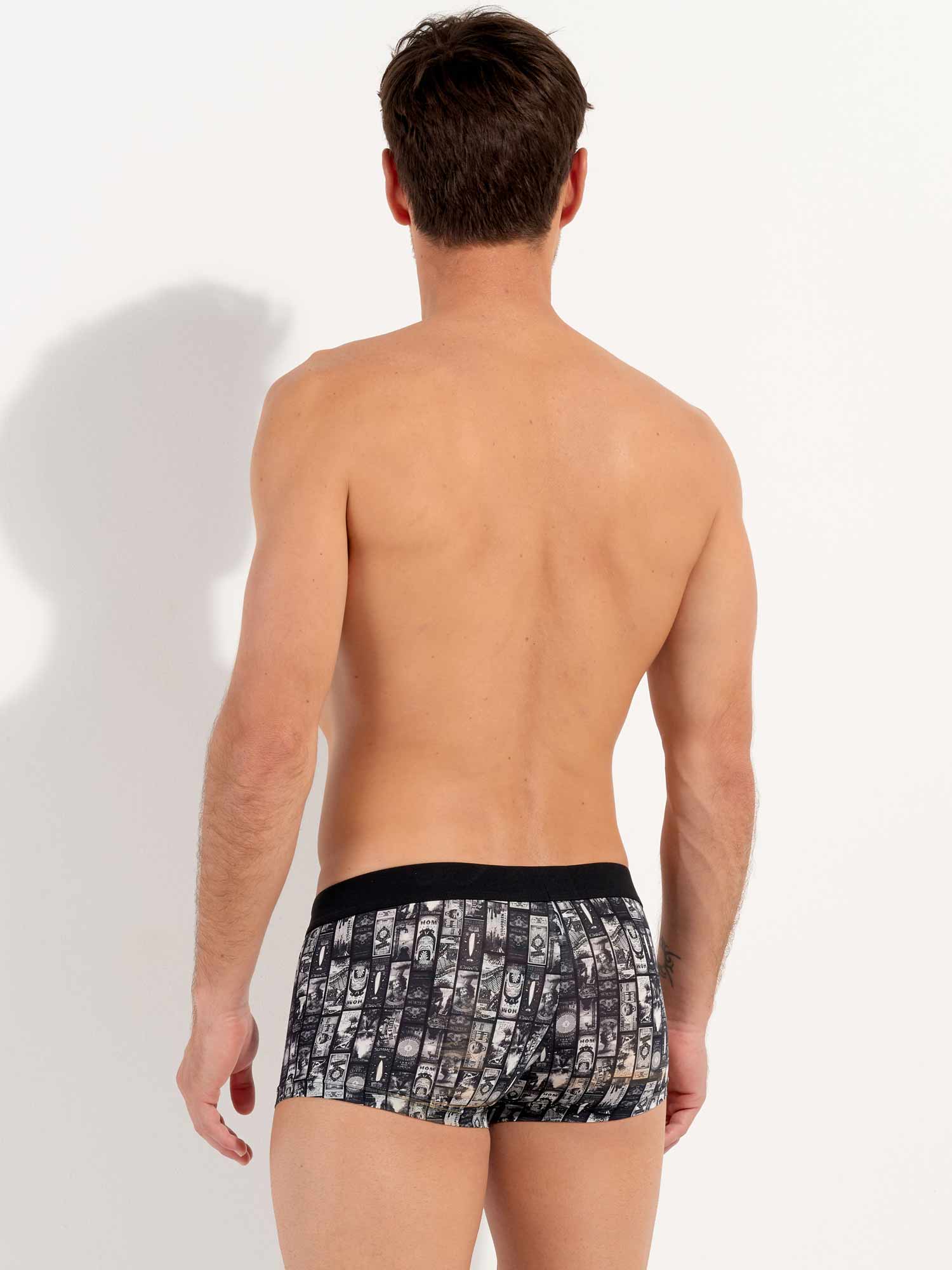 De Rockcity kenmerkt zich door figuratieve tekeningen in zwart-wit van Burning Man festivalkaartjes. De trunk is gemaakt van een zachte licht transparante microfiber die nauw aansluit op de huid voor een speels en sensueel effect. De trunk behoort tot de Temptation collectie, voor de man die de code der verleiding kent. De trunk draag je laag op de heupen en is bij zichzelf al een waar mode statement. De brede heupband is gemaakt van katoen en ligt comfortabel op de huid.