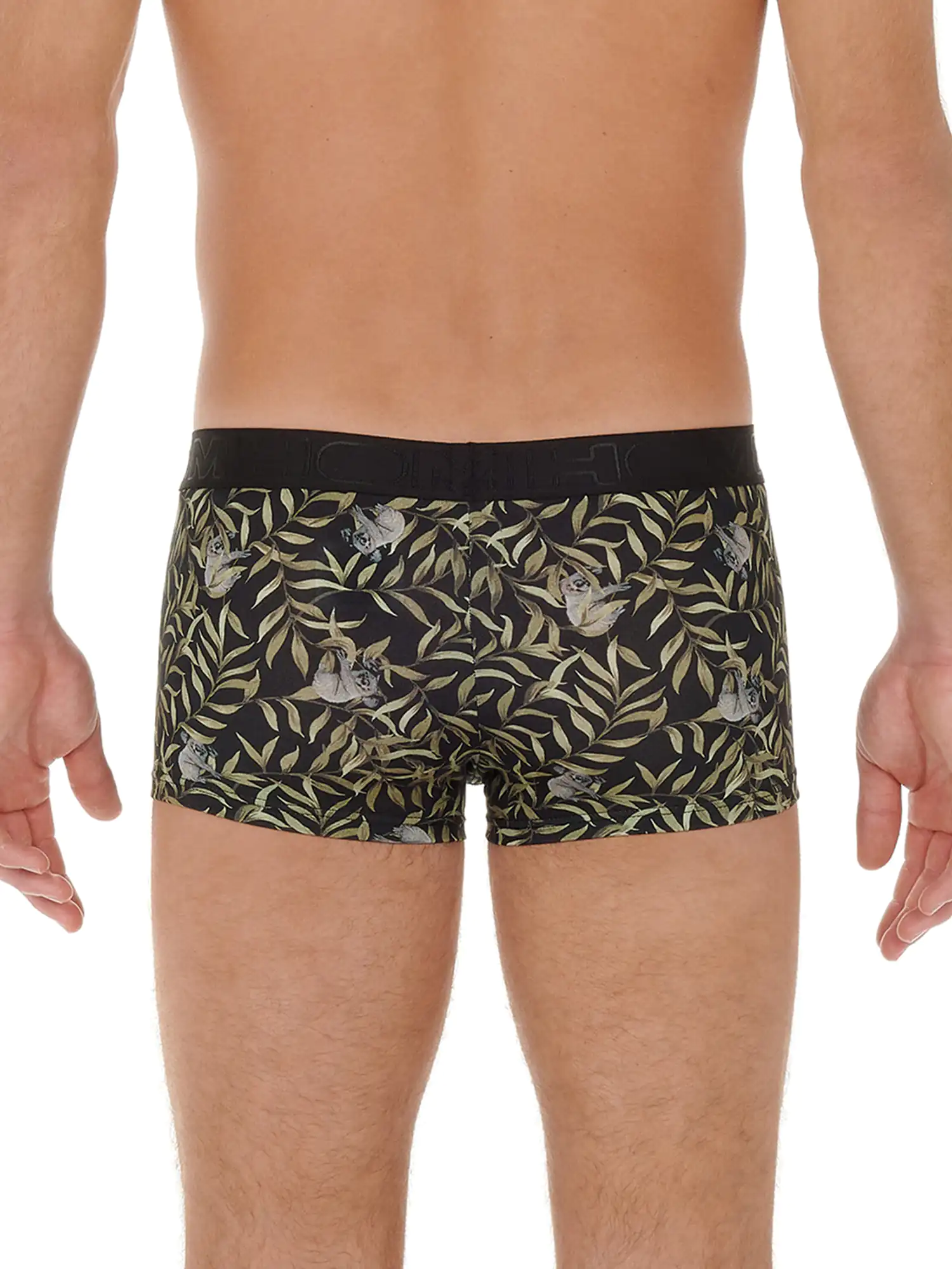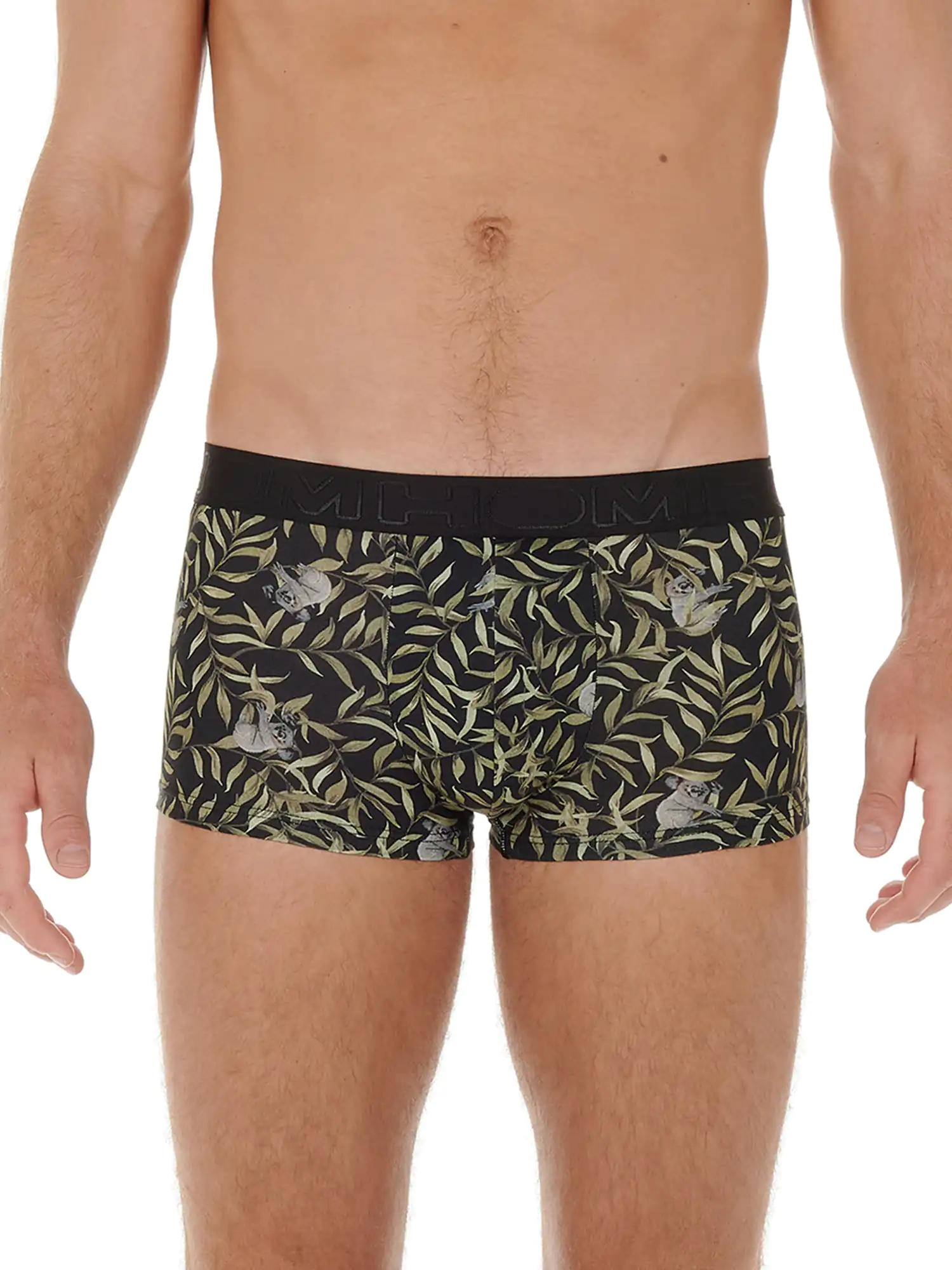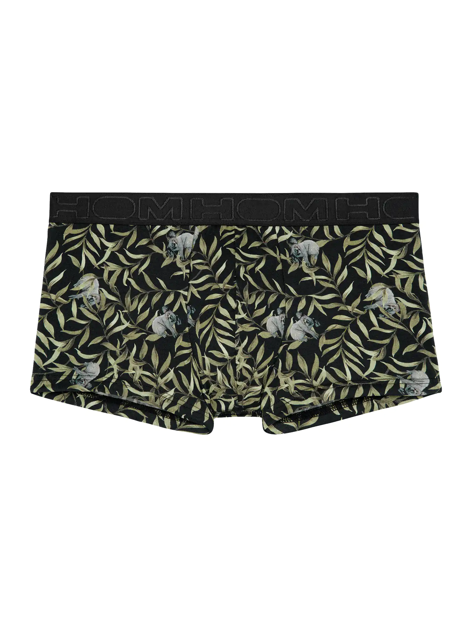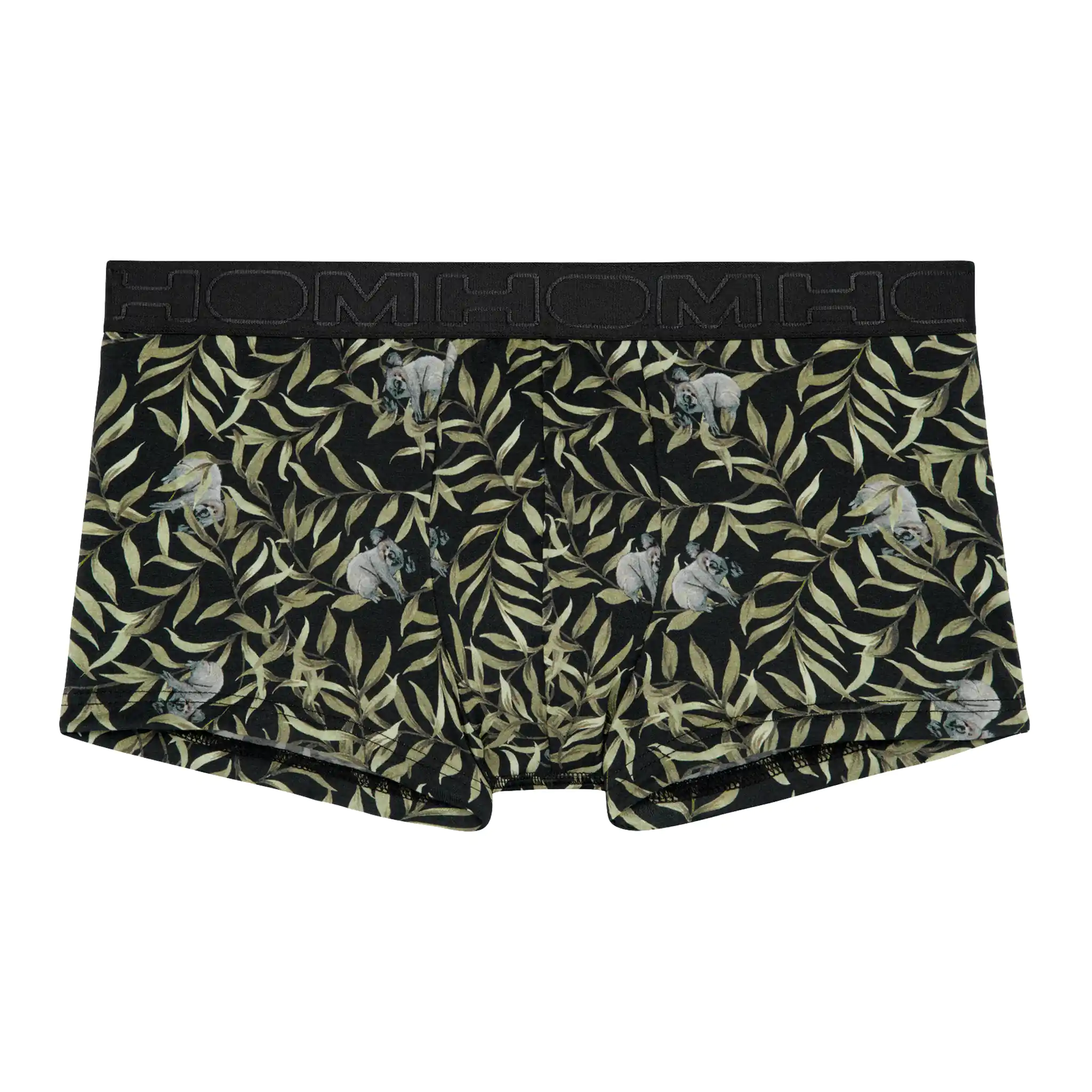 De Ted Trunk is gemaakt van een comfortabele katoenmodal mix en uitgevoerd met een speelse animal print met koala's op een bladerpatroon met een zwarte achtergrond. De katoenmodal mix voelt zacht aan en zorgt voor een pasvorm die goed aansluit op het lichaam. Daarnaast heeft katoenmodal goede absorberende en ademende eigenschappen, waardoor je veel minder snel warme klamme plekken krijgt in je ondergoed. Doordat katoen en modal beide een natuurlijke oorsprong hebben, is de Ted geschikt voor iedere man die graag natuurlijke stoffen draagt. Bij normaal gebruik is de stof goed bestand tegen krimpen en slijtage door wrijving. De Trunk is een modieuze heren boxer die korter is dan de reguliere boxer briefs. De brede heupband is uitgevoerd in het zwart met het logo van HOM in ton sur ton.