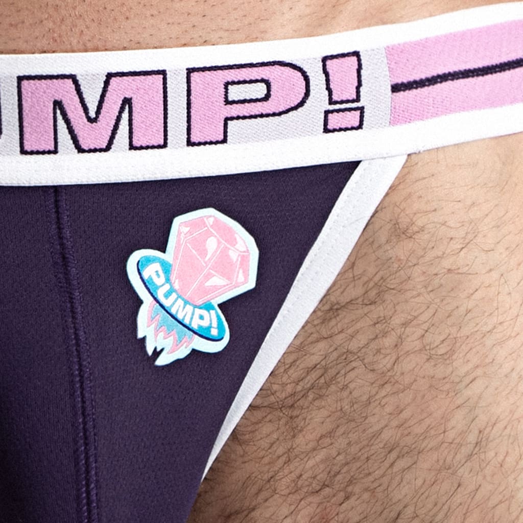 Heerlijk speels! De Jock Purple Space Candy van PUMP!. Gemaakt van zacht katoen in een donkere kleur paars met witte biezen en stiksels. De Jockstrap heeft een zachte heupband van 4 cm en comfortabele straps. Op de voorzijde van de Purple Candy Jockstrap is een speelse badge geborduurd. Wie wil er nu niet met jou spelen?
