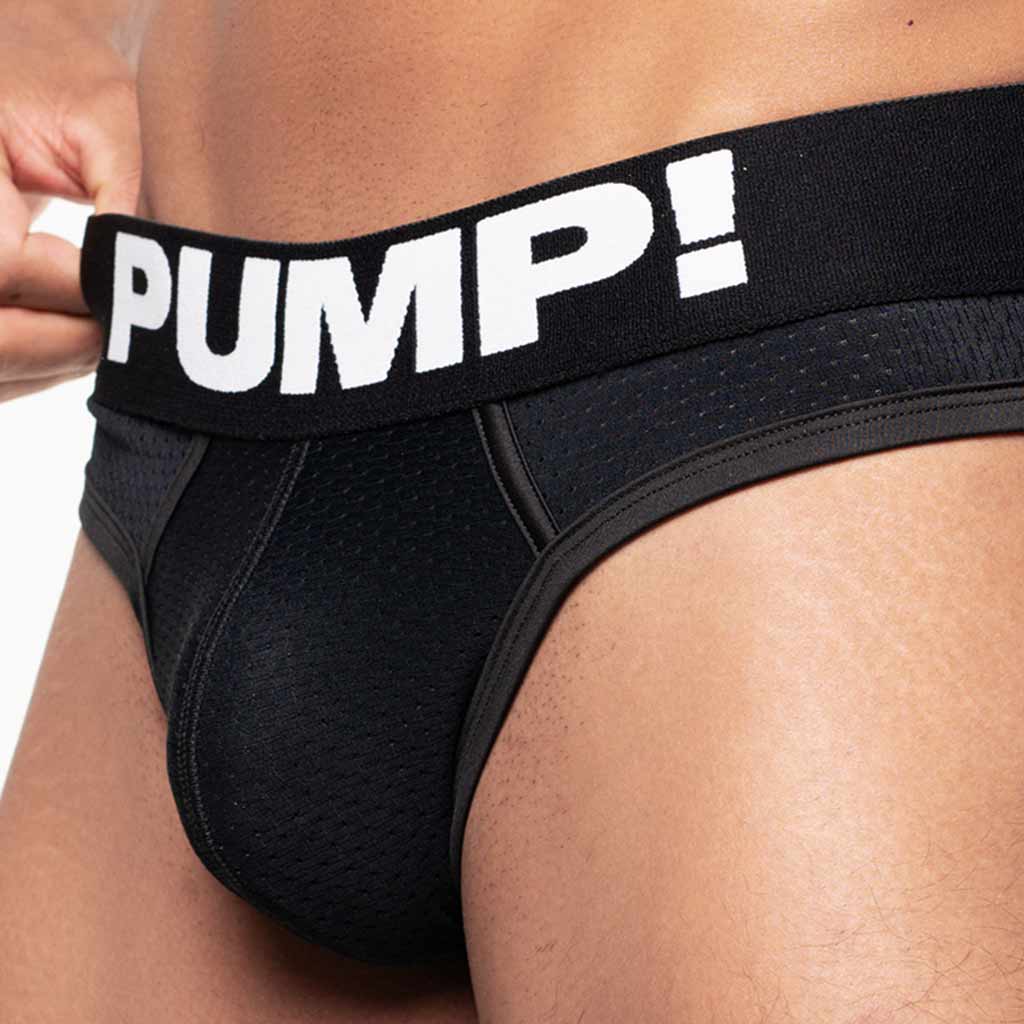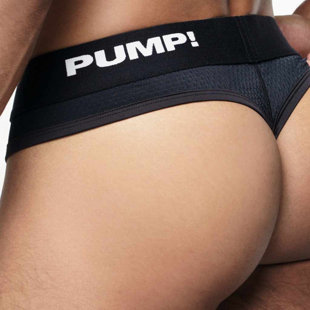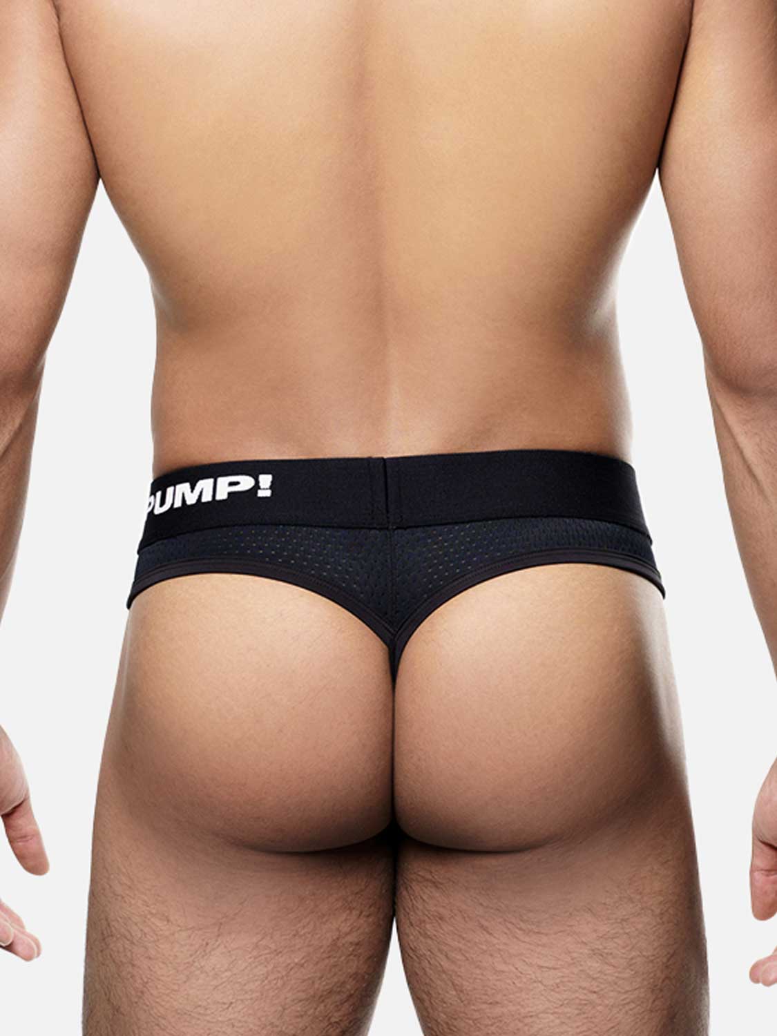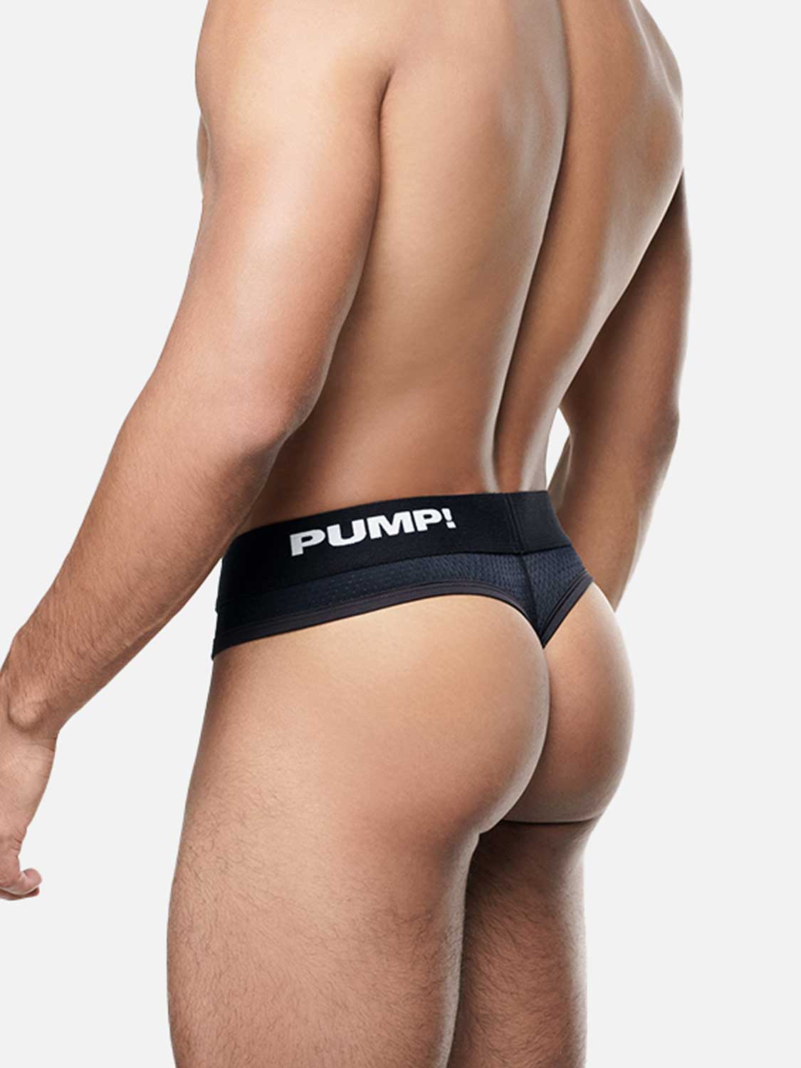 Een klassieke string van PUMP! gemaakt van microfiber. De string heeft een tailleband van maar liefst 5 cm breed voor extra support rondom de heuplijn en een full front panel, zodat de string aan de voorzijde een slip lijkt. De body is volledig uitgevoerd in mesh met microfiber randen voor een comfortabele fit. Volledig uitgevoerd in zwart met het PUMP! logo in contrasterend wit op de heupband.