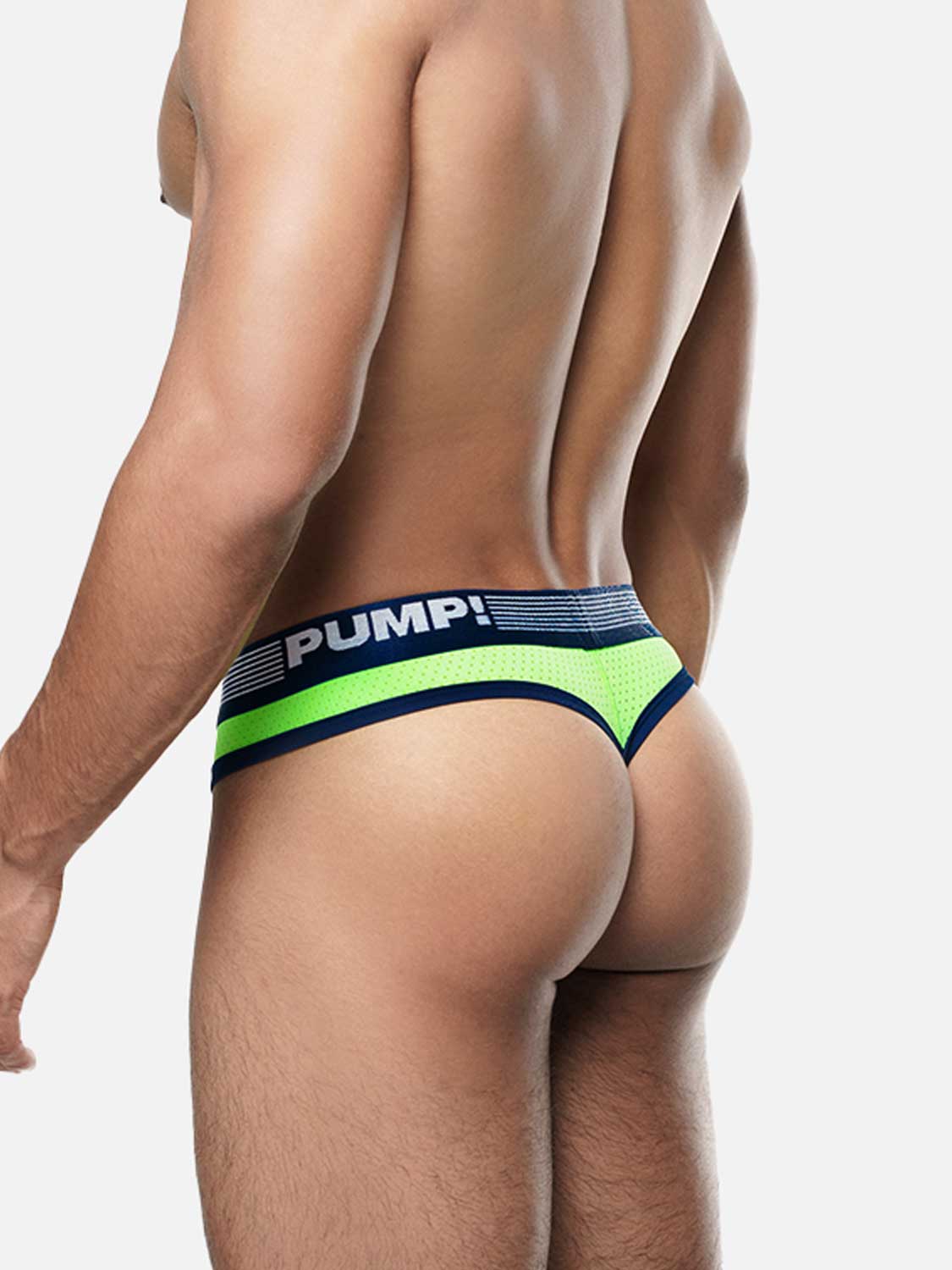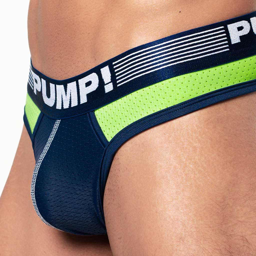 De Surge String van PUMP! heeft een opvallende mesh body in appeljes groen! De string is flexibel bij elke beweging en heeft een PUMP! tailleband van 4 cm breed uitgevoerd met een full front panel, waardoor de string aan de voorzijde een reguliere slip lijkt. De marine blauwe cup is gemaakt van een zachte fijnmazige mesh, wat goed ademt en je een zachte lift en ondersteuning geeft waar nodig.