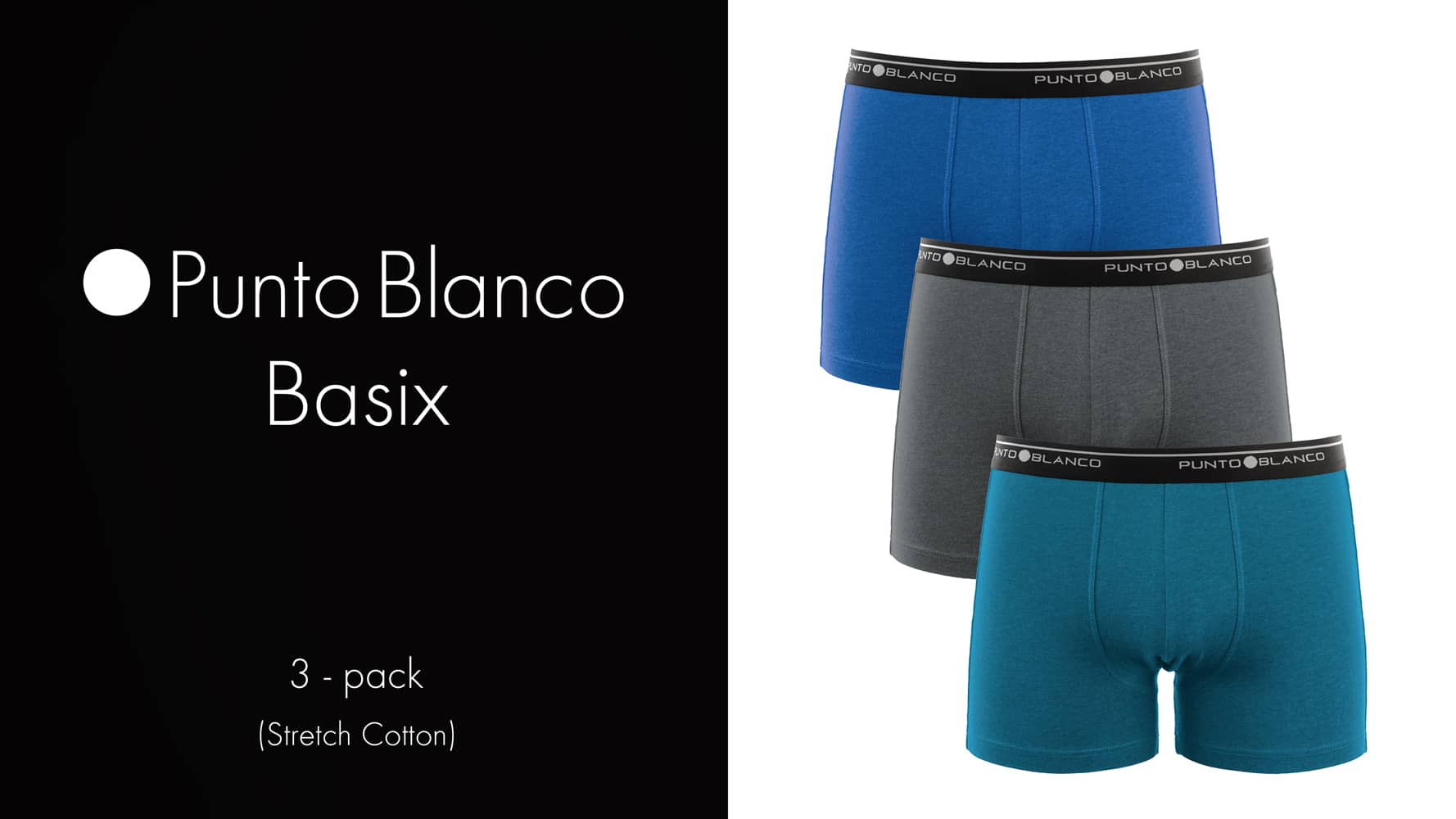 De Basix serie staat voor eenvoud; goed ondergoed en voordelig geprijsd. De Basix zit al jaren in het assortiment van Punto Blanco en heeft zichzelf dan ook al overtuigend bewezen. Met de Basix Boxer Briefs koop je een goede degelijke boxer, geschikt voor alledaags gebruik. De Basix boxers zijn gemaakt van 93/7 stretch katoen voor een comfortabele fit die langer behouden blijft. Dit voordeelpack beschikt over 3 boxers in diverse kleurcombinaties met een contrasterende elastische heupband met daarop het Punto Blanco logo rondom. Het logo is aan de voorzijde niet gecentreerd.
