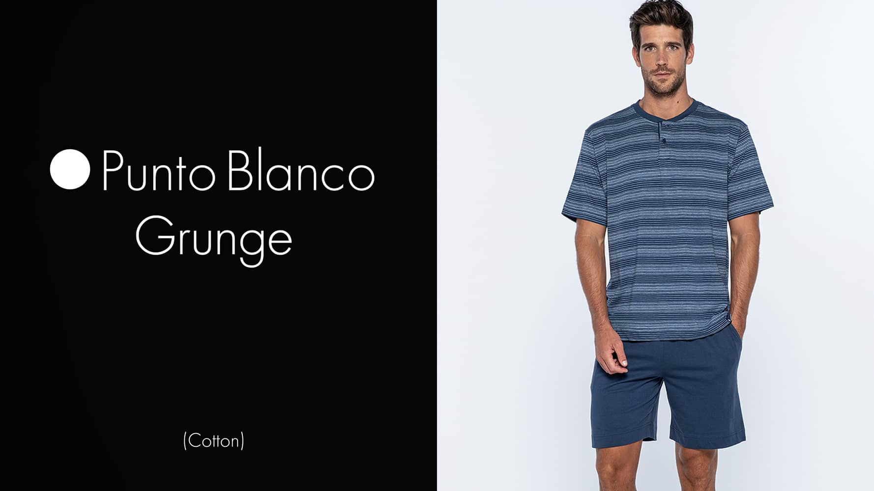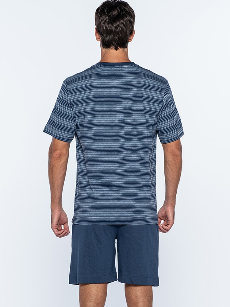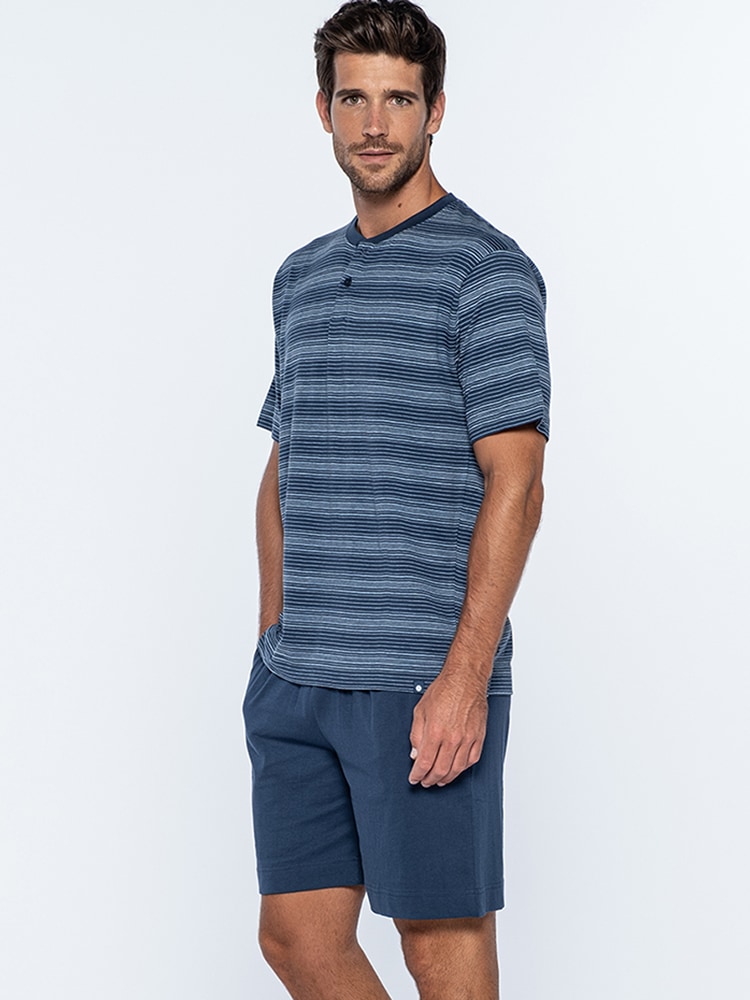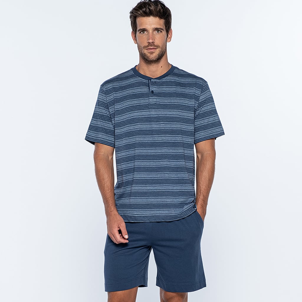 Shortama gemaakt van 100% katoen met een T-shirt in blauw met korte mouwen en een open ronde hals met knopen. Het shirt is uitgevoerd met strepen in twee tinten blauw, gecombineerd met een effen blauw short met zakken en een heupband met trekkoord.