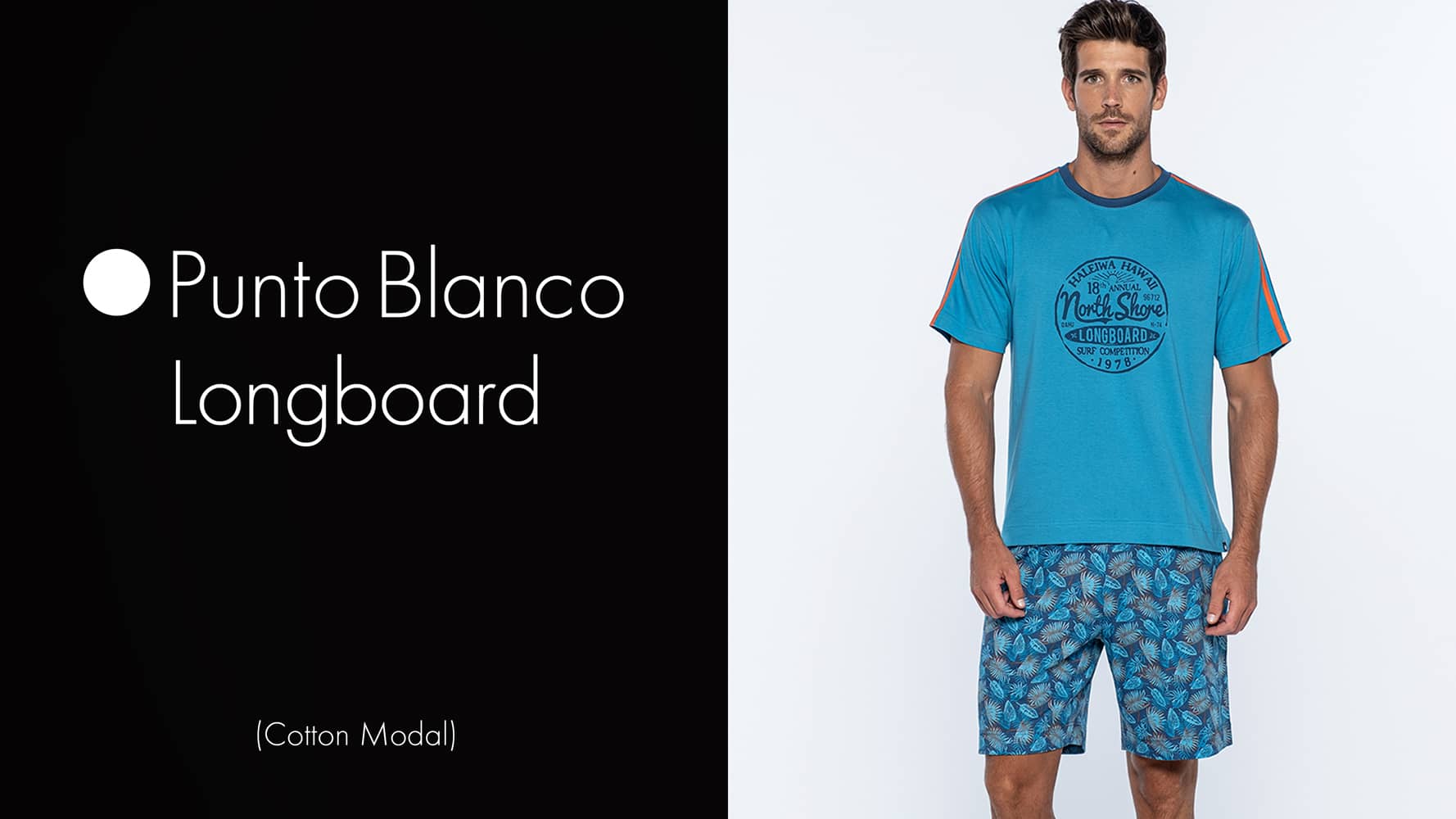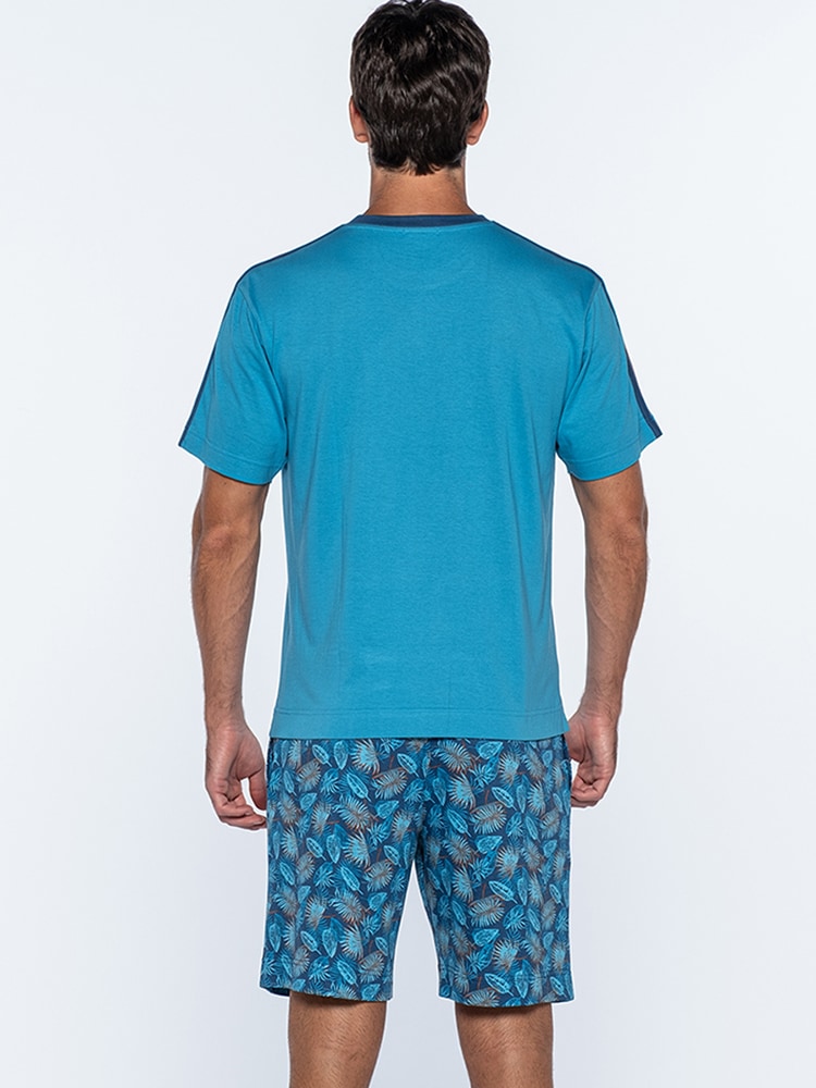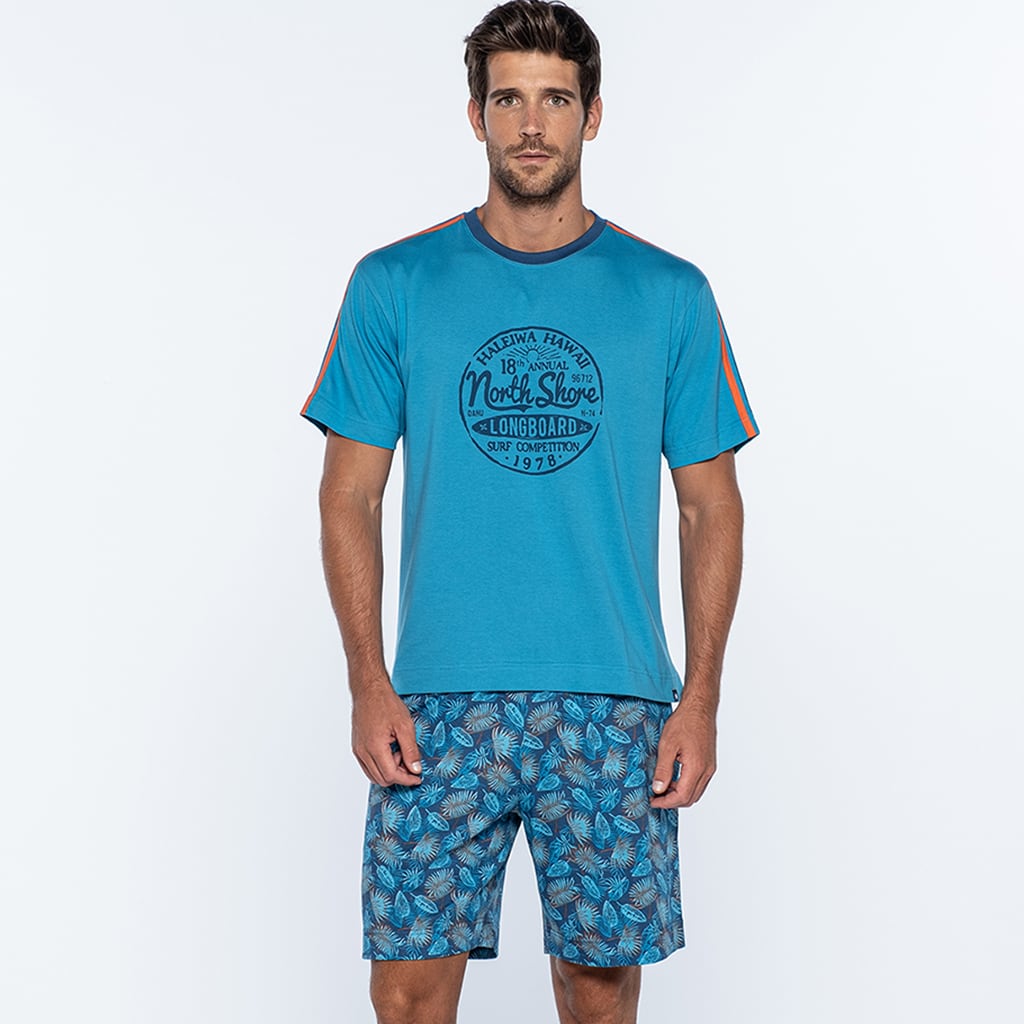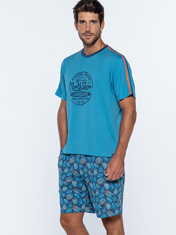 Het T-shirt met ronde nek, is uitgevoerd in blauw met een print op de voorzijde en een oranje streep over de mouwen. Het ontwerp heeft een warme tropische look. De bijpassende broek heeft een blader-print in de kleuren blauw/oranje met steekzakken links en rechts. In de heupband bevindt zich een trekkoord om de broek perfect op maat te brengen.