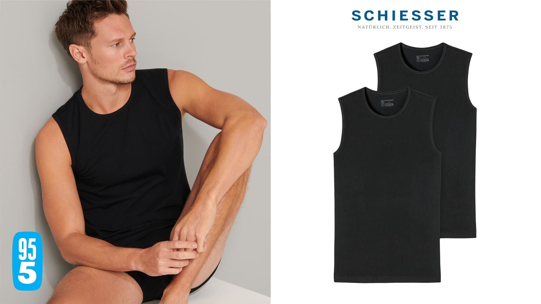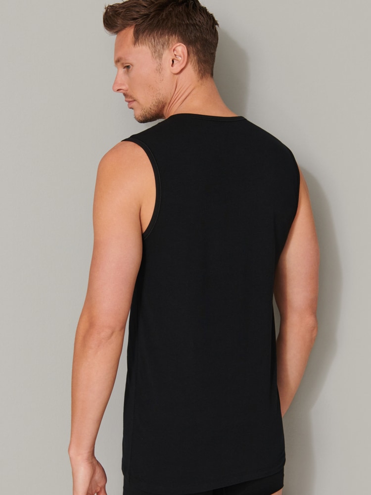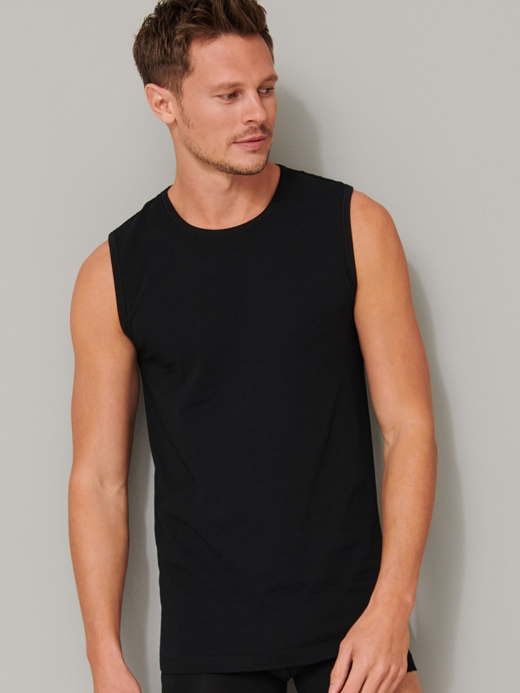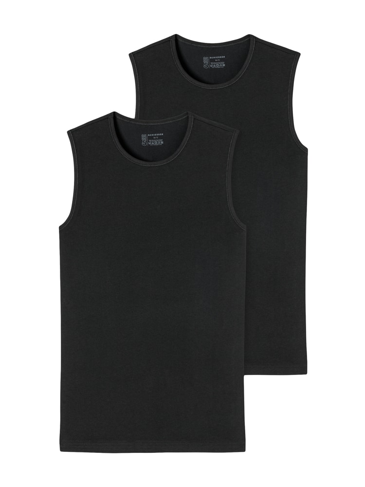 2 Tanktops voor de man in een dubbelpack, uit de populaire SCHIESSER-serie "95/5". De tanktops hebben een ronde hals en zijn gemaakt van 95% natuurlijk biologisch katoen en 5% elastan, Ze zijn gebreid in een perfect passende elastische single jersey kwaliteit. De 95-5 tantkops kun je wassen op een temperatuur tot 60 graden.