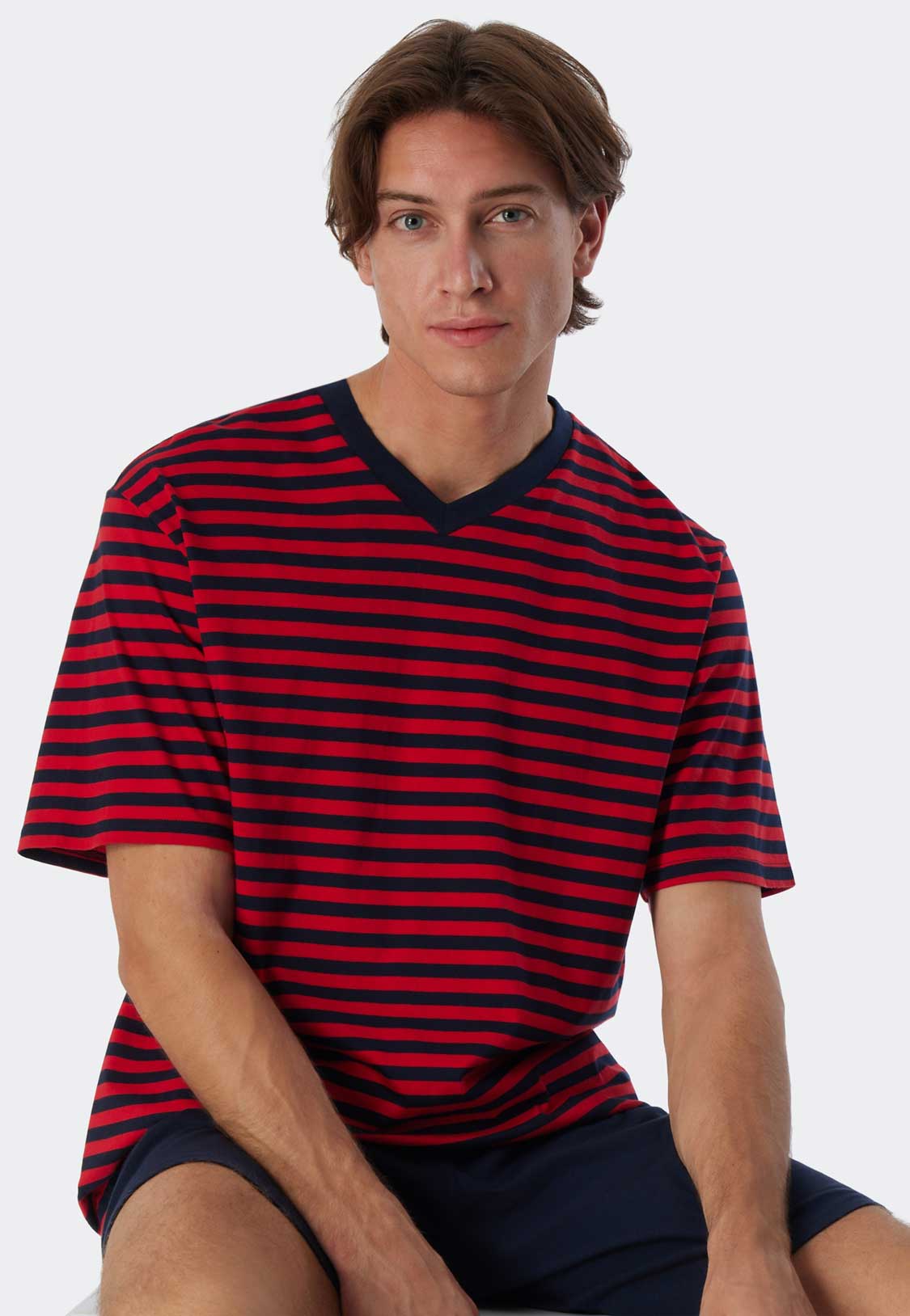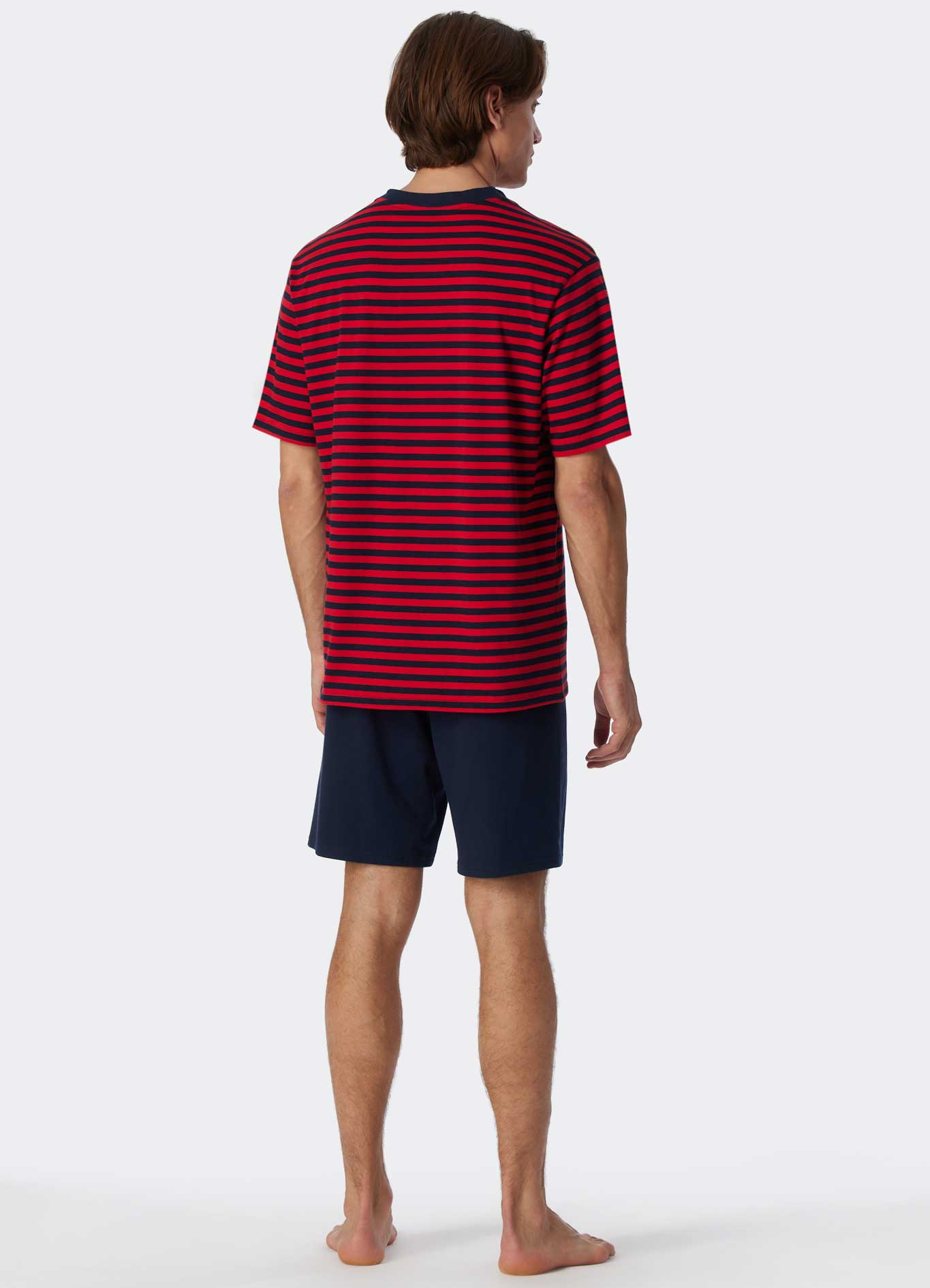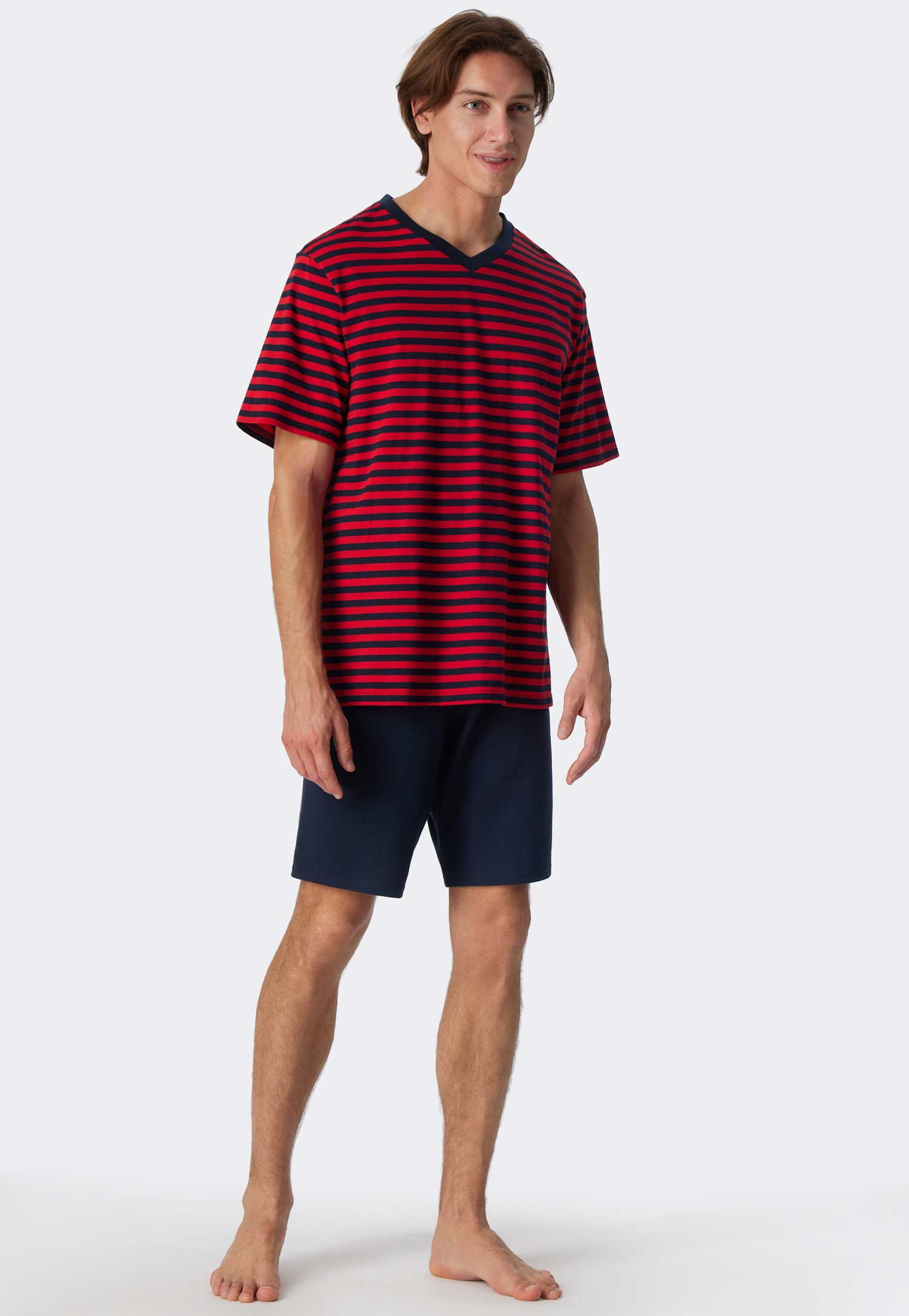 Korte heren pyjama van Schiesser gemaakt van 100% katoen. De pyjama beschikt over een effen short en een shirt met contrasterende strepen en een V-hals. De korte broek is uitgevoerd met een trekkoord in de heupband. De pyjama zit ruim en comfortabel en kun je wassen op een temperatuur van 60 graden.