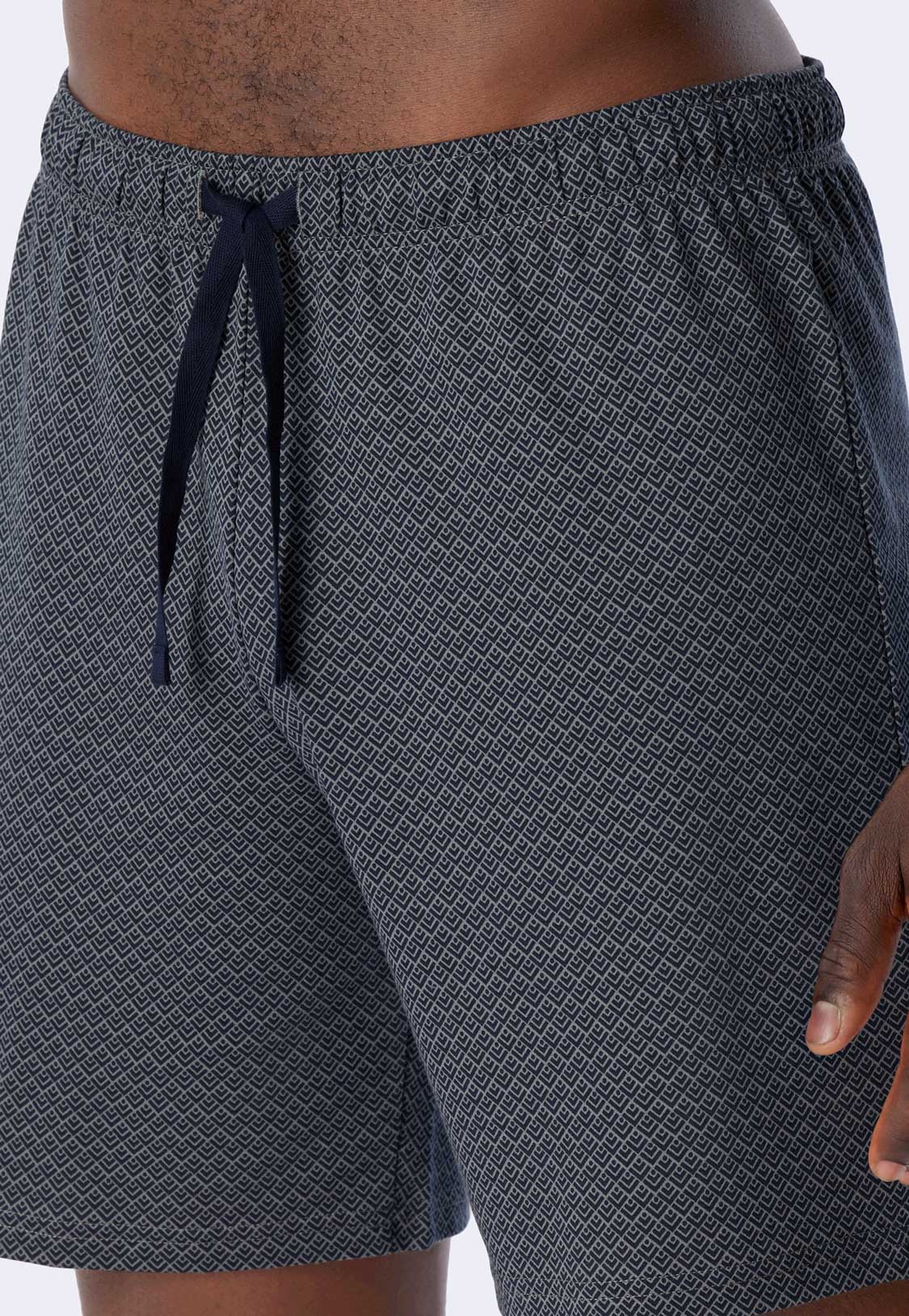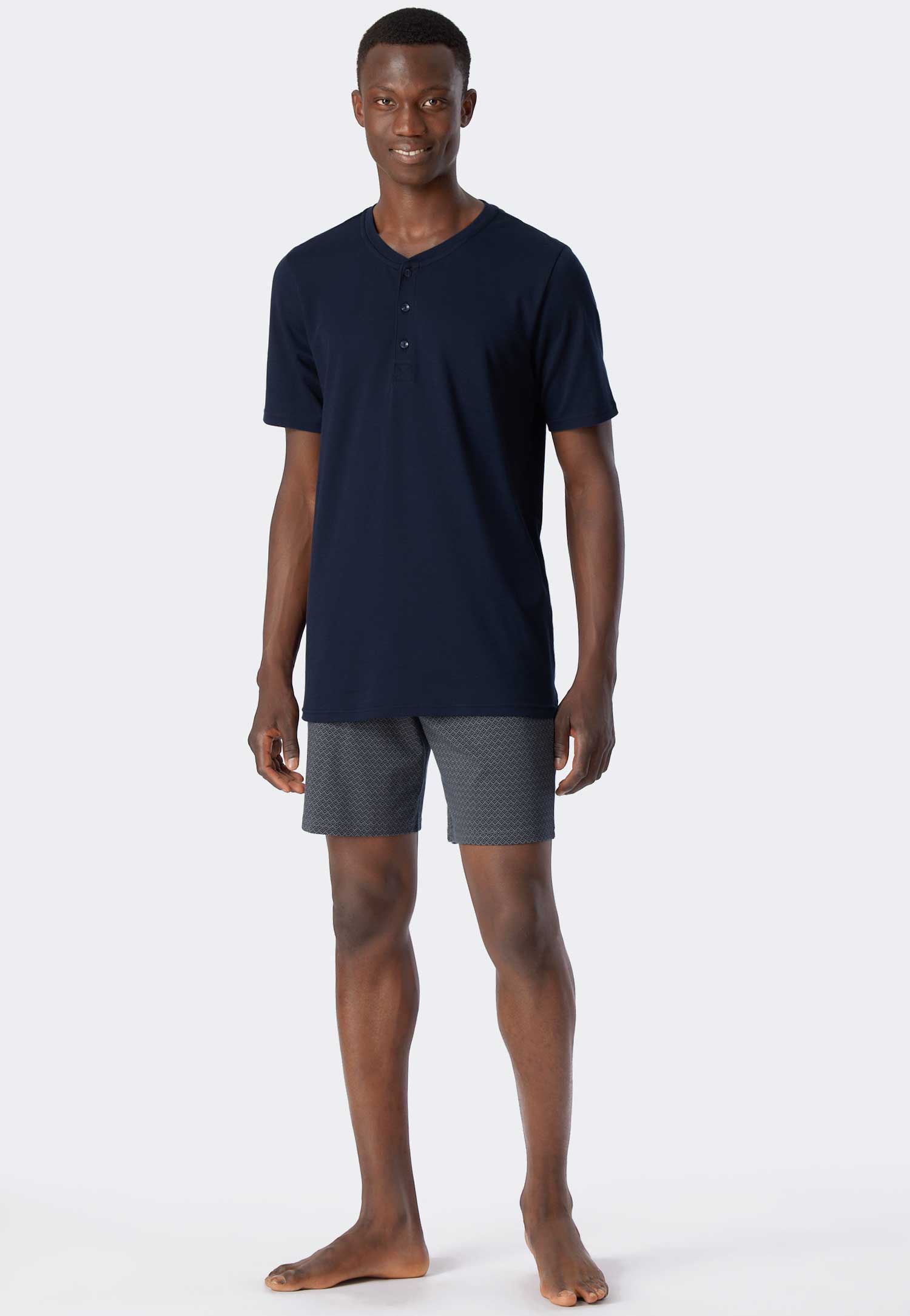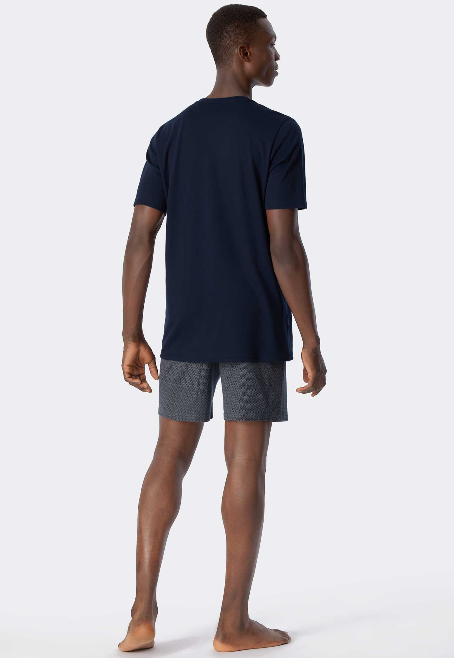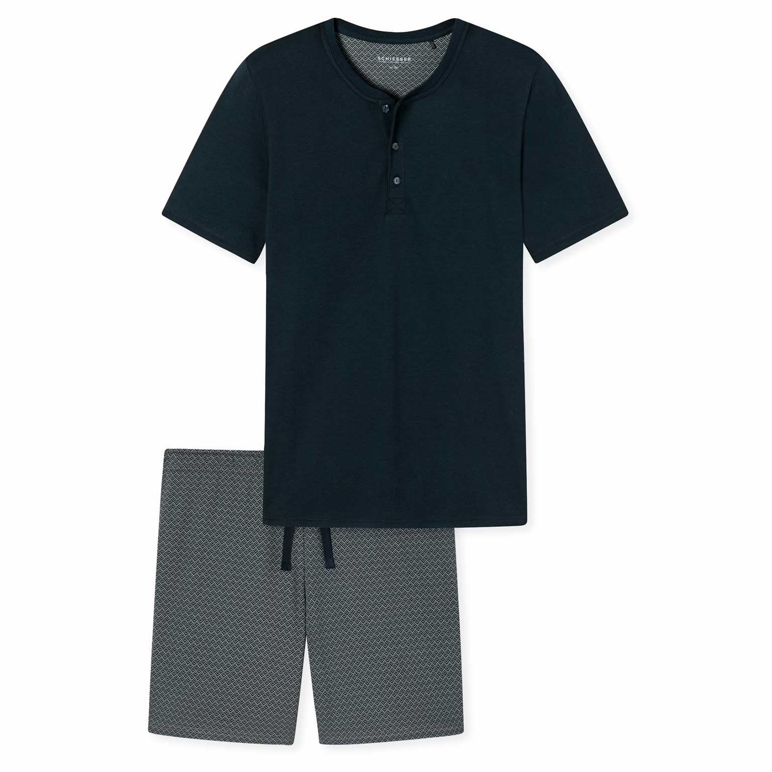 Korte heren pyjama van Schiesser gemaakt van 100% katoen, met een effen shirt en een short met een opvallend patroon. De pyjama heeft een shirt met ronde hals en een short met een trekkoord in de heuplijn voor een verstevigde fit. Geproduceerd met een interlock kwaliteit met een casual look en feel.