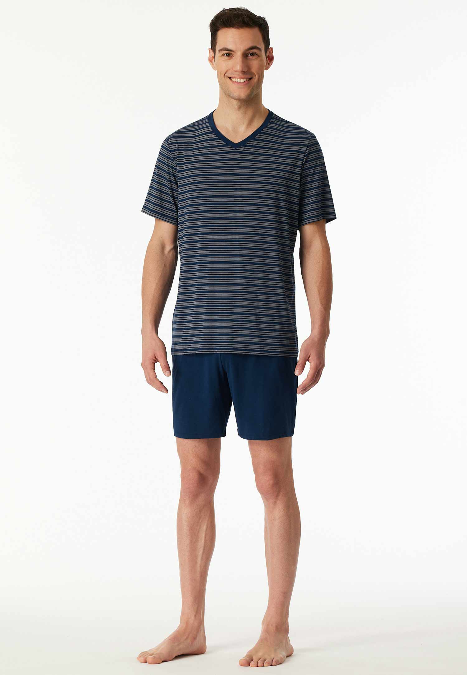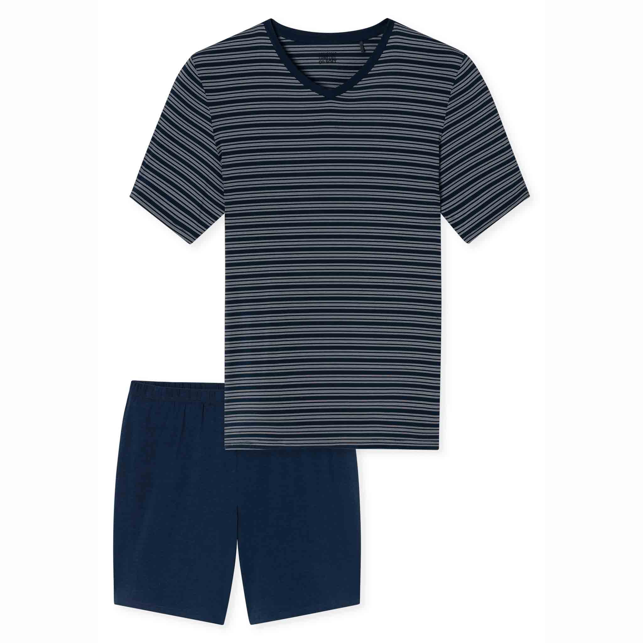 Deze shortama uit de Long Life Soft serie van Schiesser is een comfortabele en duurzame keuze voor warme nachten. Het donkerblauwe shirt is voorzien van een modern streeppatroon en V-hals, en wordt gecombineerd met een effen short in bijpassende kleur. Dankzij de hoogwaardige modalmix voelt de stof heerlijk soepel en glad aan, terwijl het optimale vochtmanagement en de vormvastheid zorgen voor langdurig draagcomfort. Perfect voor de man die kiest voor tijdloze kwaliteit in zijn nachtkleding.