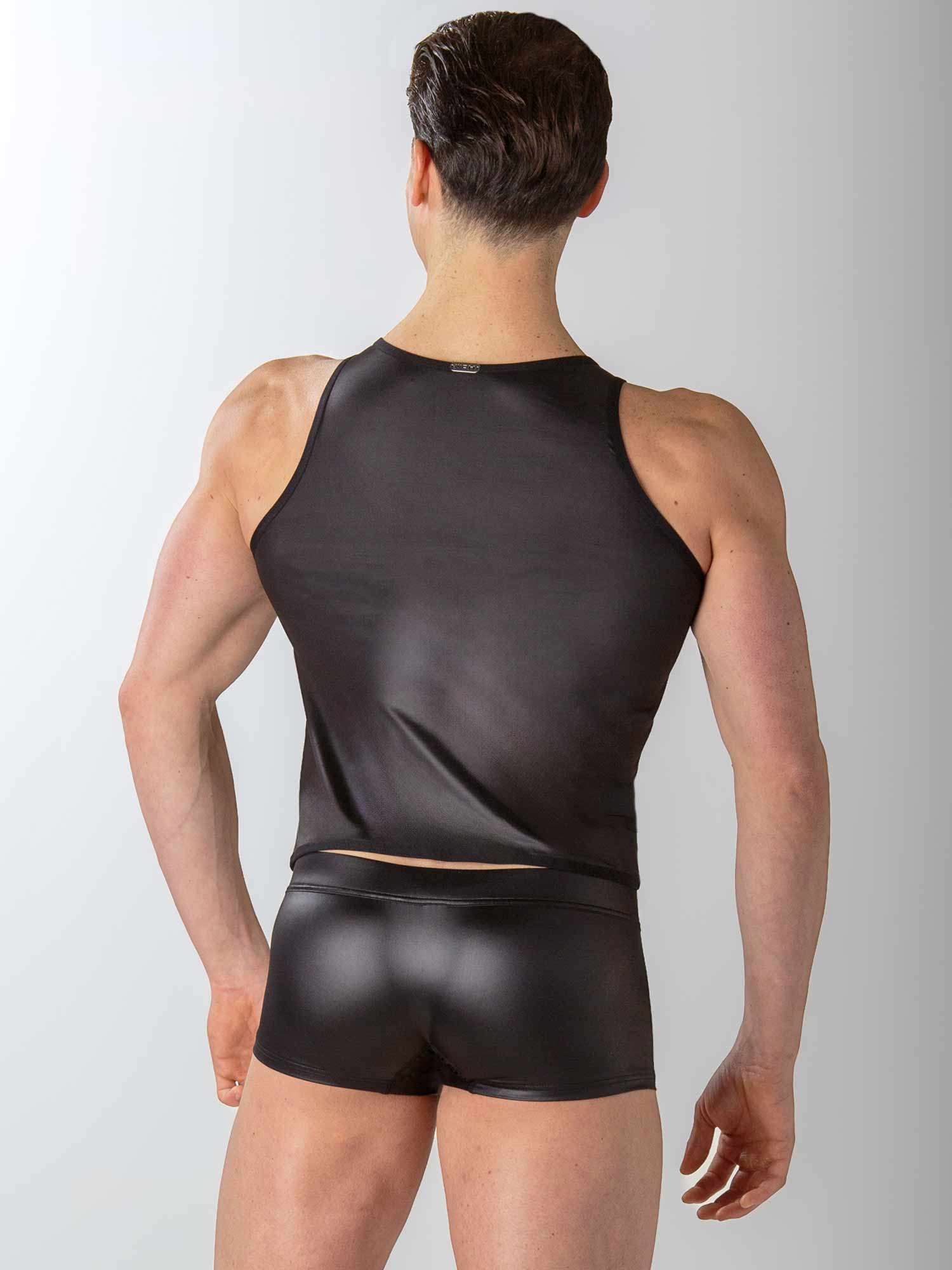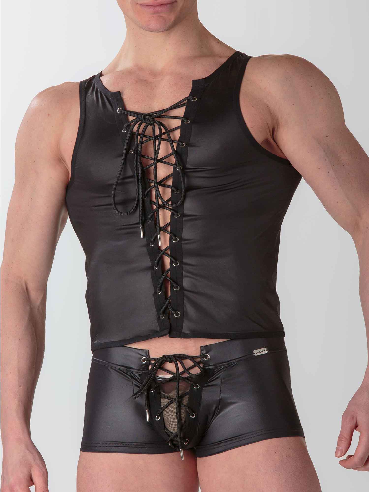 De Night Universe Tanktop van WOH is het ultieme kledingstuk voor een dominante en verleidelijke look. Gemaakt van zwarte vinylstof met leerachtige glans en een diepe vetersluiting aan de voorkant, straalt deze top pure erotiek uit. De achterkant is van transparante mesh die je rug accentueert. Ideaal voor een clubavond of een intiem moment waarop je wilt opvallen en verleiden.