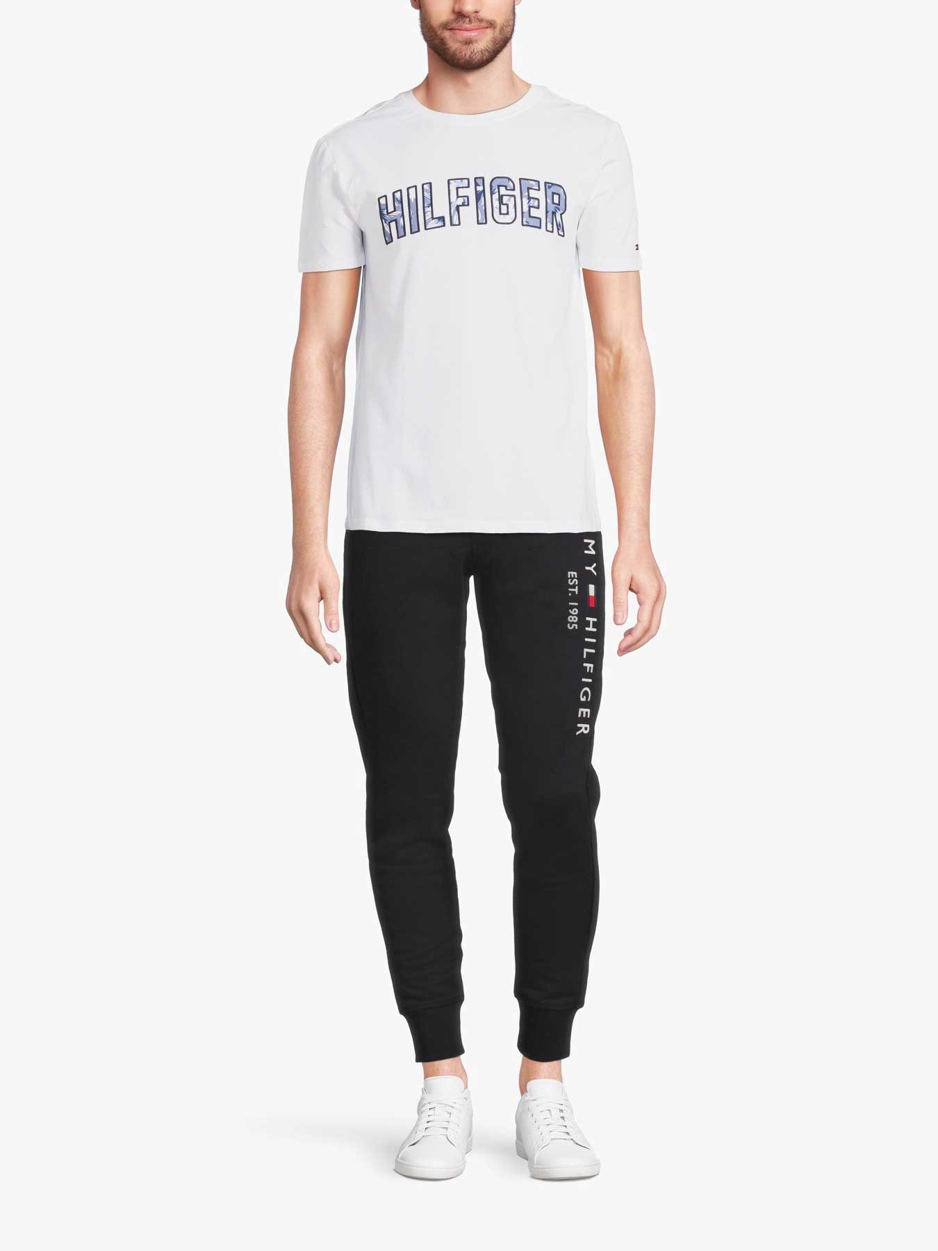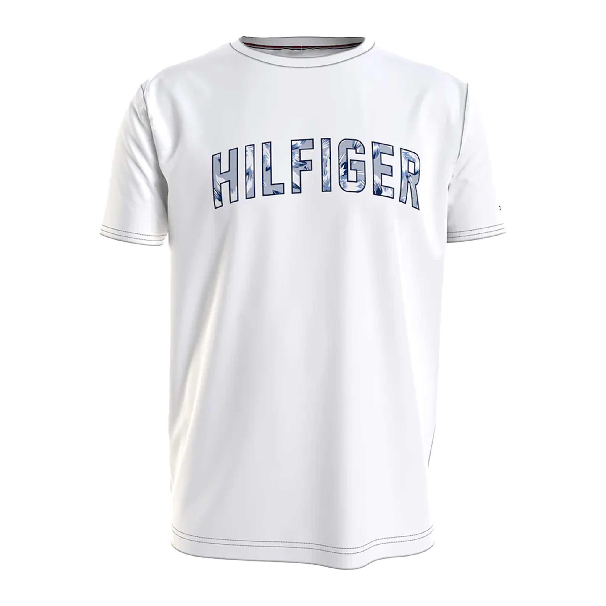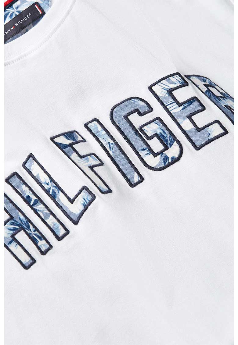 Een wit Tommy Hilfiger T-Shirt, gemaakt van 100% katoen met een groot Hilfiger logo op de borst. Het shirt heeft korte mouwen en een ronde kraag. Door de regular fit valt het shirt losjes langs het lichaam.